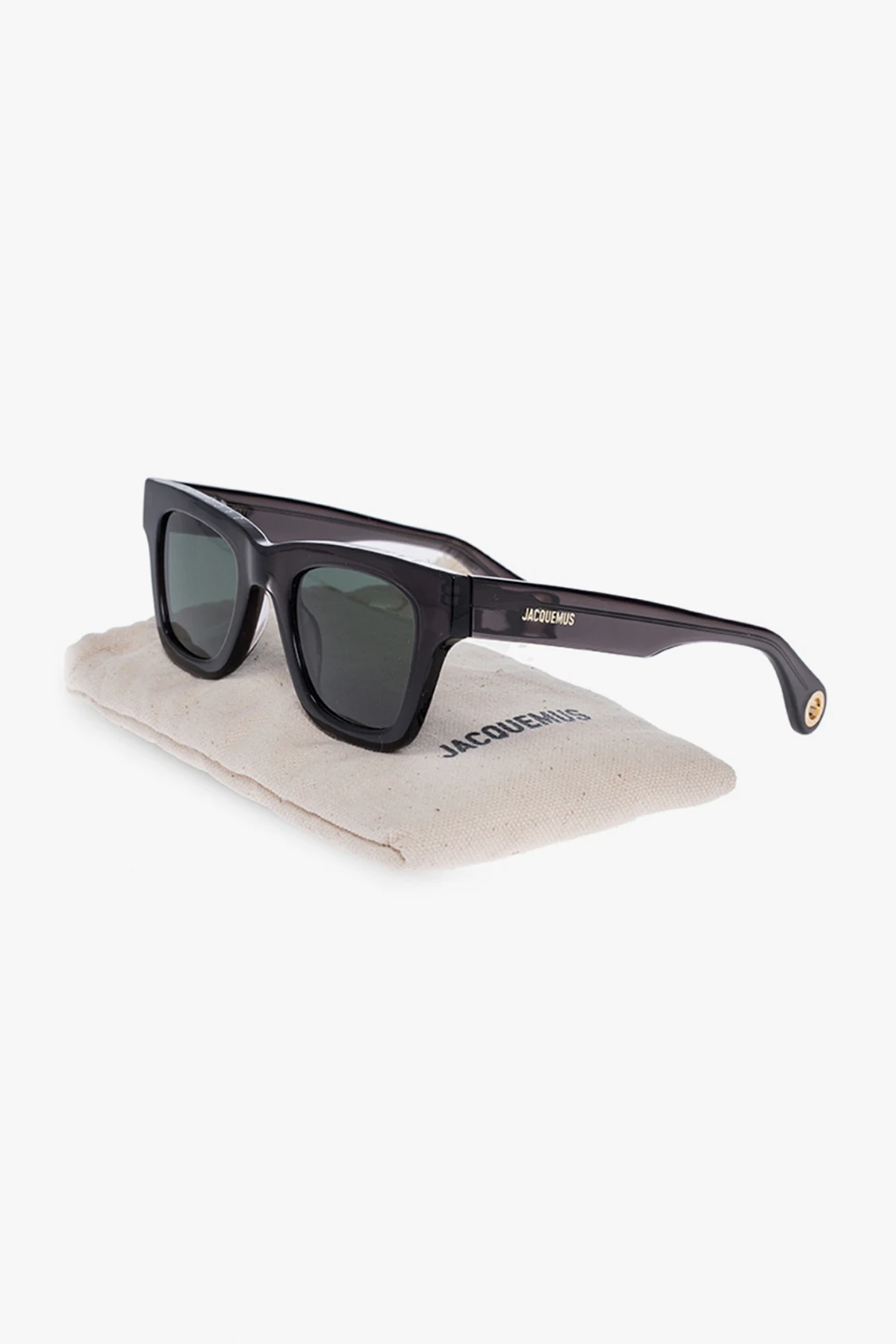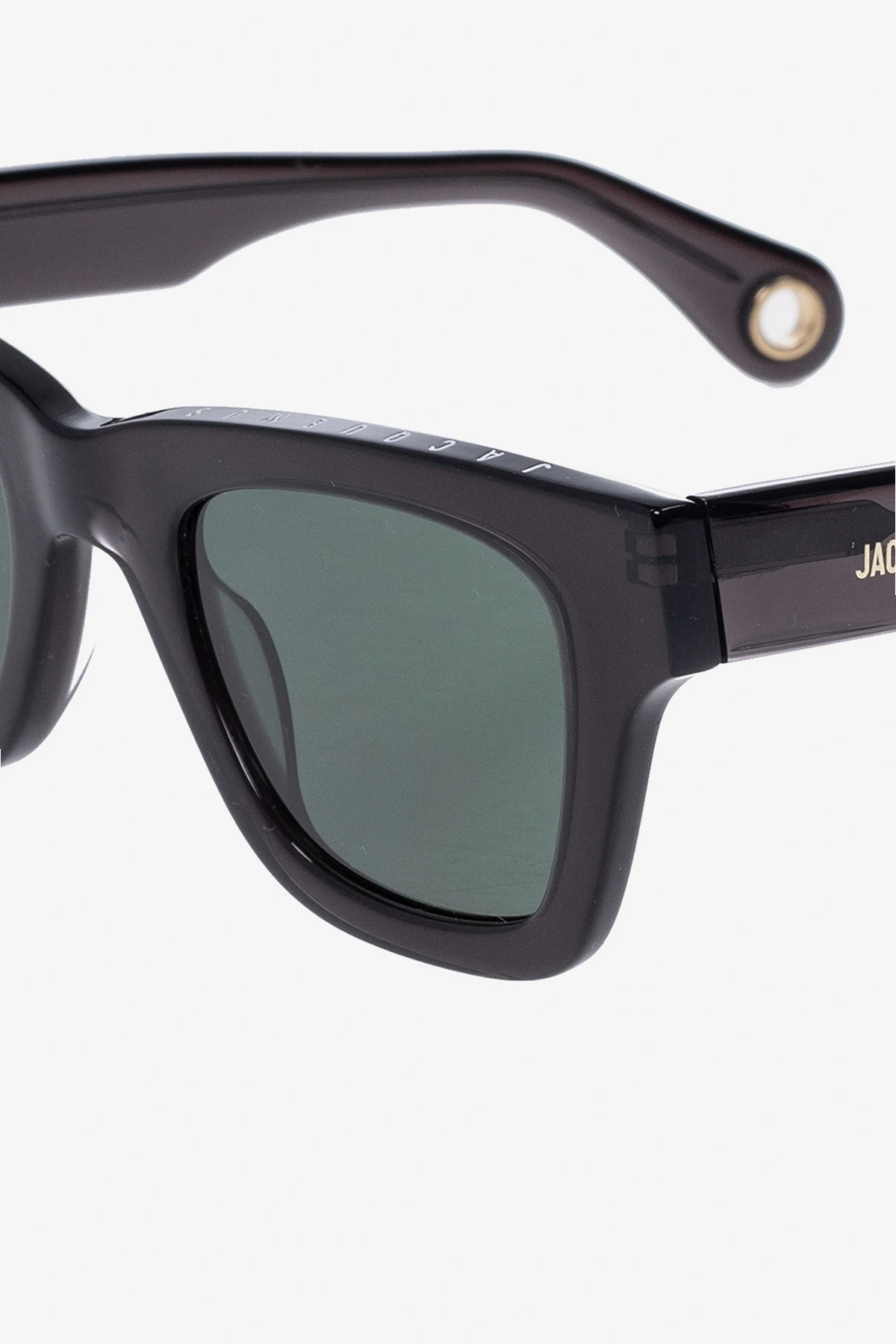 Czarne okulary przeciwsłoneczne, model ‘Nocio’ Jacquemus. Zauszniki oraz oprawki ozdobione logo w kolorze białym i złotym. Zauszniki zakończone okrągłym wycięciem umożliwiające dopięcie biżuterii. Zielone, certyfikowane soczewki 100% UVA/UVB. Dołączone etui.
