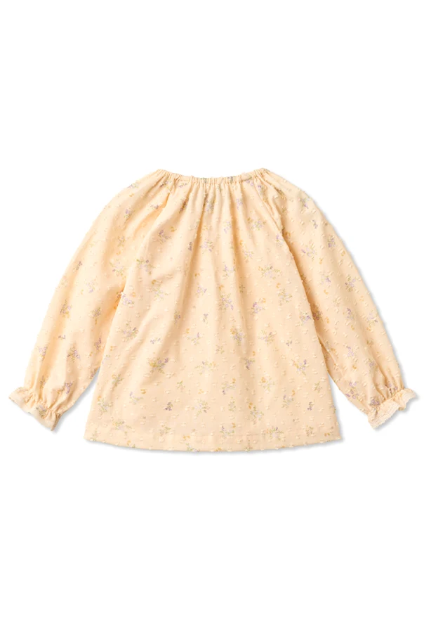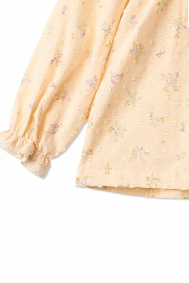 Jego luźny fason z długimi rękawami zakończonymi finezyjną falbanką oraz okrągły dekolt z funkcjonalną gumką zapewniają swobodę ruchów i ułatwiają codzienne użytkowanie. Pomarańczowe tło dopełniają subtelne, florystyczne motywy w odcieniach zieleni, fioletu i żółci; całość wzbogacają malownicze, wypukłe kropeczki na powierzchni, nadając wyjątkowej szlachetności.
