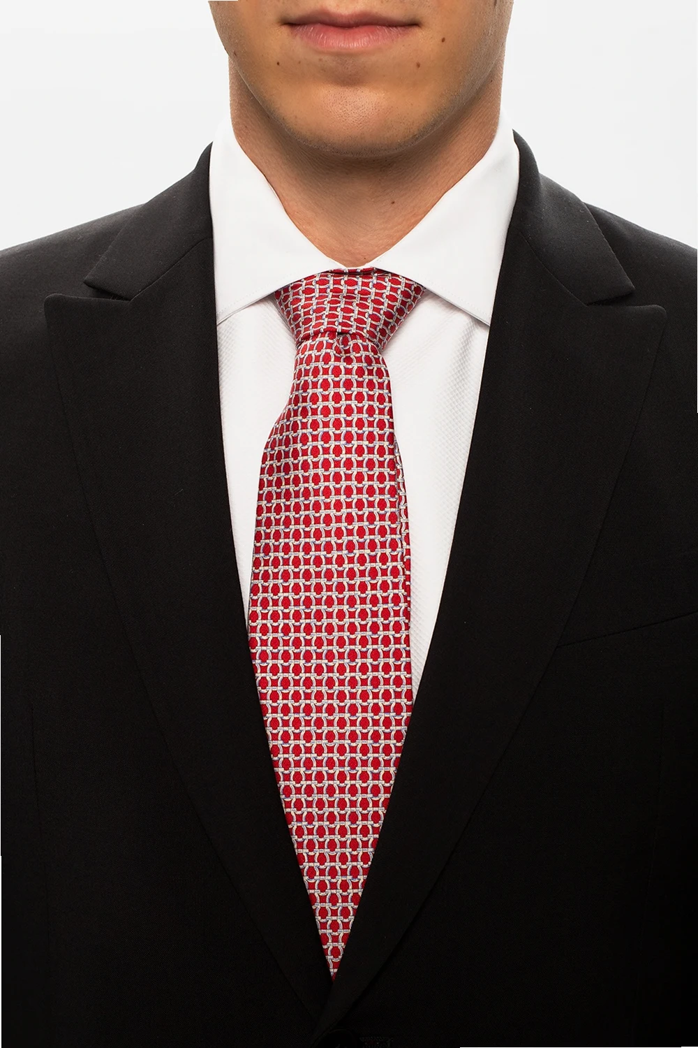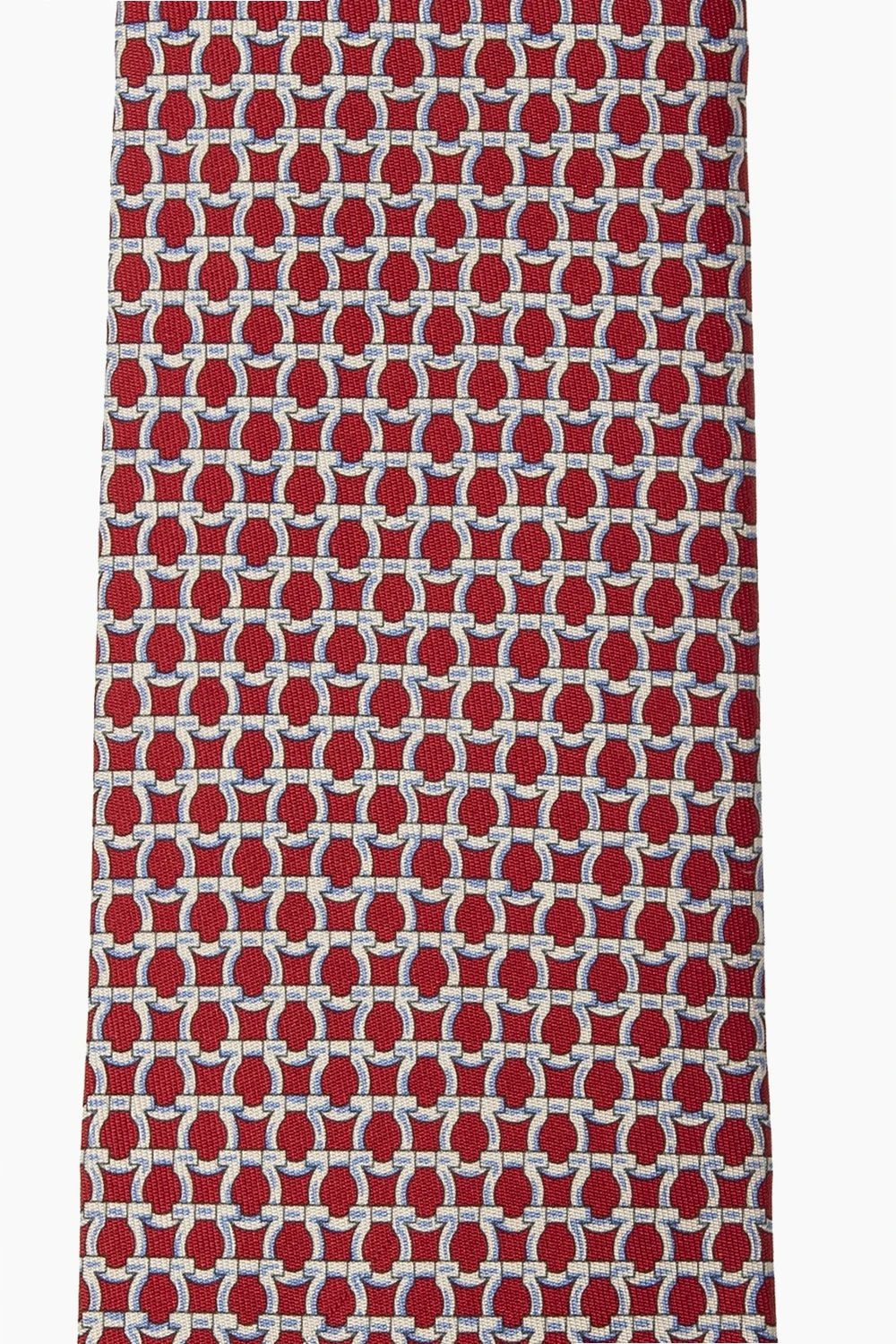 Czerwony, jedwabny krawat Salvatore Ferragamo. Ozdobiony nadrukowanym beżowo-niebieskim logo.