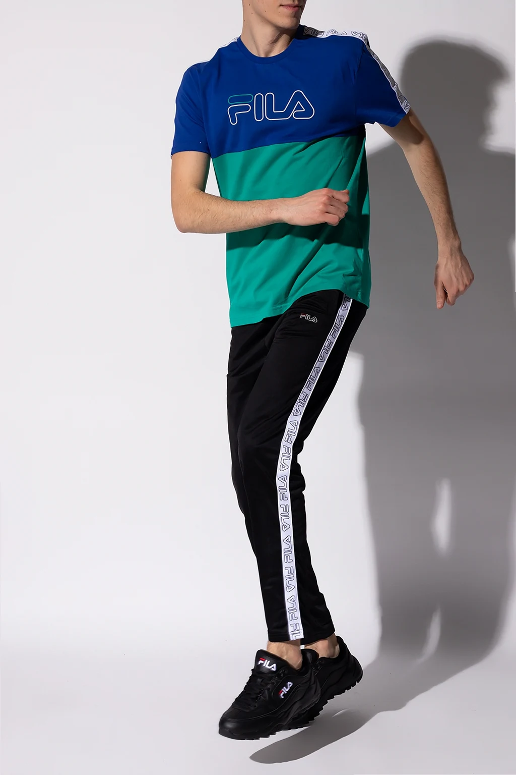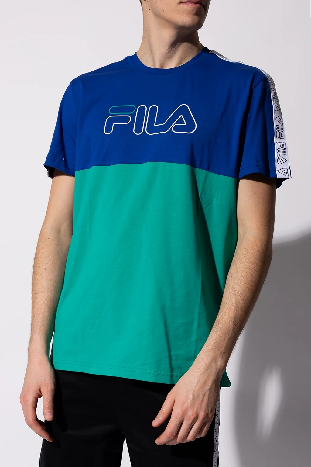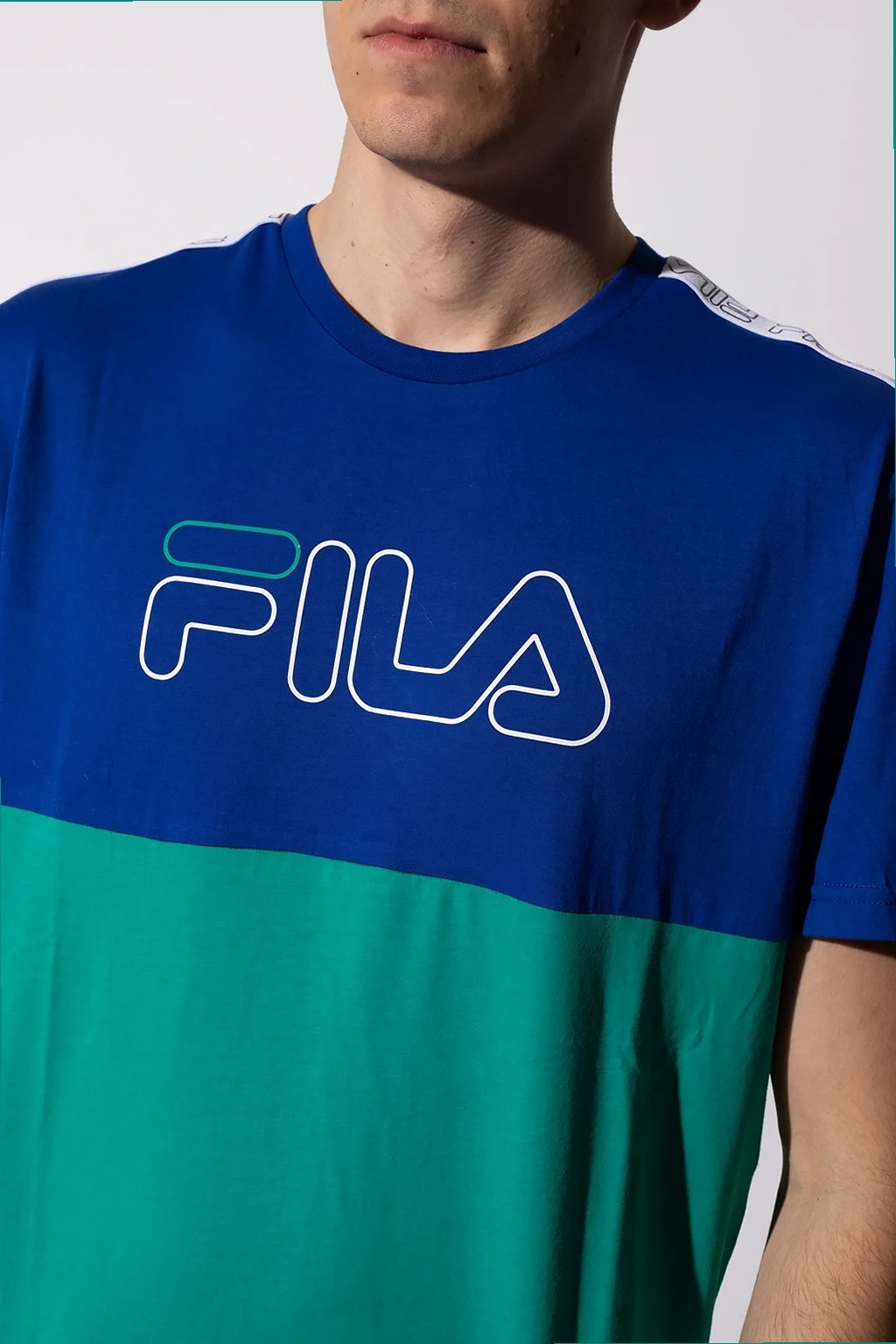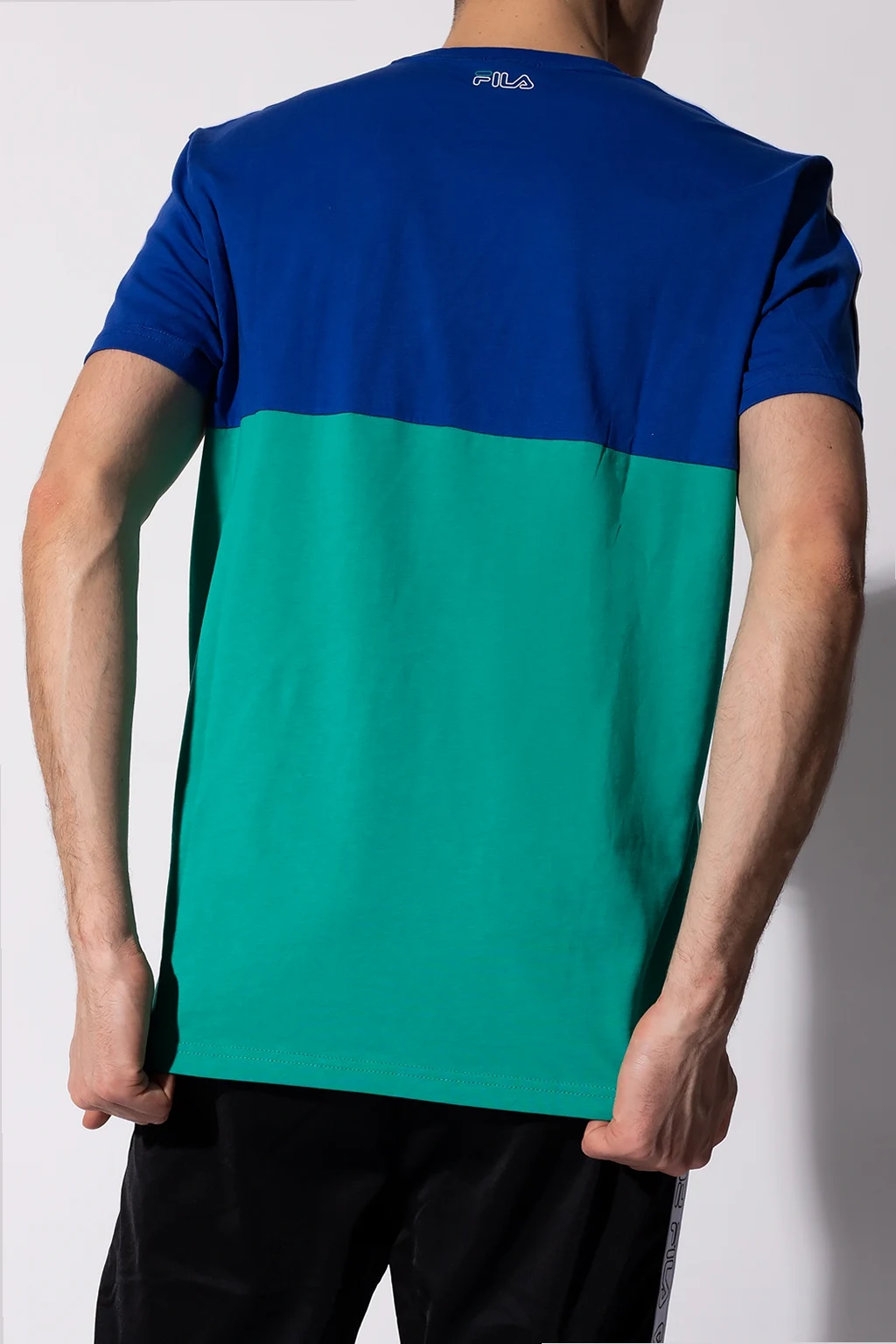 Niebiesko-zielony t-shirt Fila. Wykonany z bawełny. Nadruk z logo. Okrągły dekolt.
