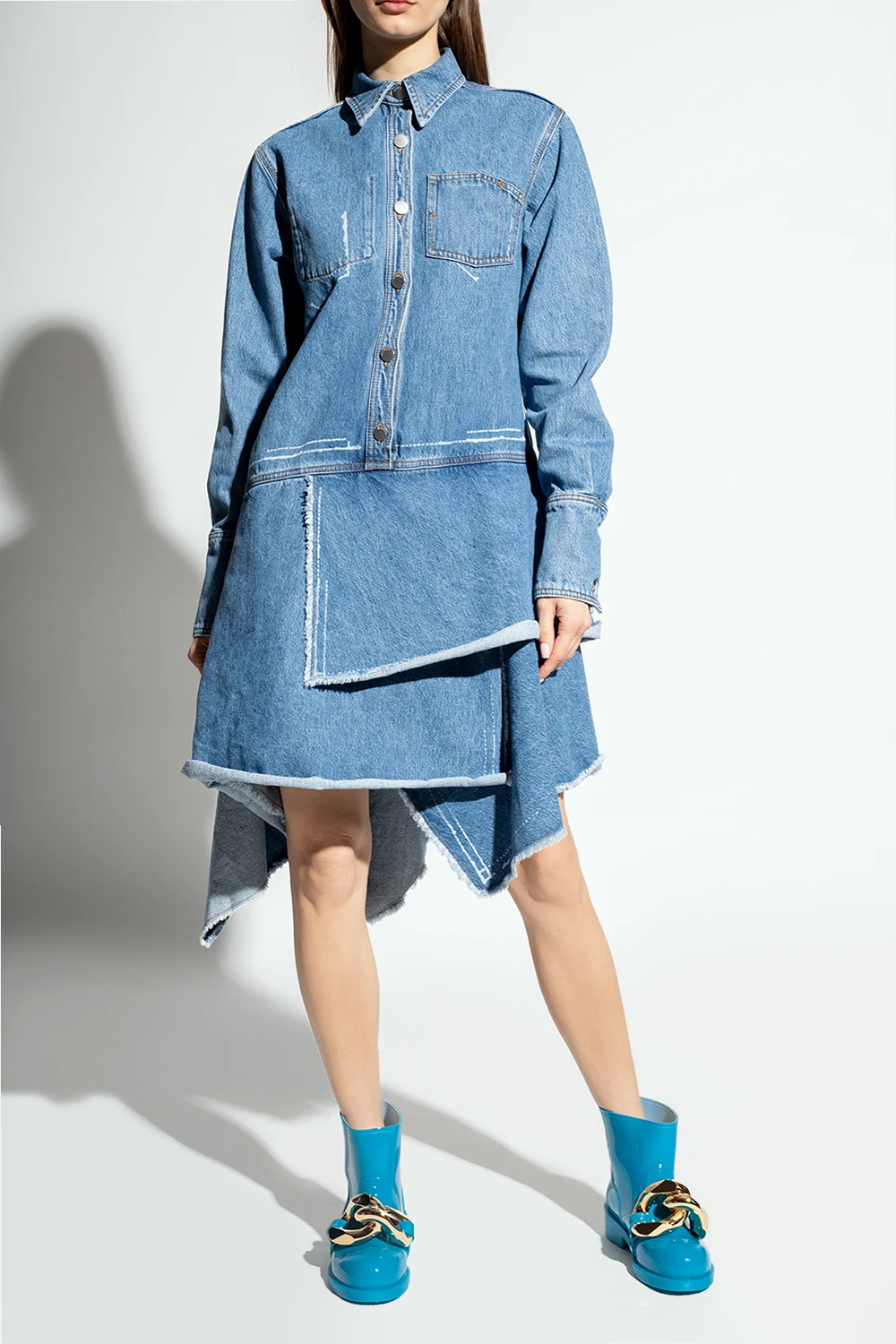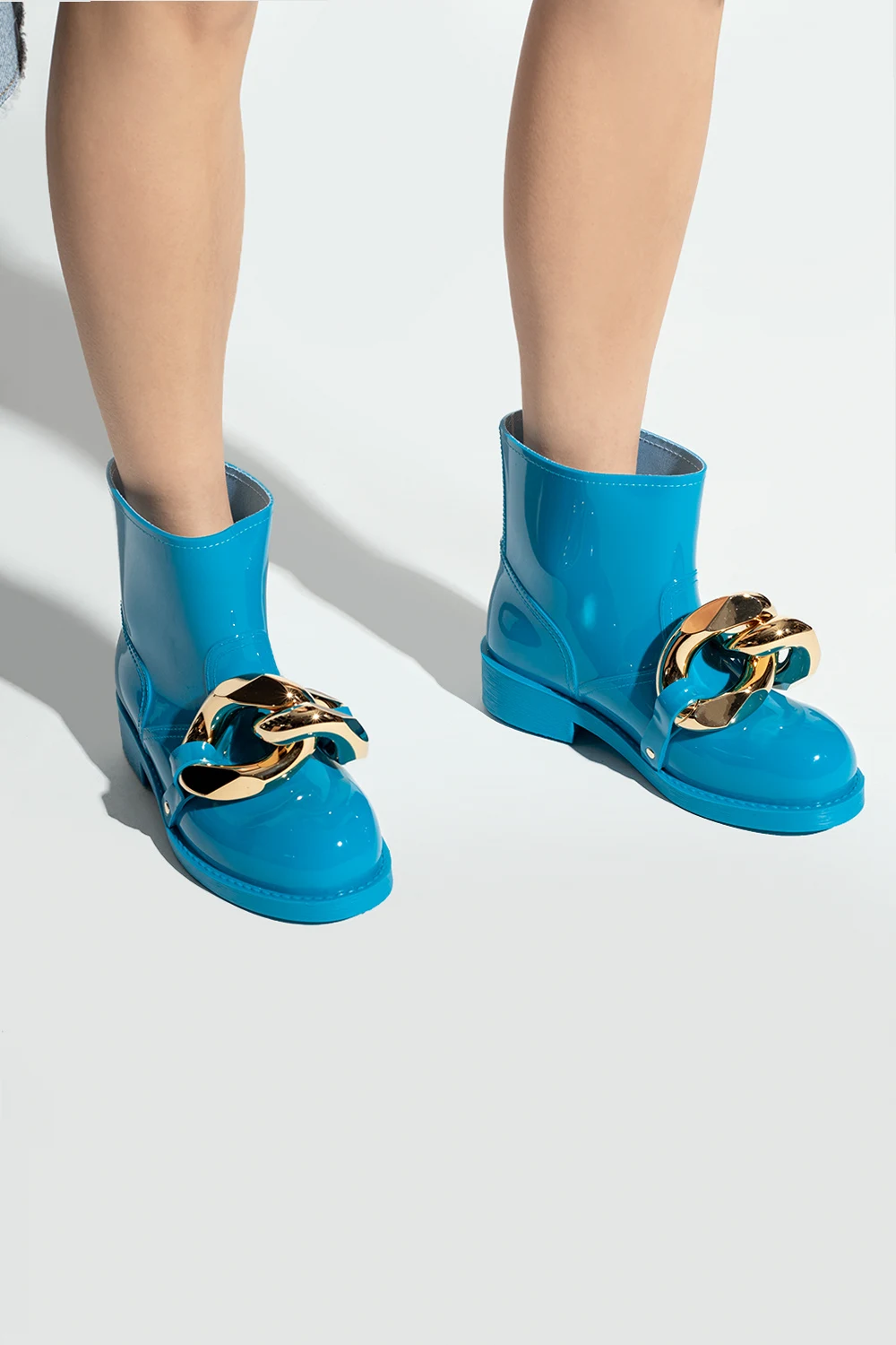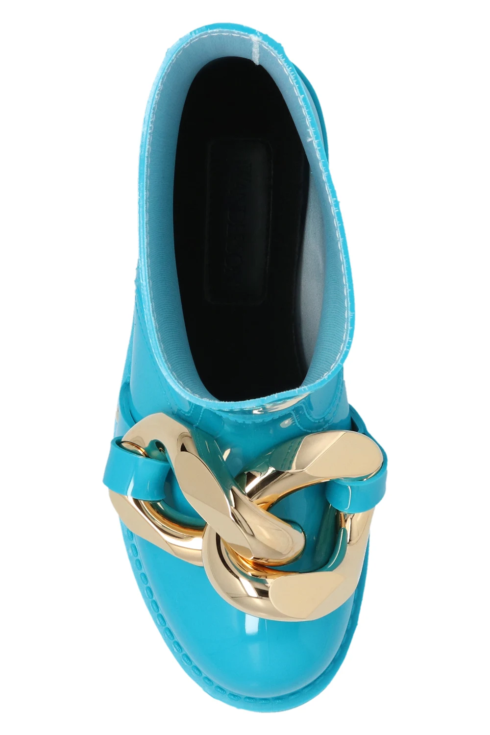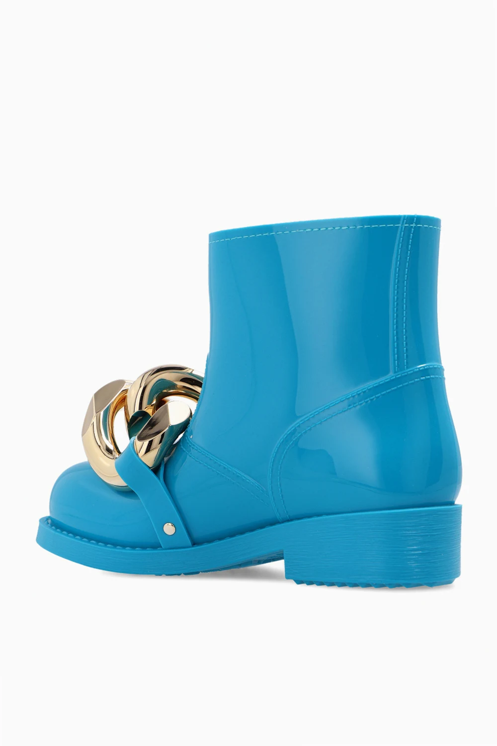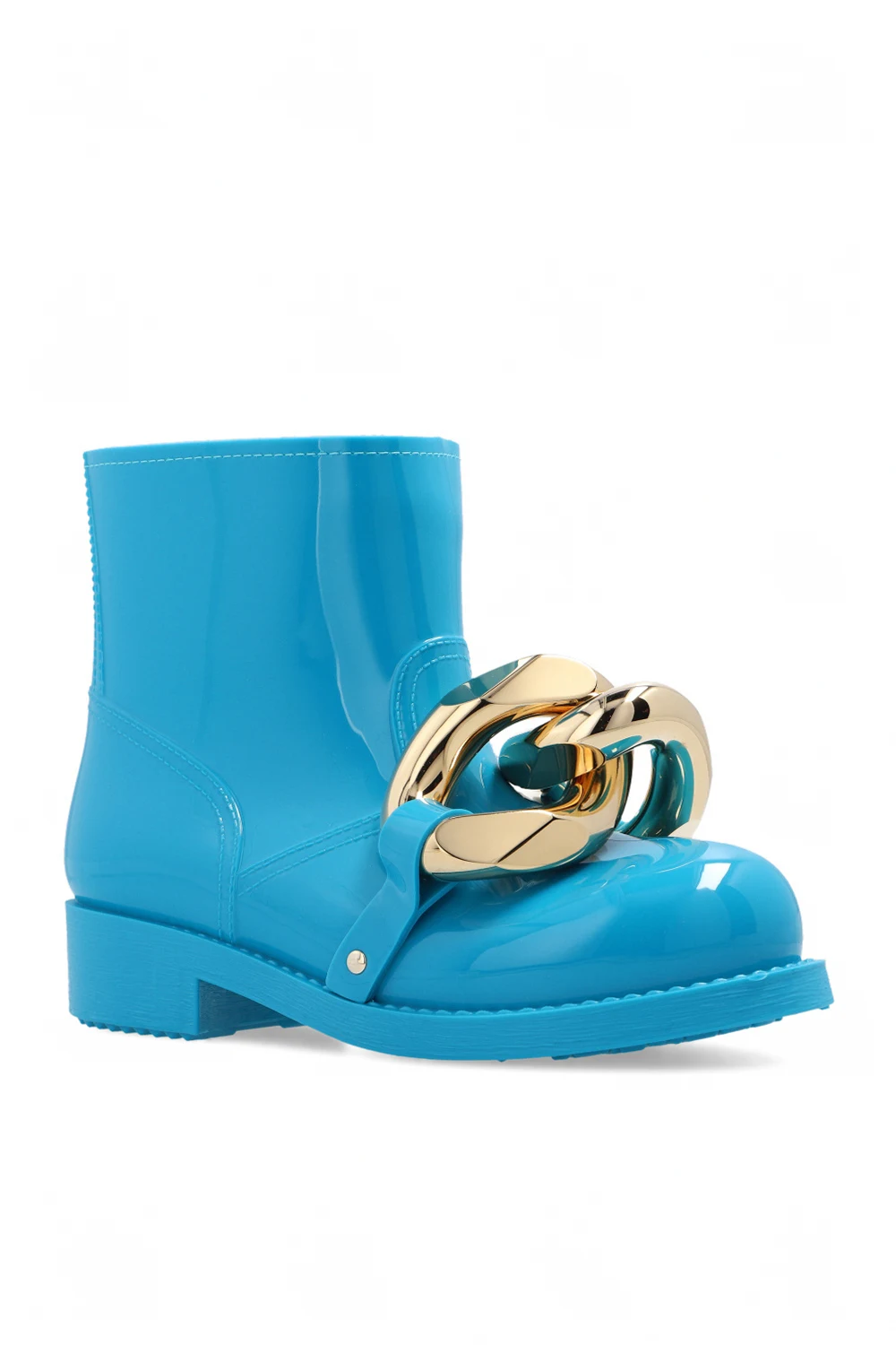 Niebieskie, krótkie kalosze JW Anderson. Z przodu metalowa aplikacja w kształcie ogniw łańcucha w kolorze złotym. Gumowa podeszwa w kolorze niebieskim.