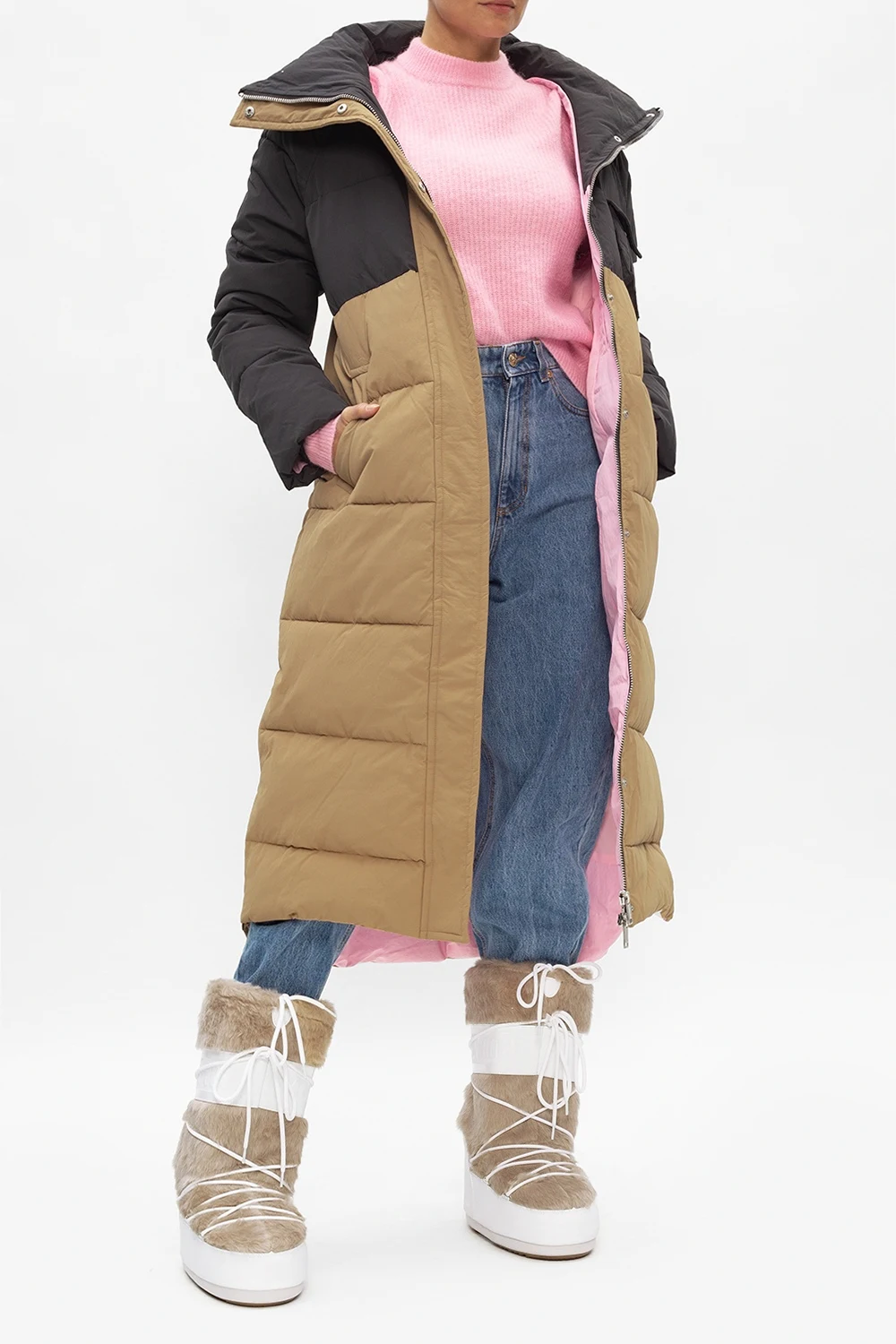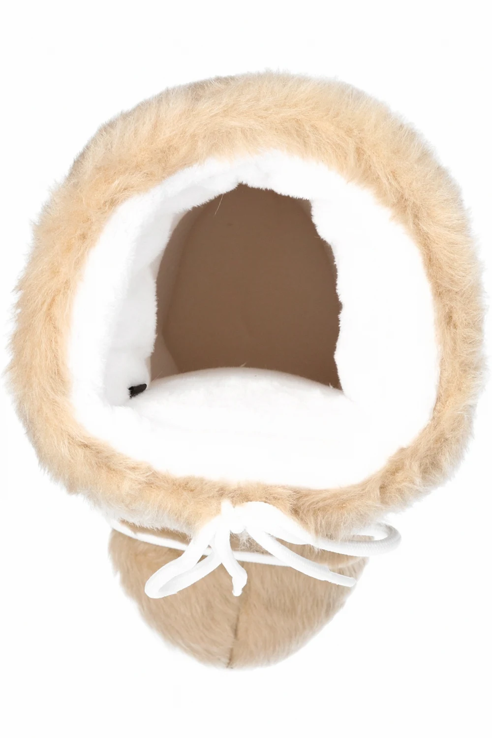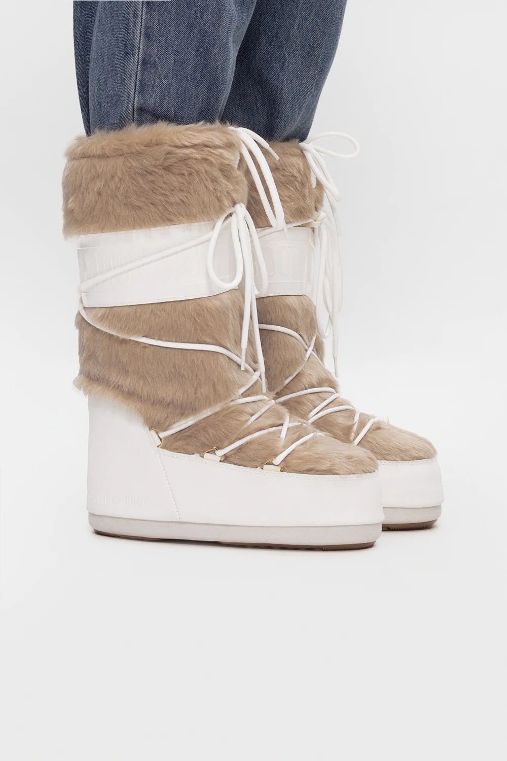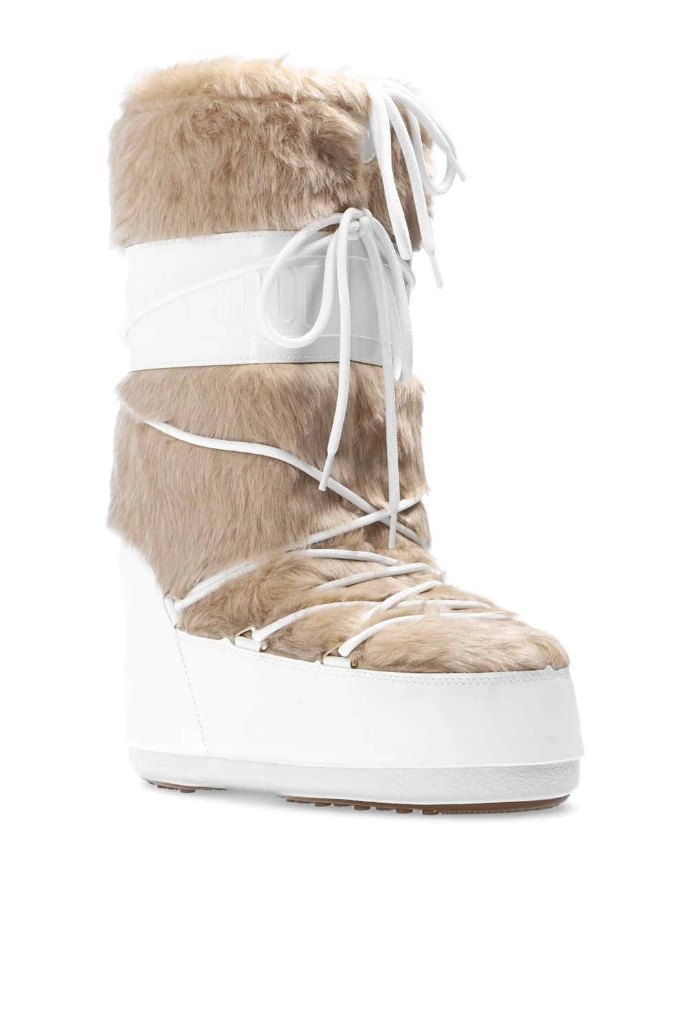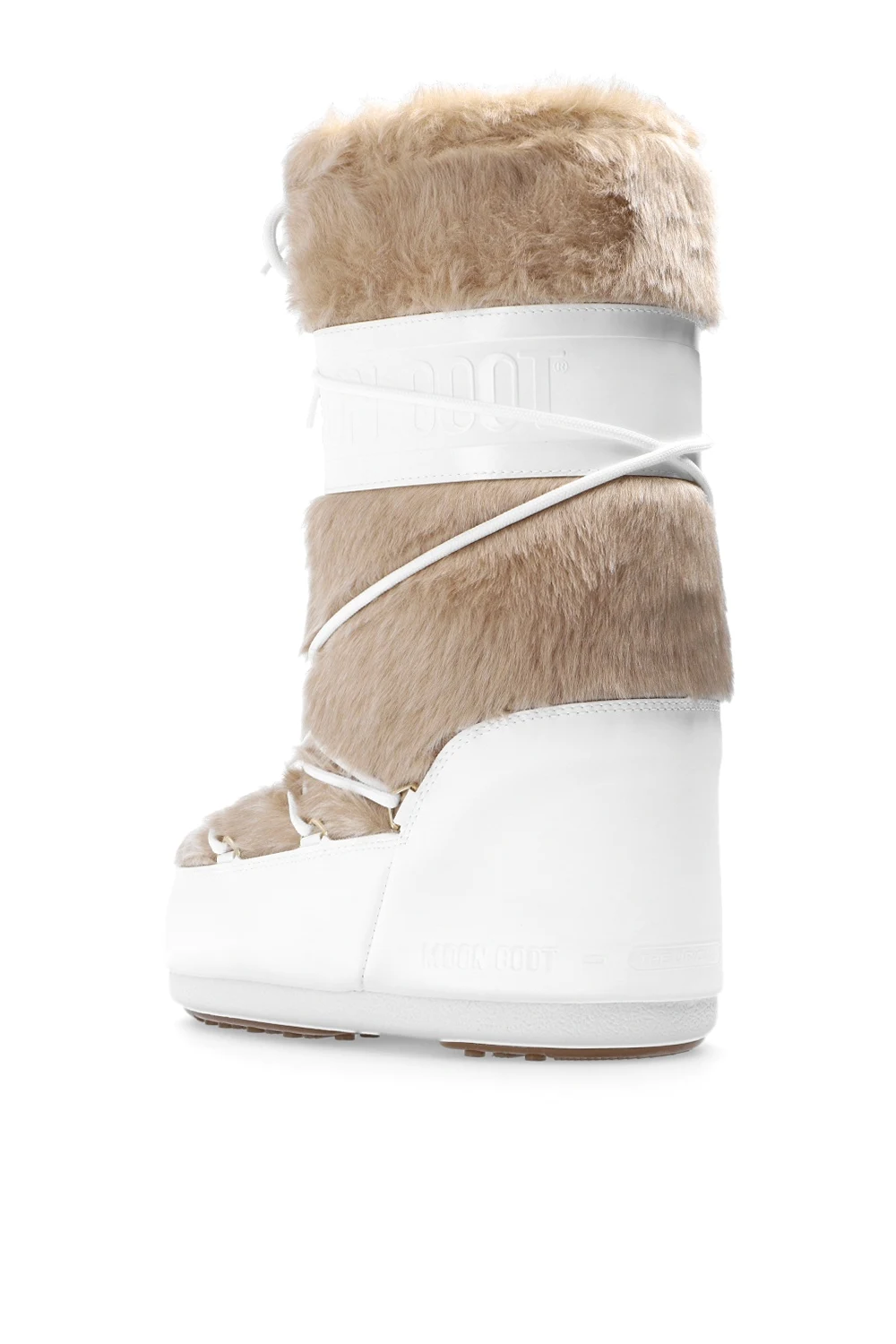 Białe, sznurowane śniegowce, model ‘Classic’ Moon Boot. Wykonane z materiału imitującego skórę. Wykończone sztucznym futrem w kolorze beżowym. Ozdobione wytłoczonym logo. Beżowo-biała, gumowa podeszwa.