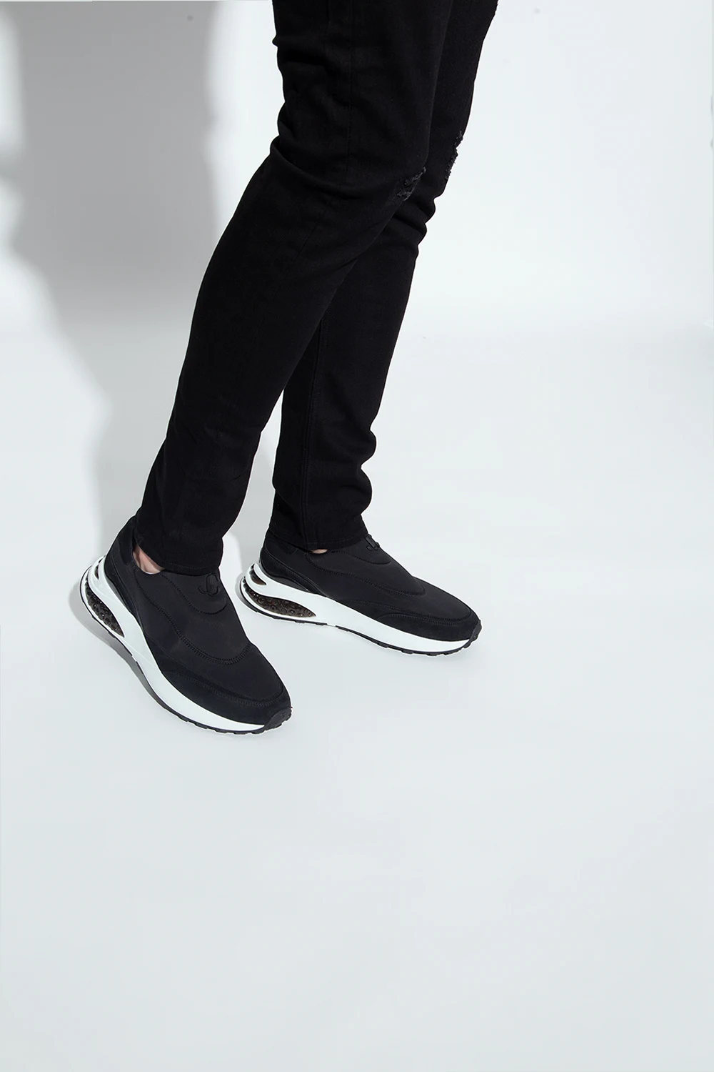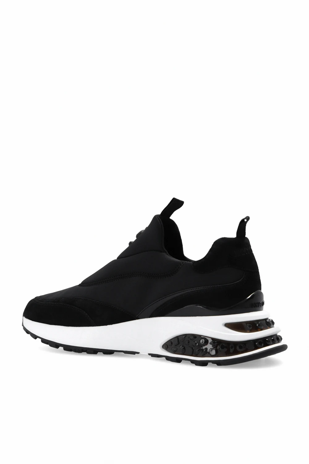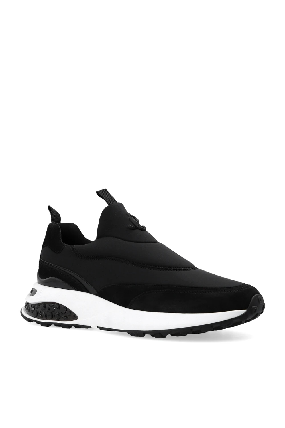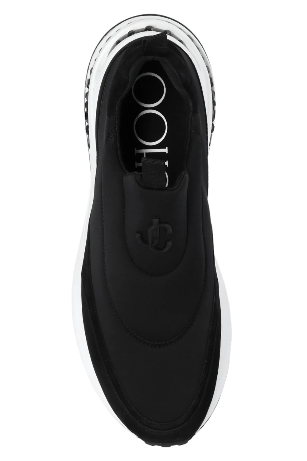 Czarne buty sportowe, model ‘Memphis’ Jimmy Choo. Wykonane z neoprenu. Wykończone zamszem. Metalowa aplikacja z logo w kolorze czarnym. Dekoracyjne przeszycia. Biało-czarna, gumowa podeszwa.