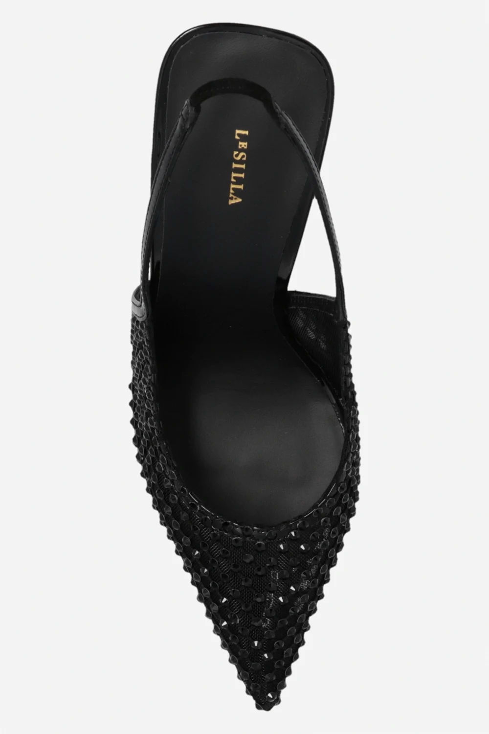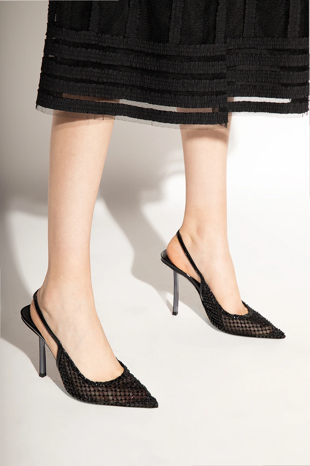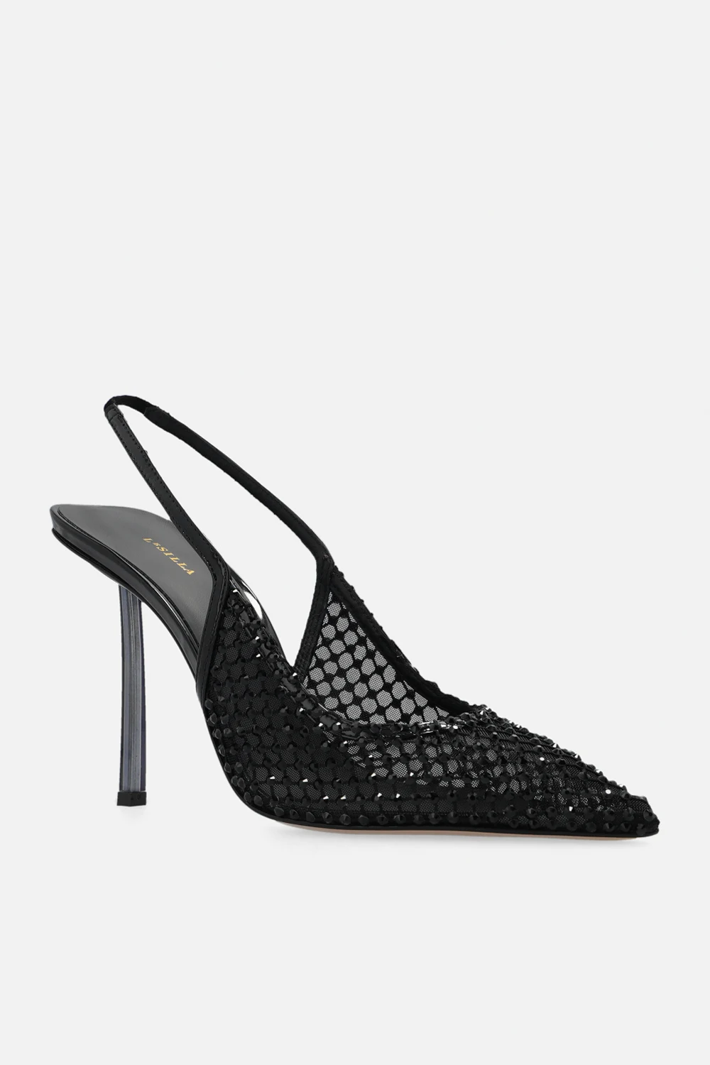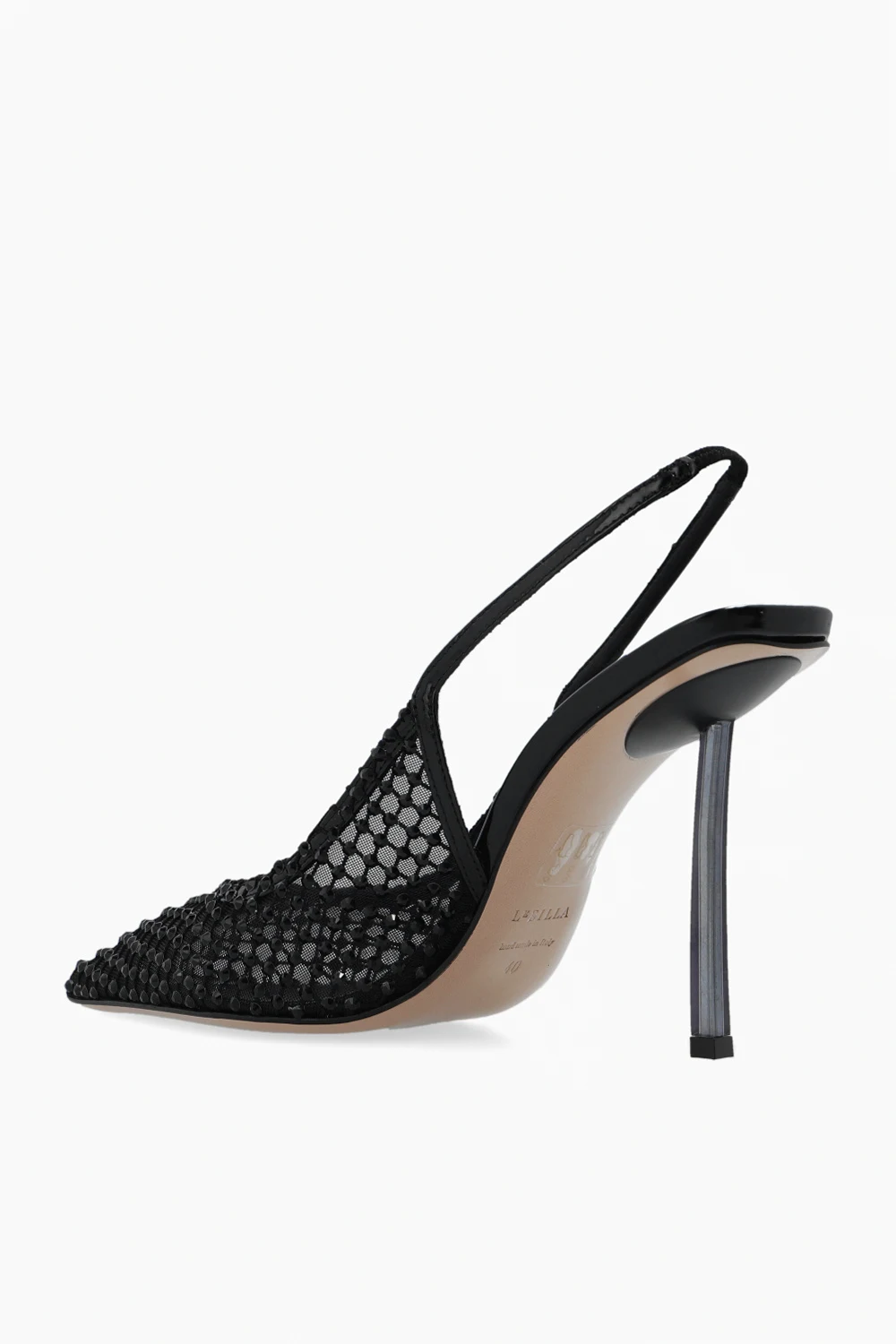 Czarne buty na obcasie, model ‘Gilda’ Le Silla. Wykonane z transparentnej sitaki wykończonej połyskującymi kryształami. Nosek w szpic. Odkryta pieta. Jasnobeżowa, skórzana podeszwa z gumowym wykończeniem.