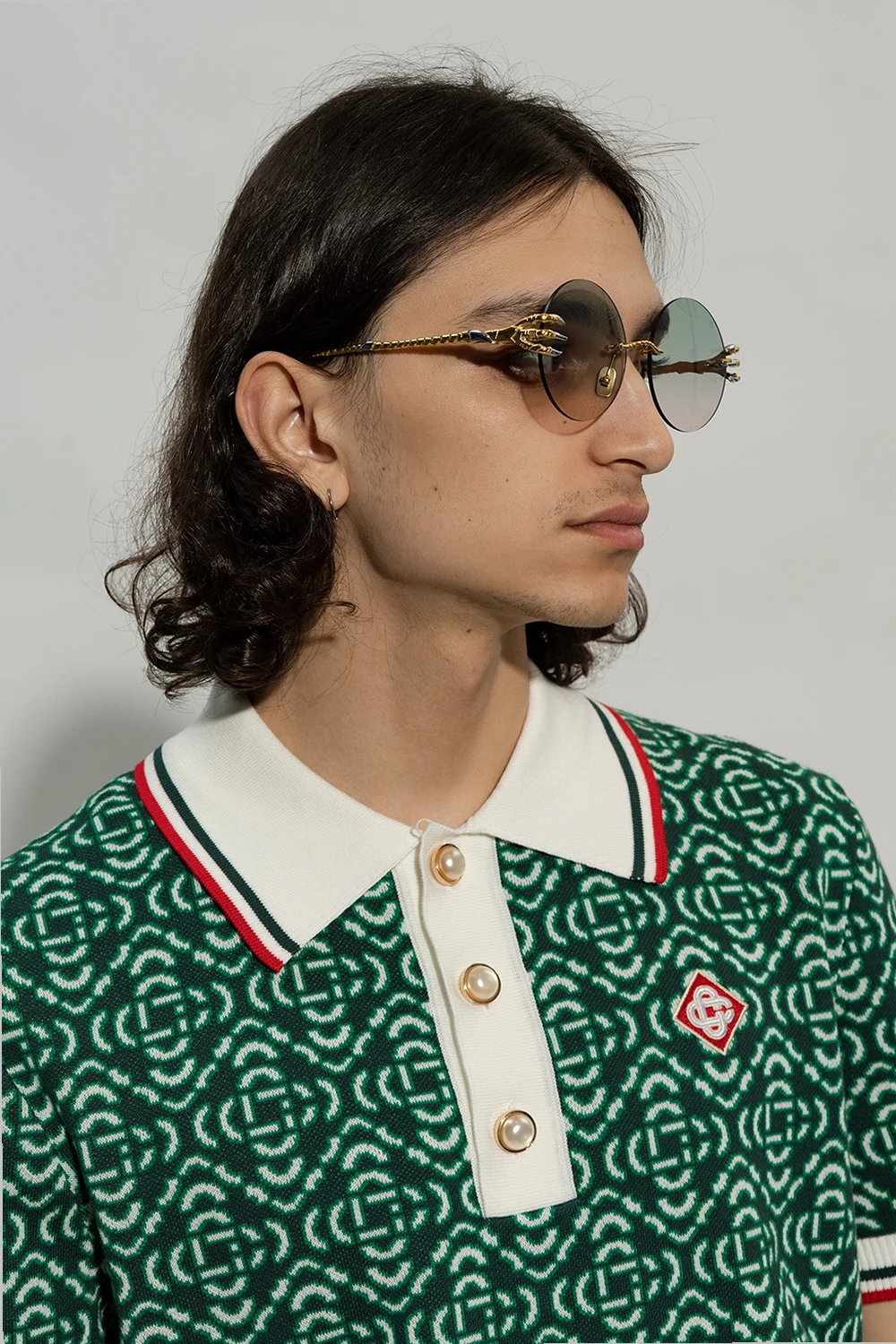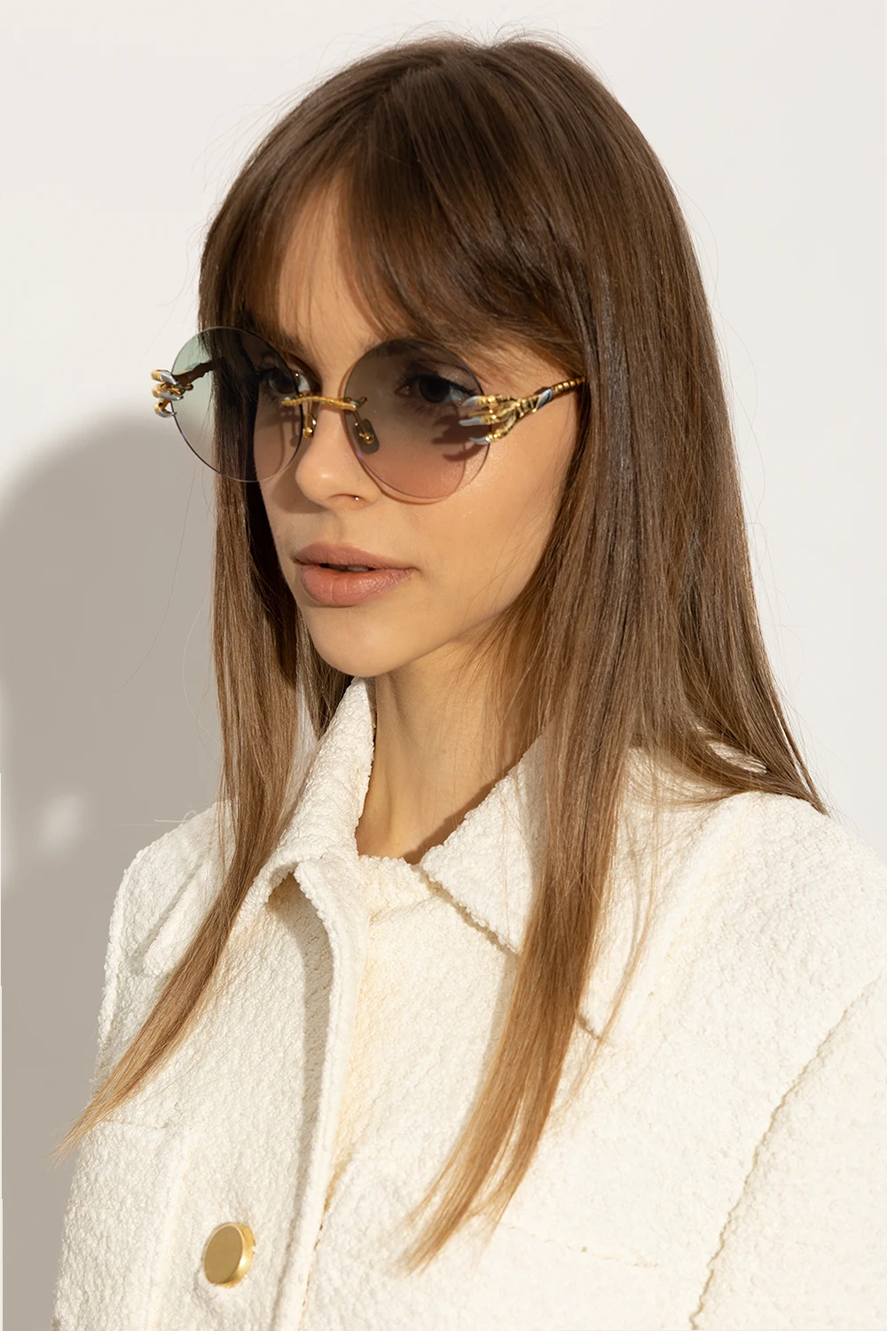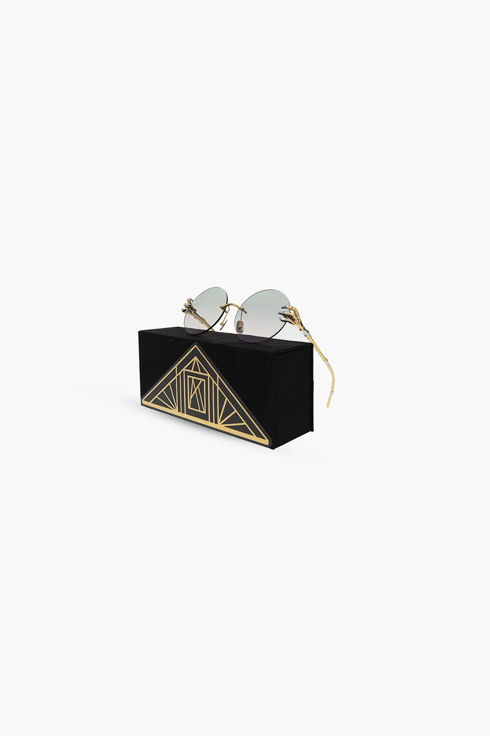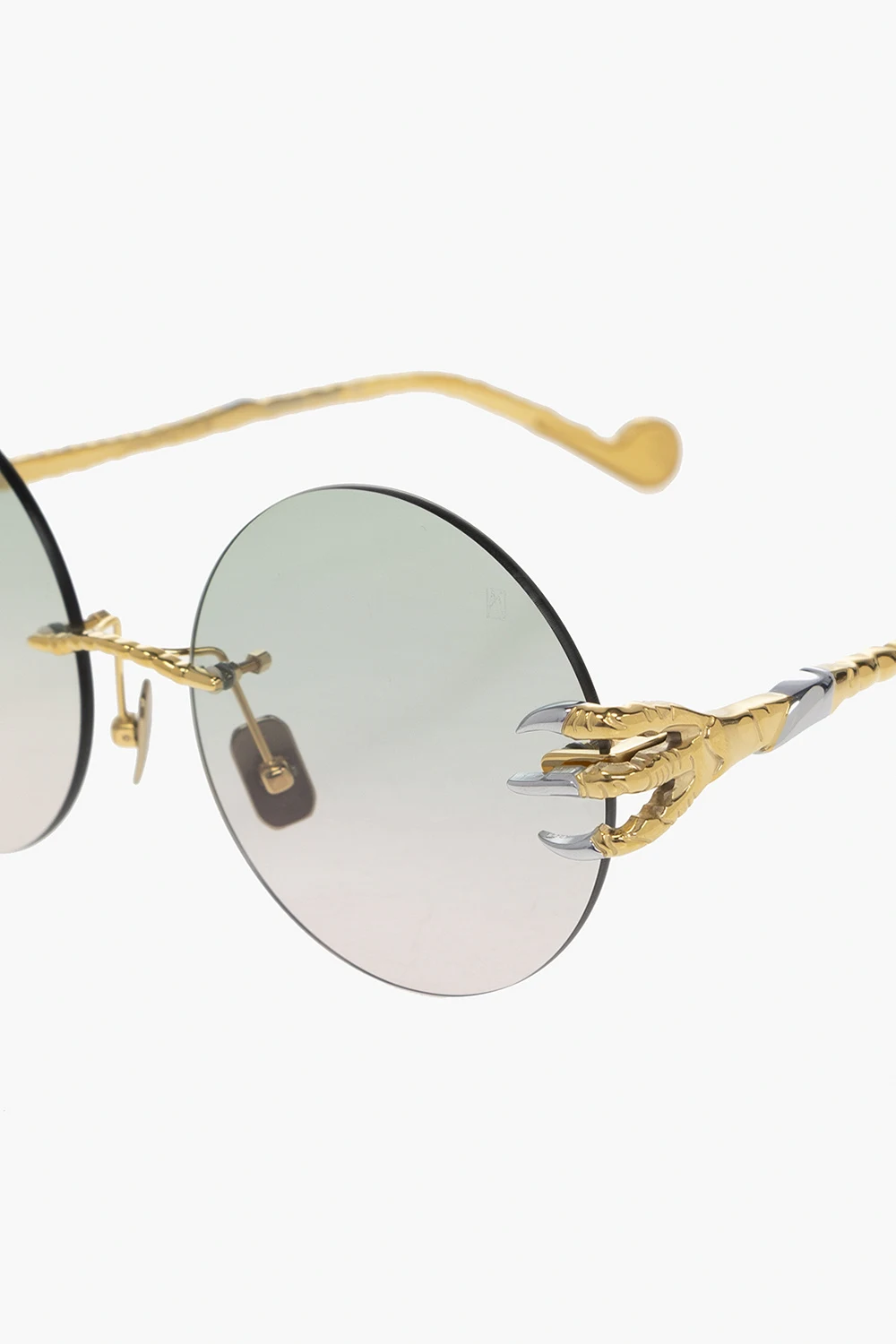 Okulary przeciwsłoneczne w kolorze złotym i srebrnym, model ‘The Claw & The Nest Round’ Anna Karin Karlsson. Wykonane ręcznie w Japonii. Dekoracyjna rama z tytanu pozłacanego 24-karatowym złotem. Pojedynczy, dekoracyjnie zakrzywiony mostek i regulowane noski ozdobione logo. Zauszniki z motywem pazurów. Gradientowe, okrągłe szkła w kolorze zielono-beżowym z technologią Zeiss ze 100% ochroną przed promieniami UV oraz odblaskami. Produkt z kolekcji limitowanej, wyprodukowanej w ilości 90 sztuk na cały świat. Indywidualny numer produktu na zausznikach. Dołączone etui.