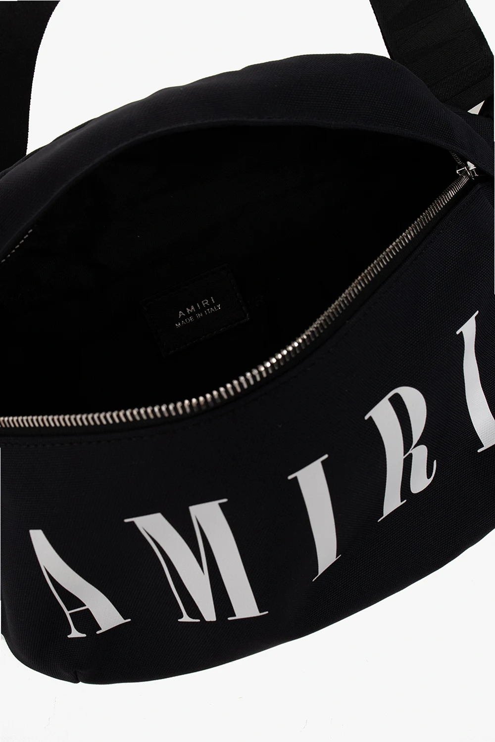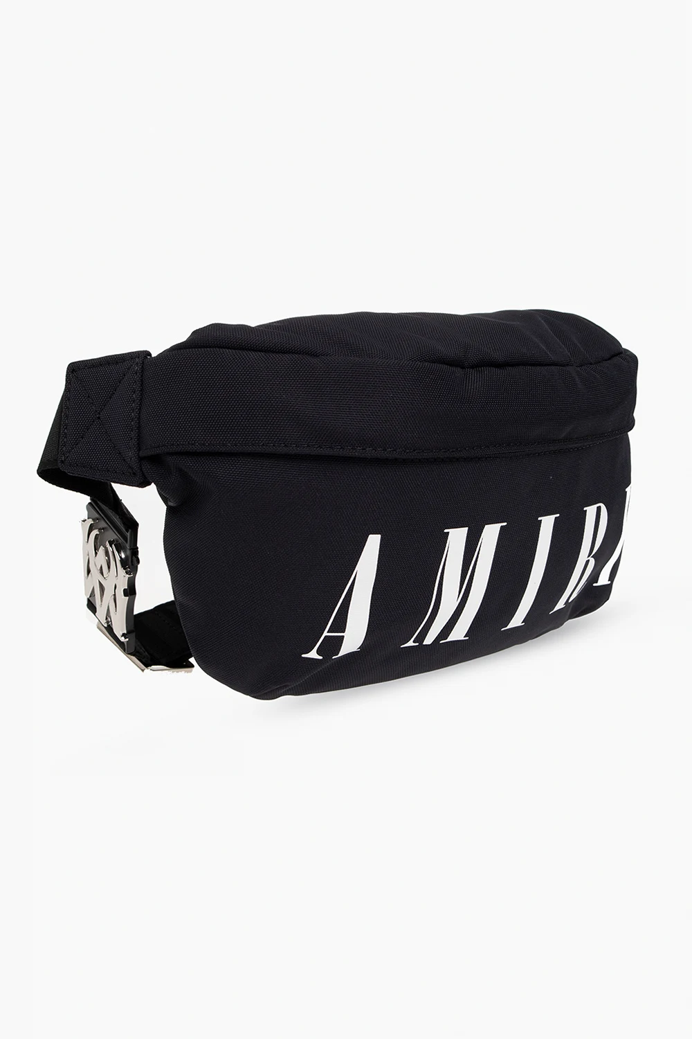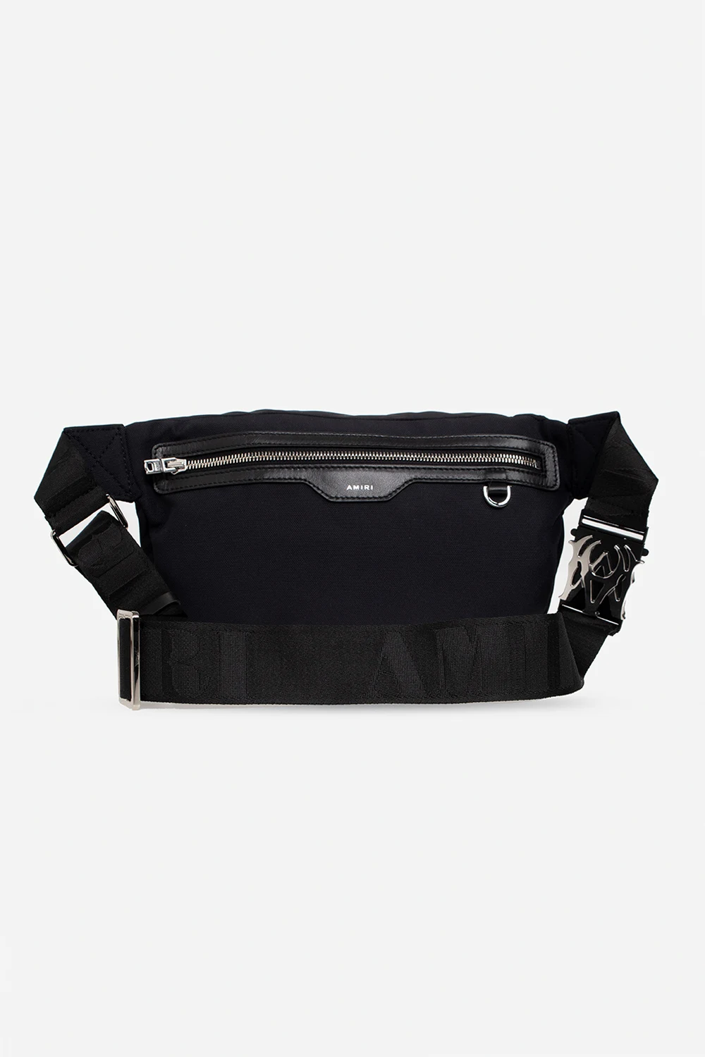 Czarna torba na pas Amiri. Zamykana na dwubiegunowy zamek. Ozdobiony nadrukiem z logo w kolorze białym. Z tyłu kieszeń zamykana na zamek. Pas biodrowy z możliwością regulacji długości. Wewnątrz komora. Metalowe wykończenie w kolorze srebrnym.