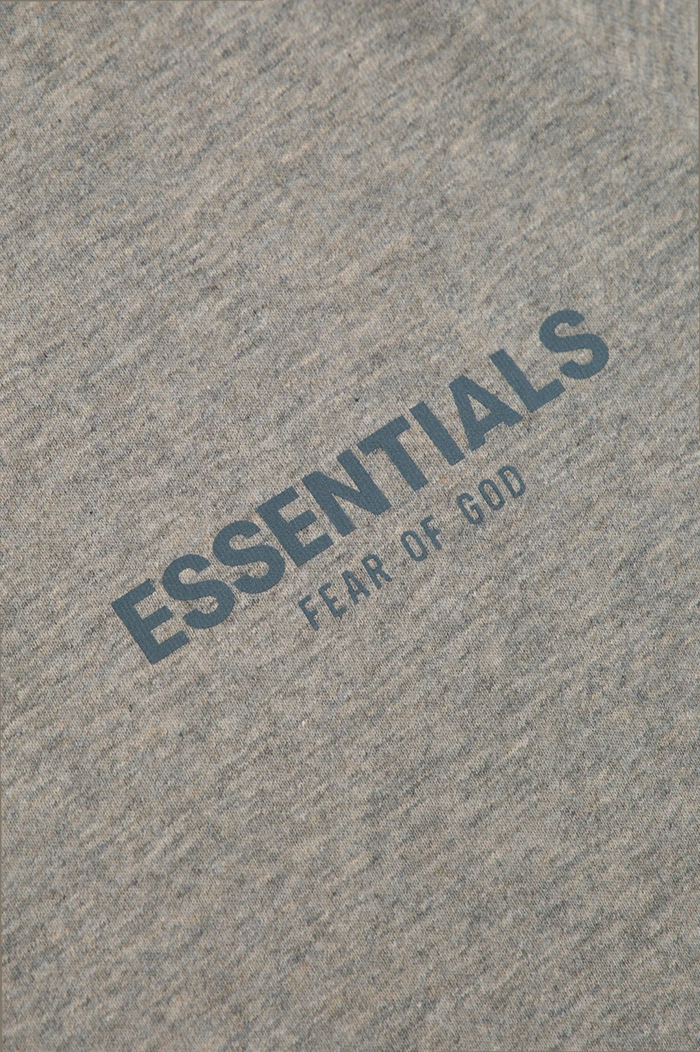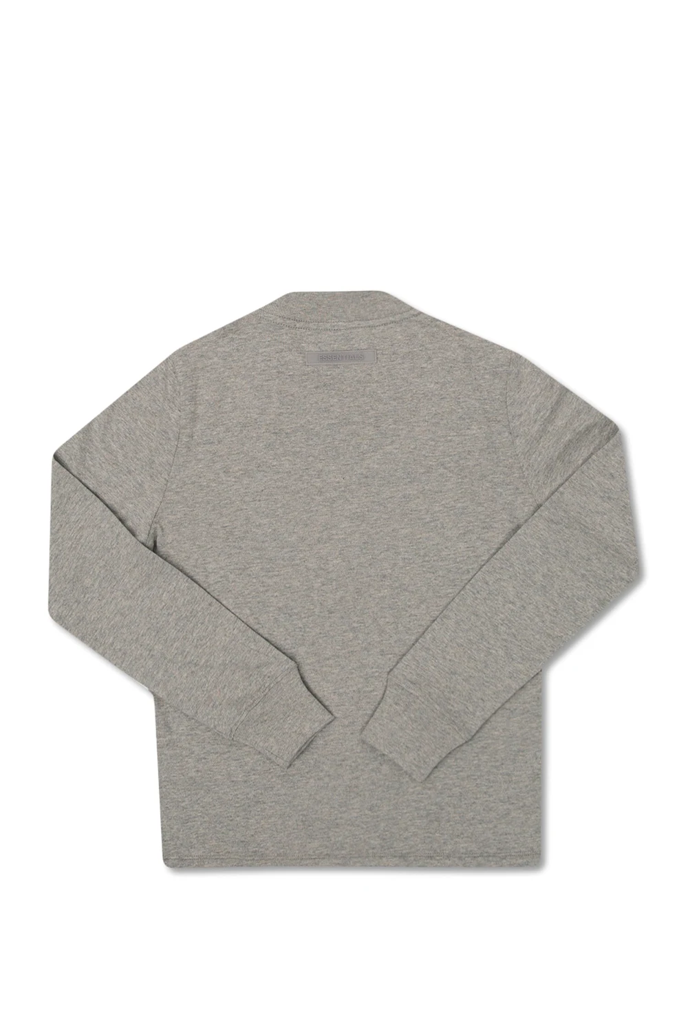 Szary t-shirt Fear Of God Essentials Kids. Wykonany z bawełny. Ozdobiony nadrukiem w kolorze ciemnoszarym. Z tyłu aplikacja z logo. Okrągły dekolt i długie rękawy wykończone ściągaczem.