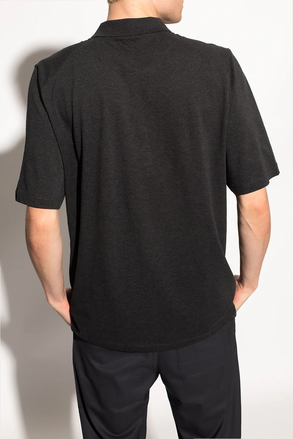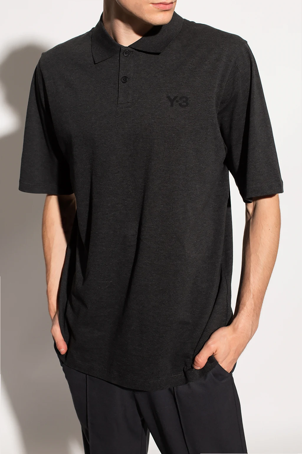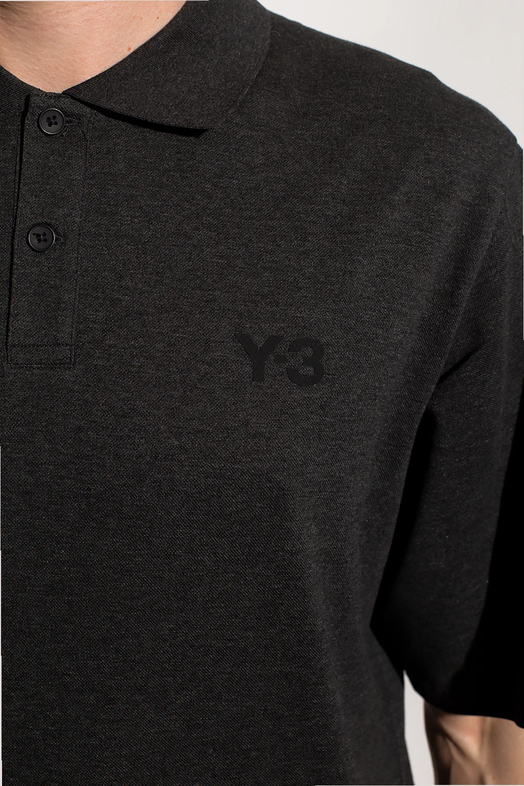 Ciemnoszare polo Y-3 Yohji Yamamoto. Wykonane z bawełny. Ozdobione nadrukowanym wzorem z logo w kolorze czarnym. Zapinane na guziki. Krótkie rękawy.