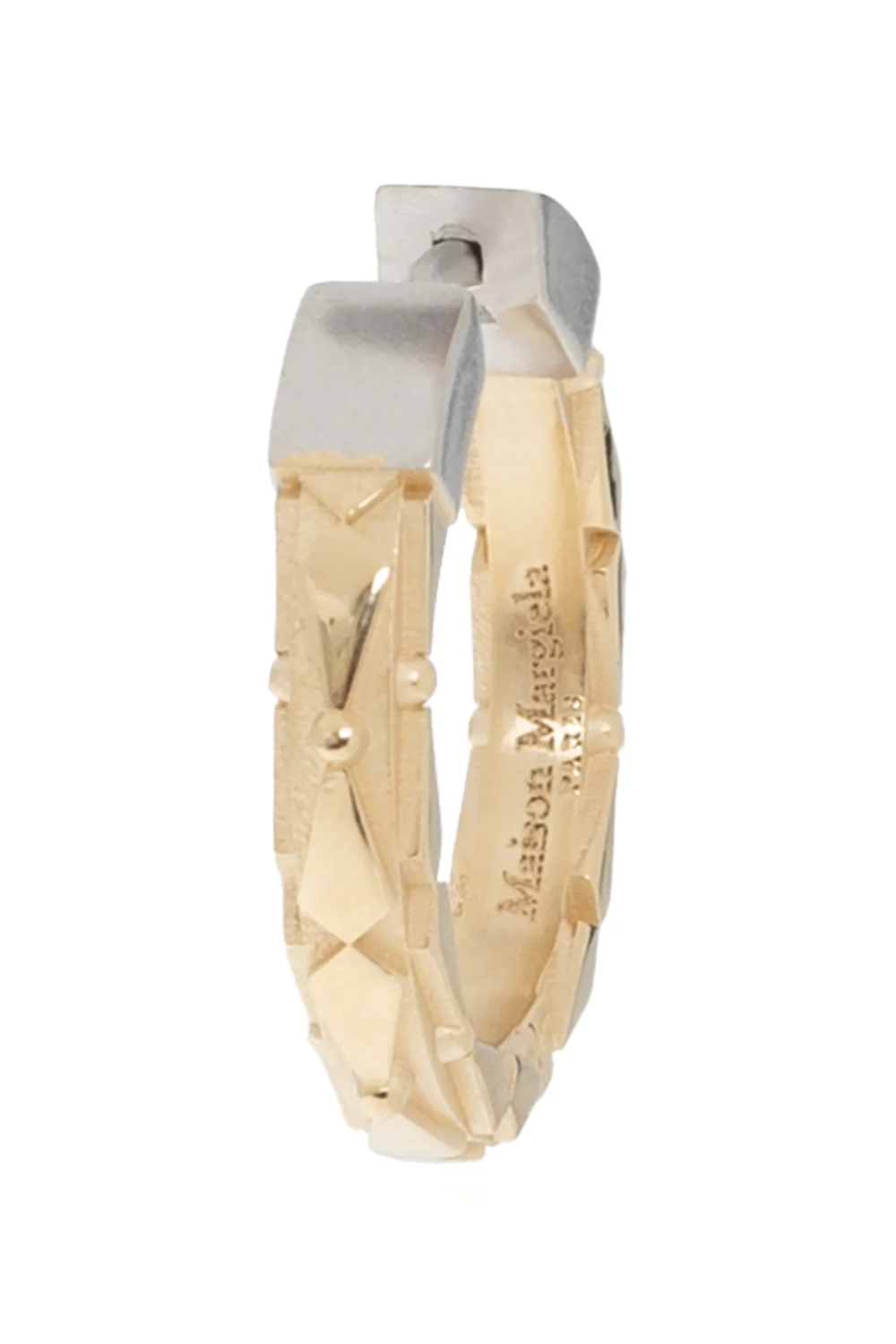 Mosiężny kolczyk w kolorze biało-złotym Maison Margiela. Ozdobiony wygrawerowanym logo.