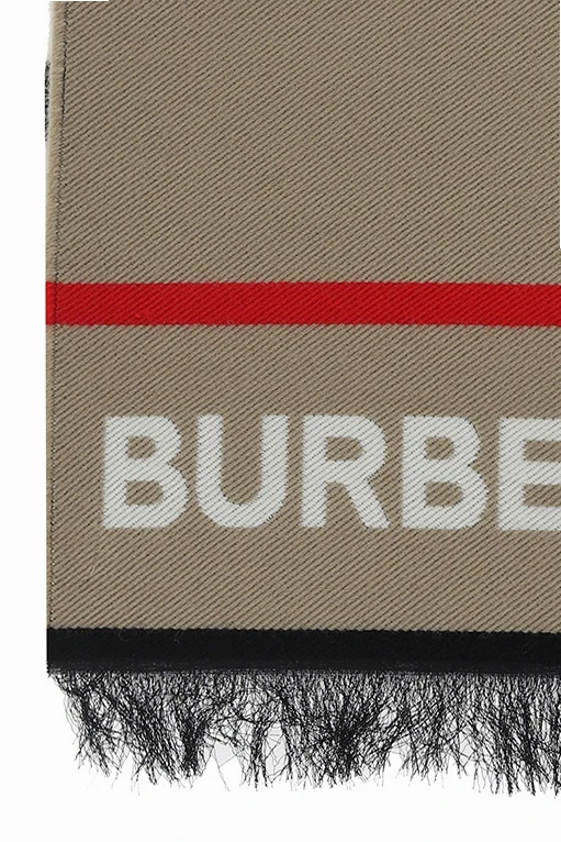 Beżowy szal Burberry Kids. Wykonany z wełny z domieszką bawełny. Ozdobiony wyszytym logo i wzorem w kolorowe pasy. Dwa brzegi zakończone frędzlami.