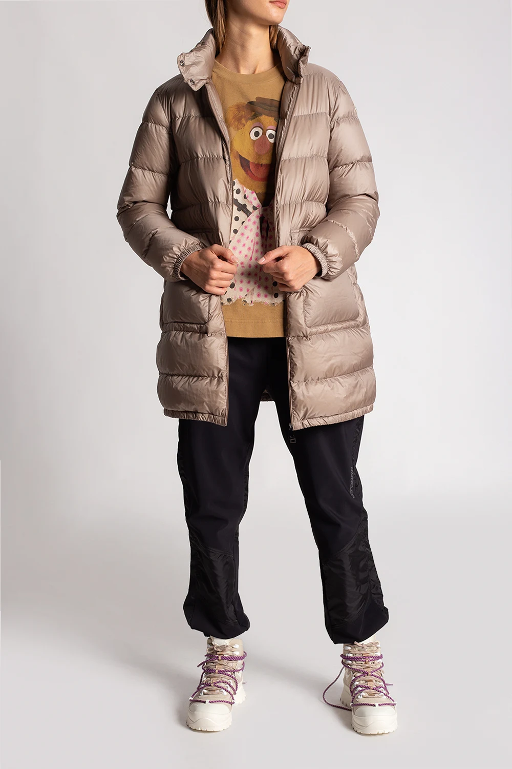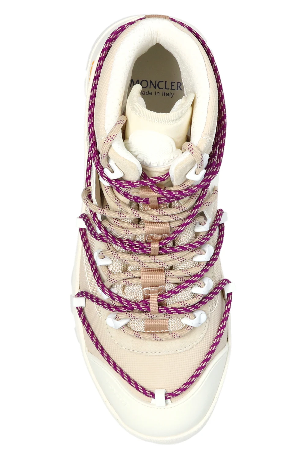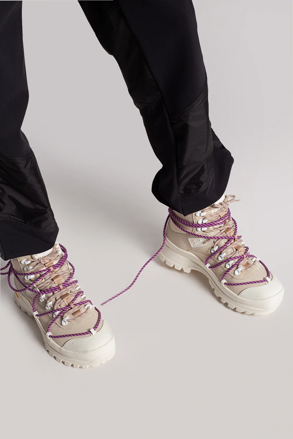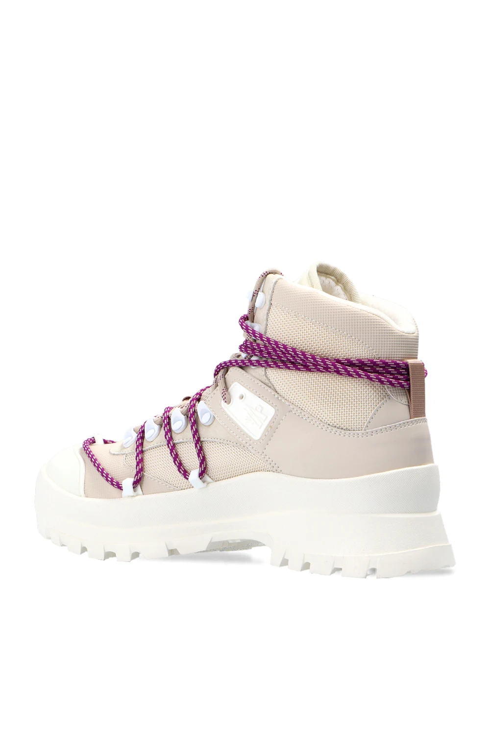 Beżowe, sznurowane trapery, model ‘Glacier’ Moncler. Wykończone zamszem. Na języku gumowa aplikacja z logo. Podwójne sznurowanie. Kremowa, gumowa podeszwa z technologią Vibram stosowaną w butach górskich.