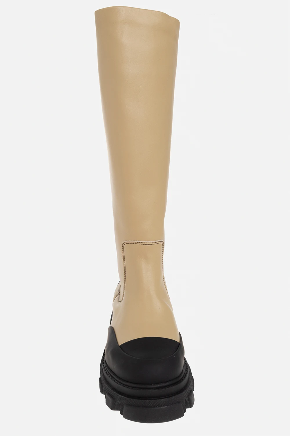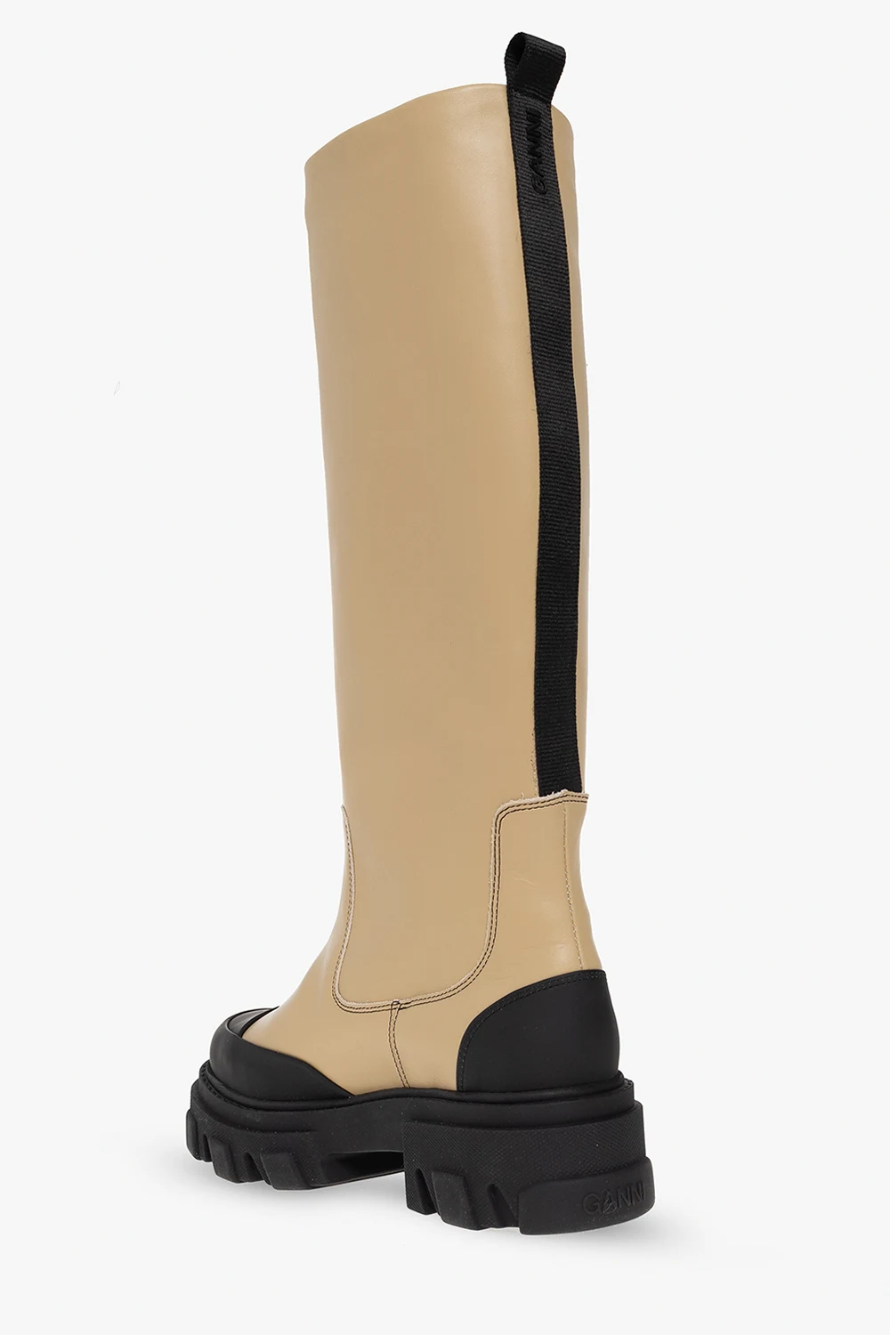 Beżowo-czarne kozaki Ganni. Wykonane ze skóry cielęcej. Z tyłu czarny rypsowy pas ozdobiony nadrukiem z logo. Czarna, gumowa podeszwa.