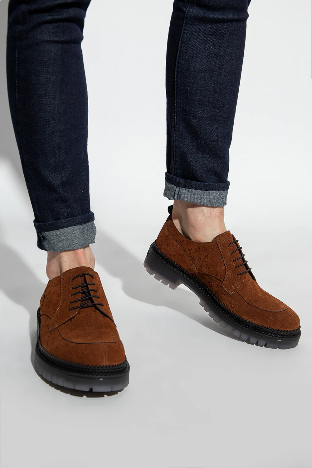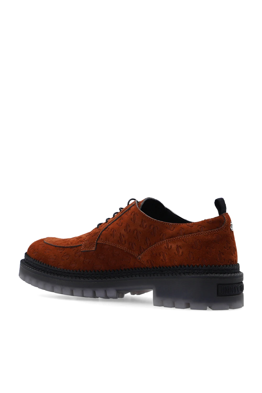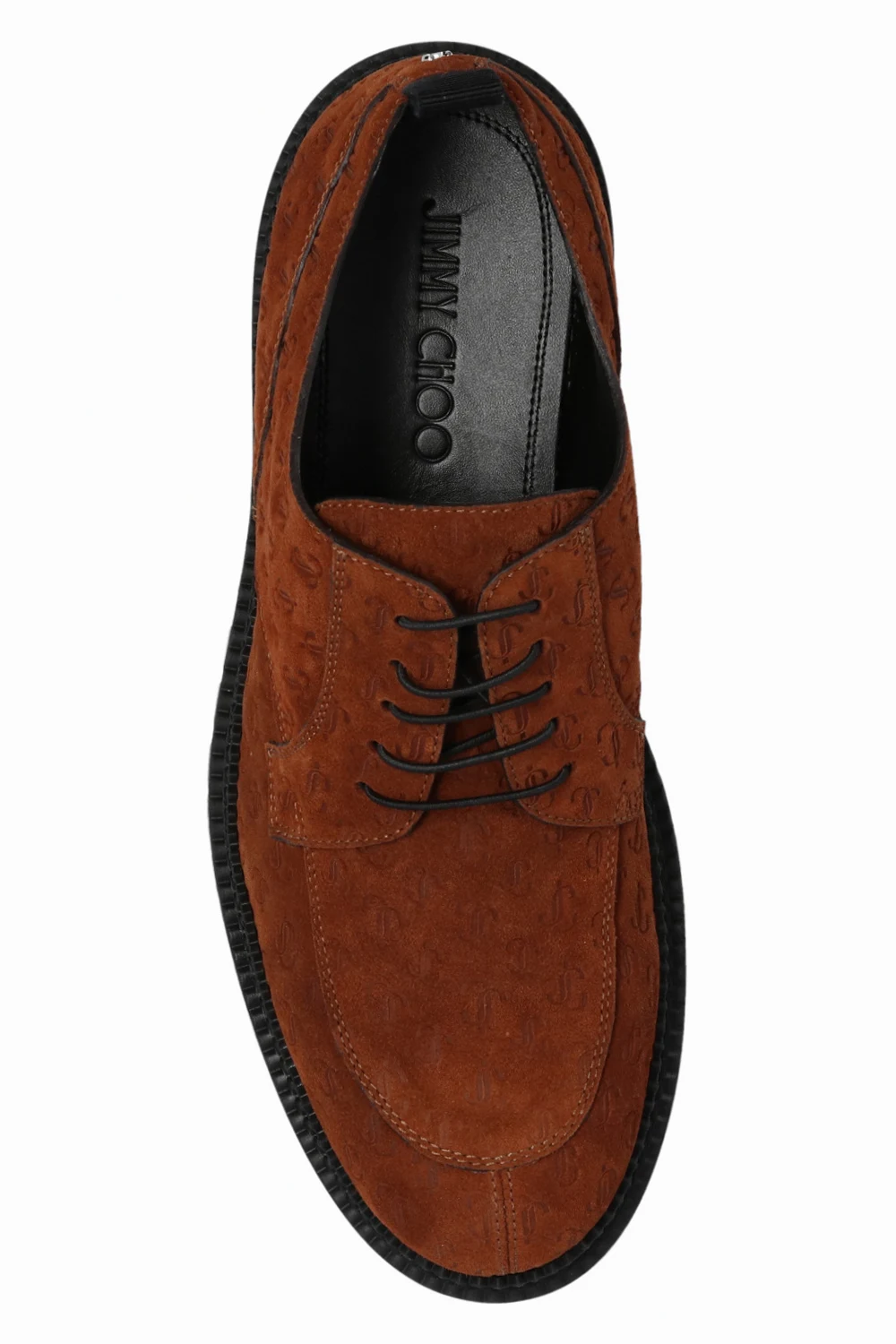 Brązowo-czarne, sznurowane buty typu ‘derby’, model ‘Benji’ Jimmy Choo. Wykonane z zamszu z wytłoczonym wzorem z monogramem. Z tyłu logo. Transparentna, gumowa podeszwa z warstwą wewnętrzną w kolorze czarnym.