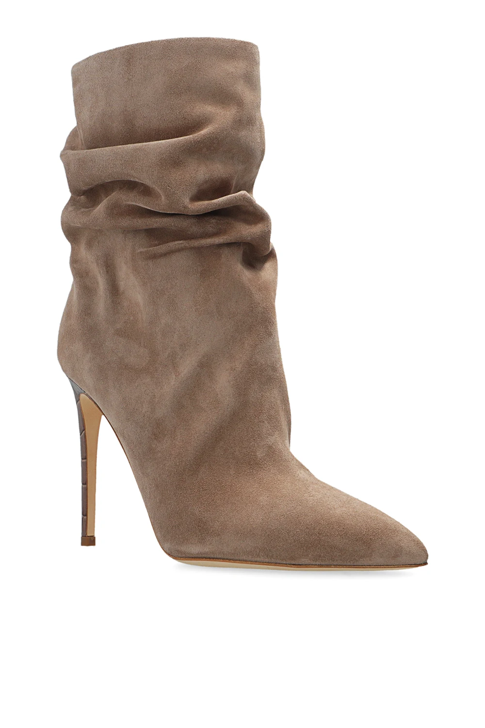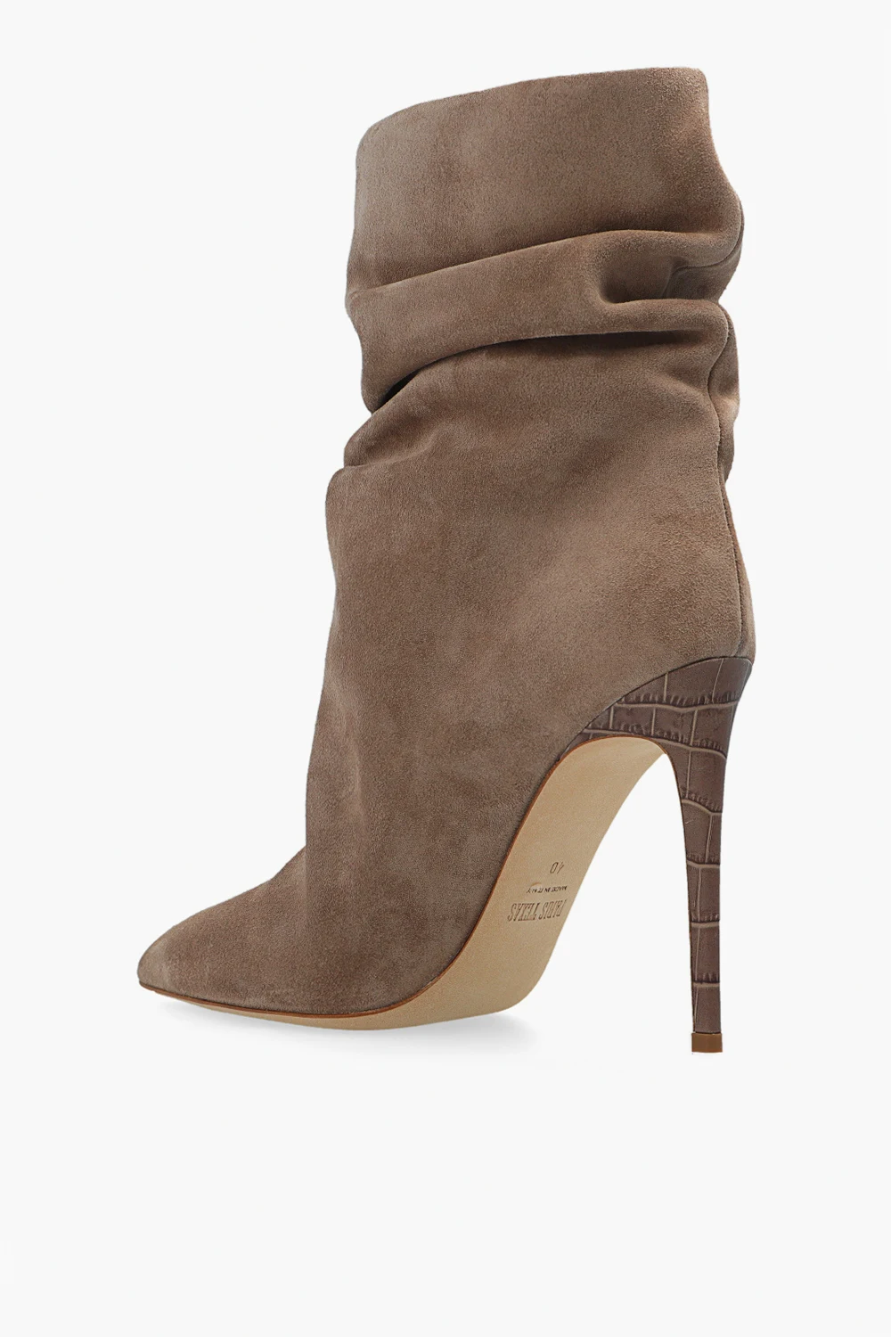 Beżowoszare, wsuwane botki na obcasie Paris Texas. Wykonane z zamszu. Dekoracyjnie marszczona cholewka. Zwężany nosek. Wysoki obcas pokryty skórą o specjalnej fakturze, imitującej skórę krokodyla. Kremowa, skórzana podeszwa.