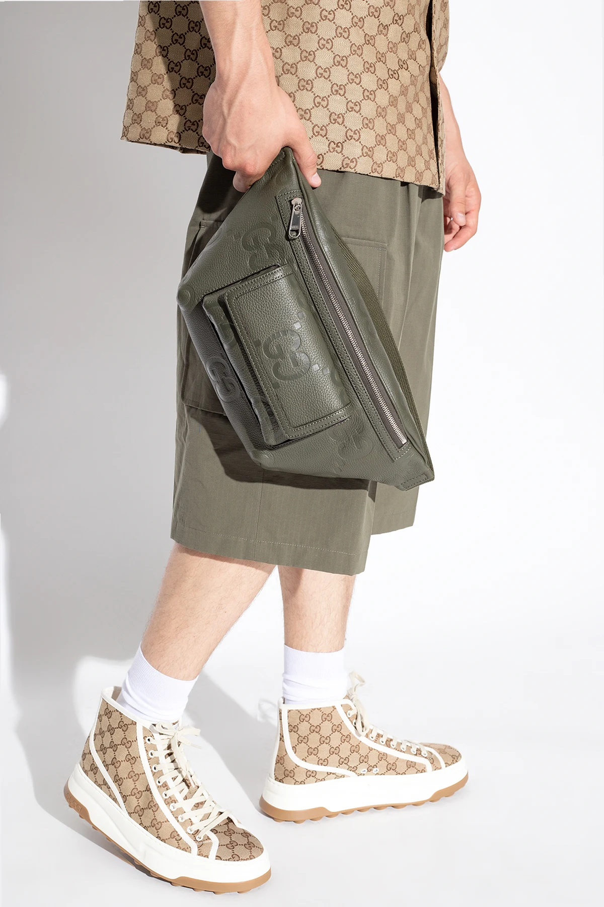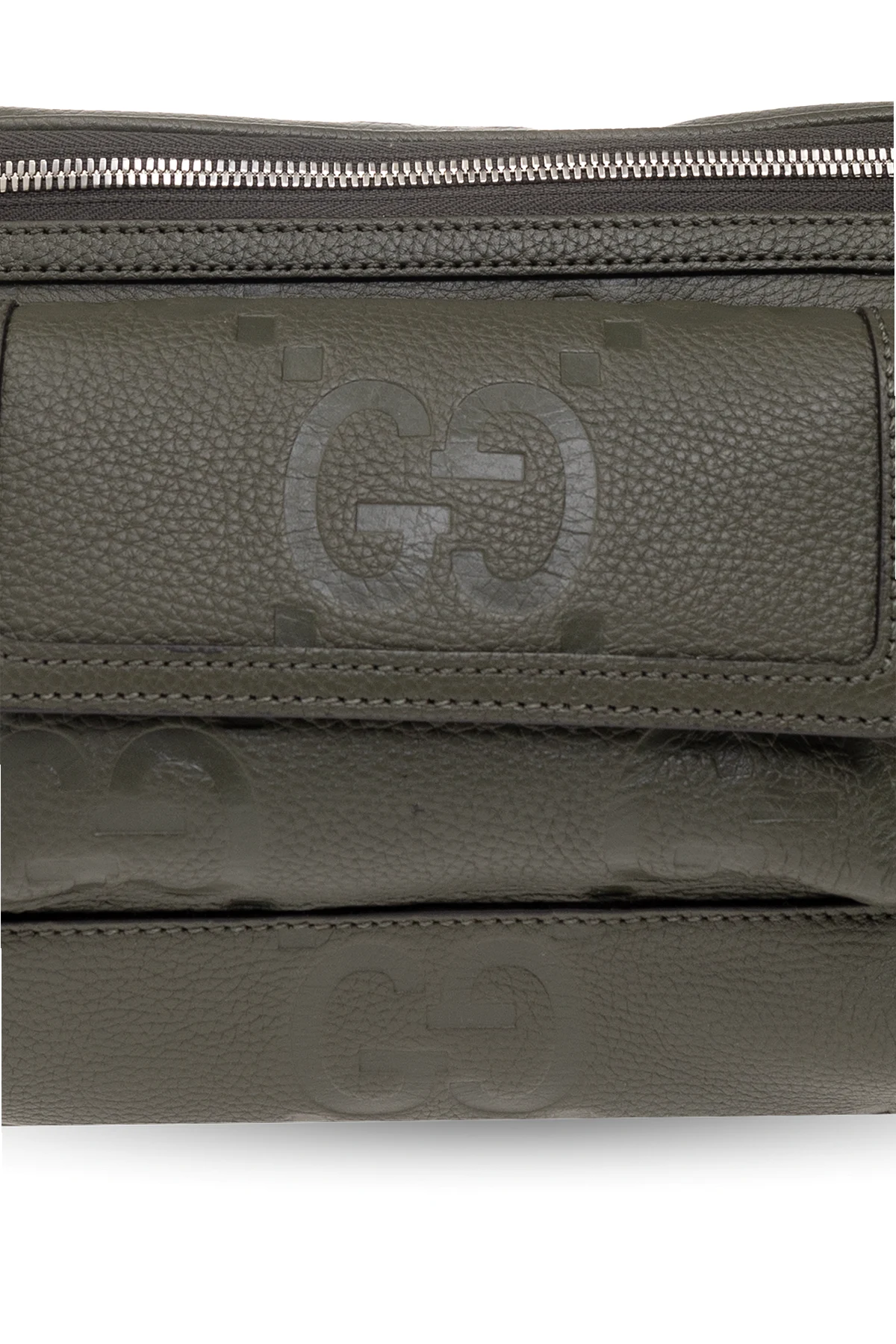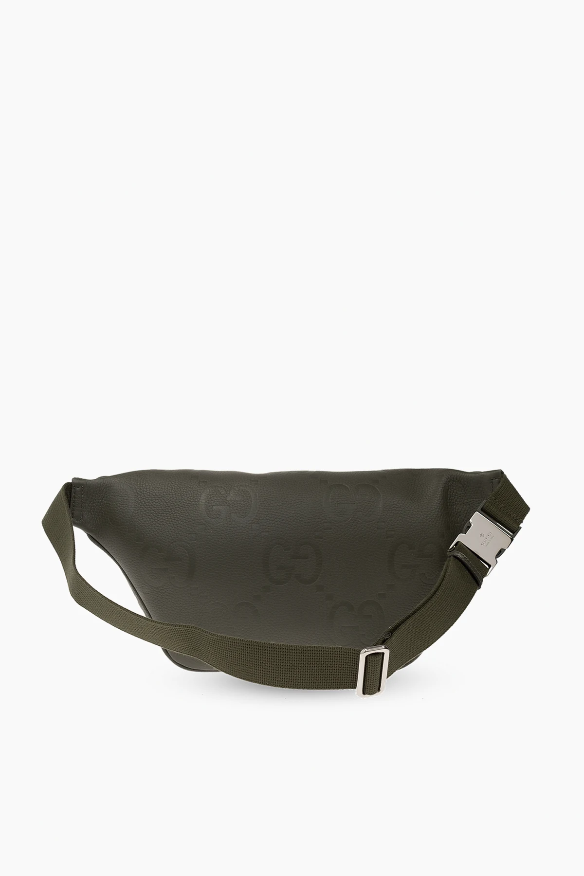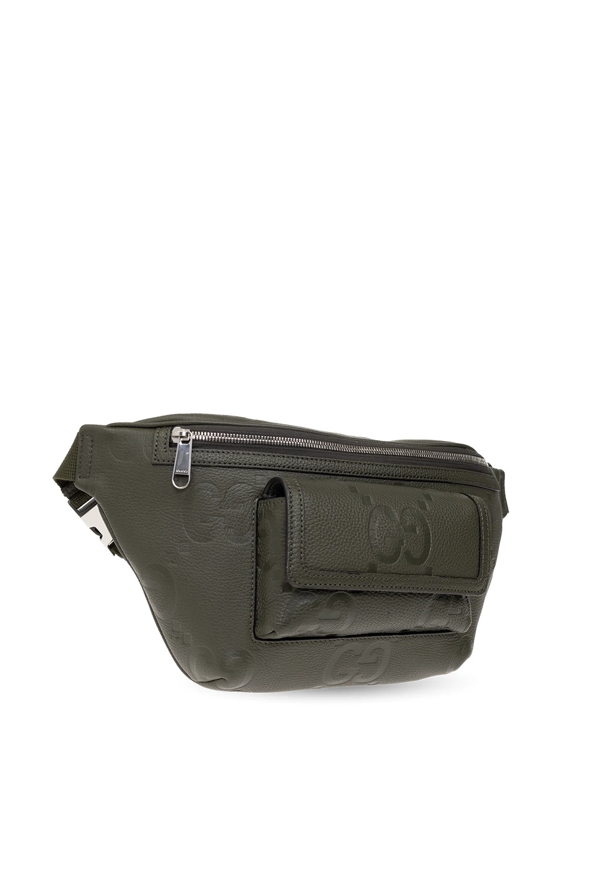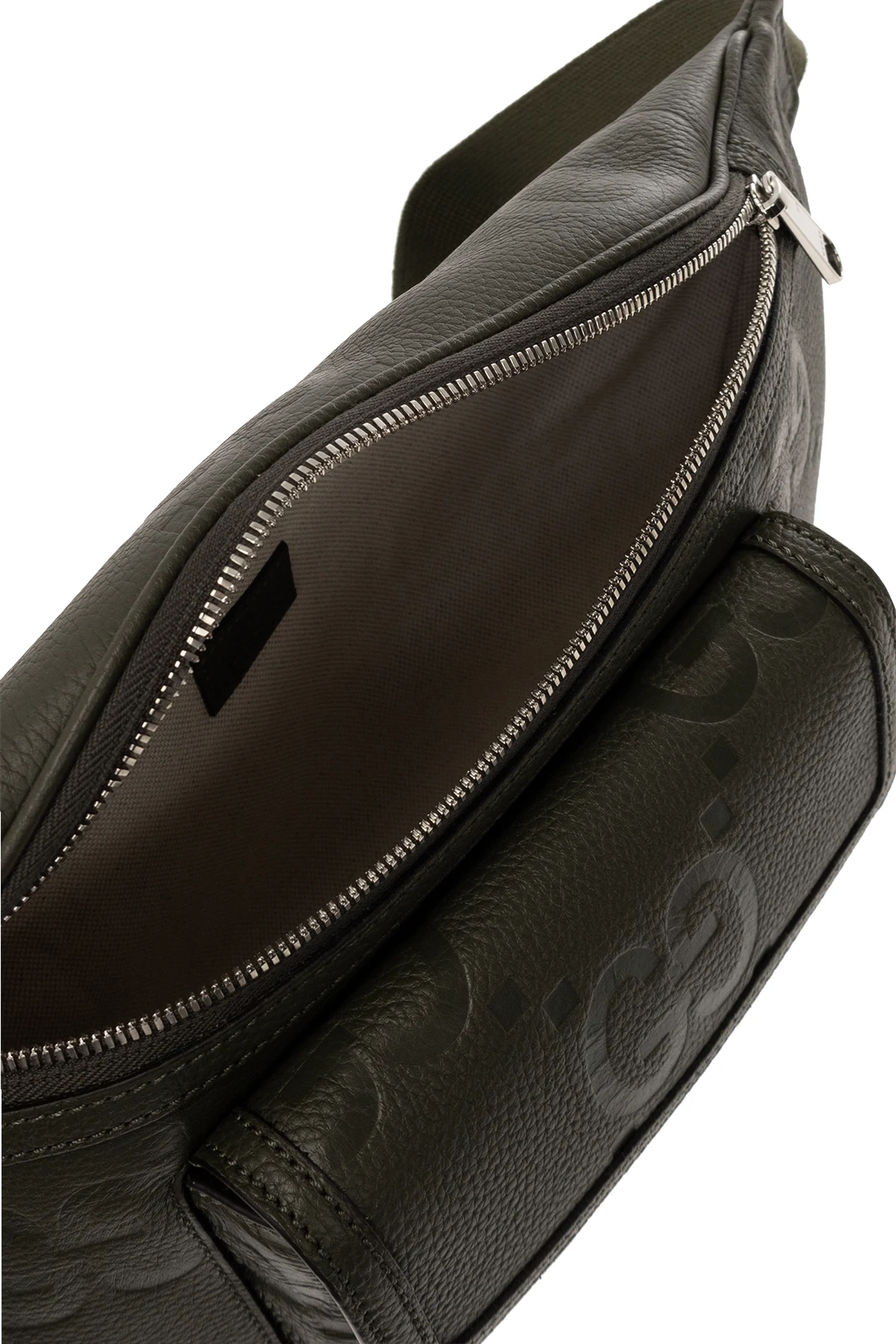 Ciemnozielona torba na pas Gucci. Wykonana ze skóry cielęcej. Zamykana na zamek. Ozdobiona wytłoczonym wzorem z monogramem. Z przodu kieszeń z patką na magnetyczny zatrzask. Regulowany pas z zapięciem na klamrę. Wewnątrz komora. Metalowe wykończenie w kolorze srebrnym.