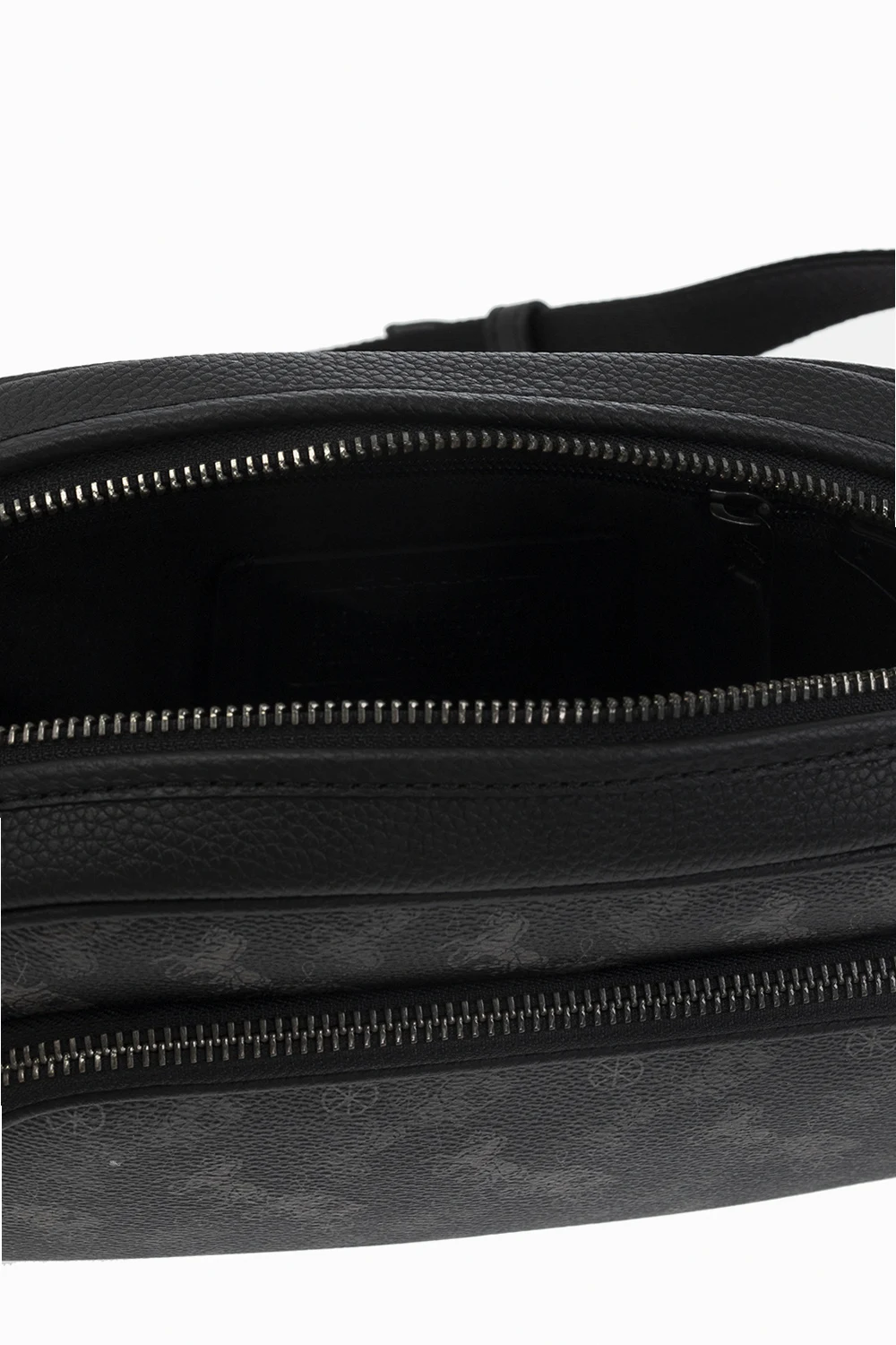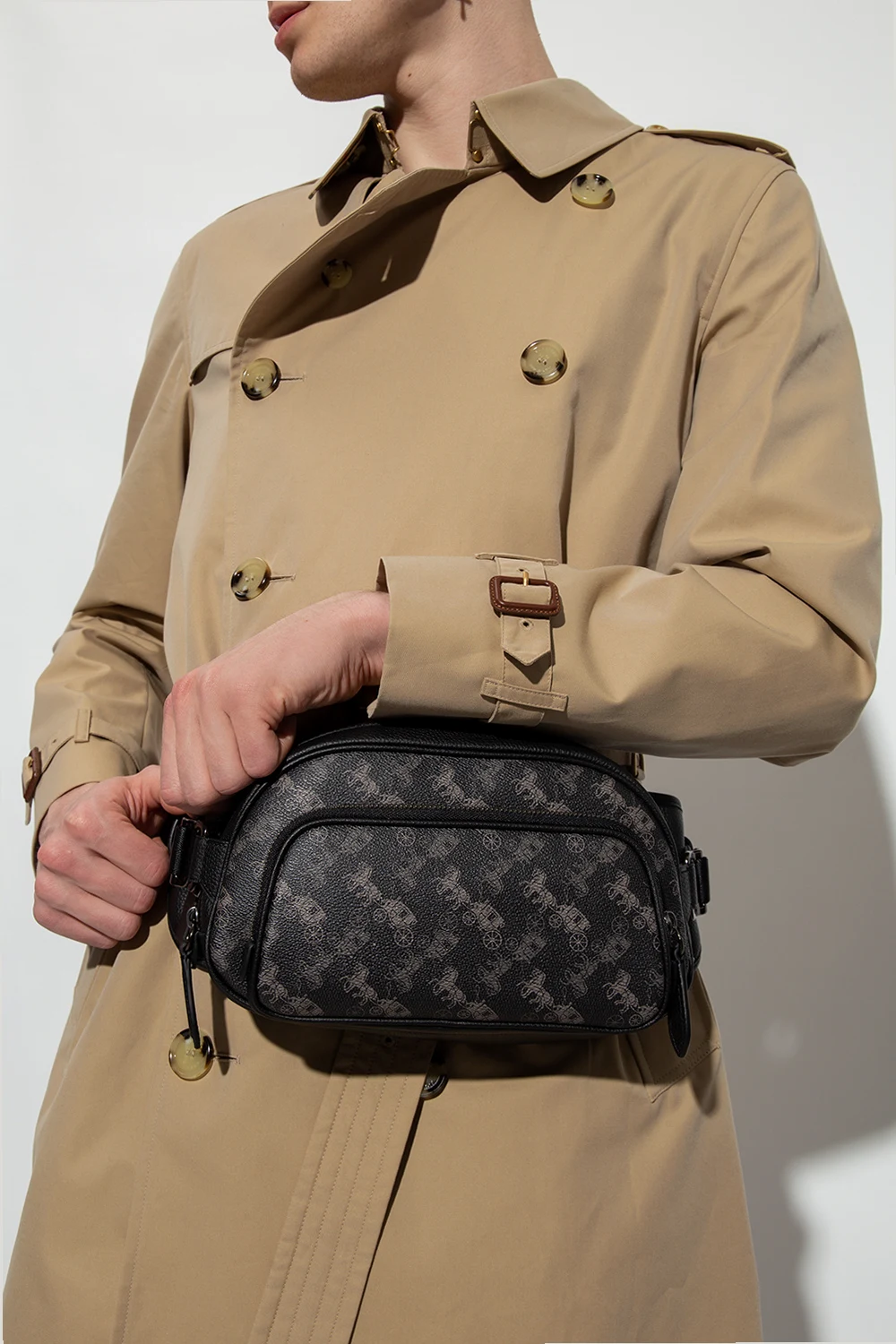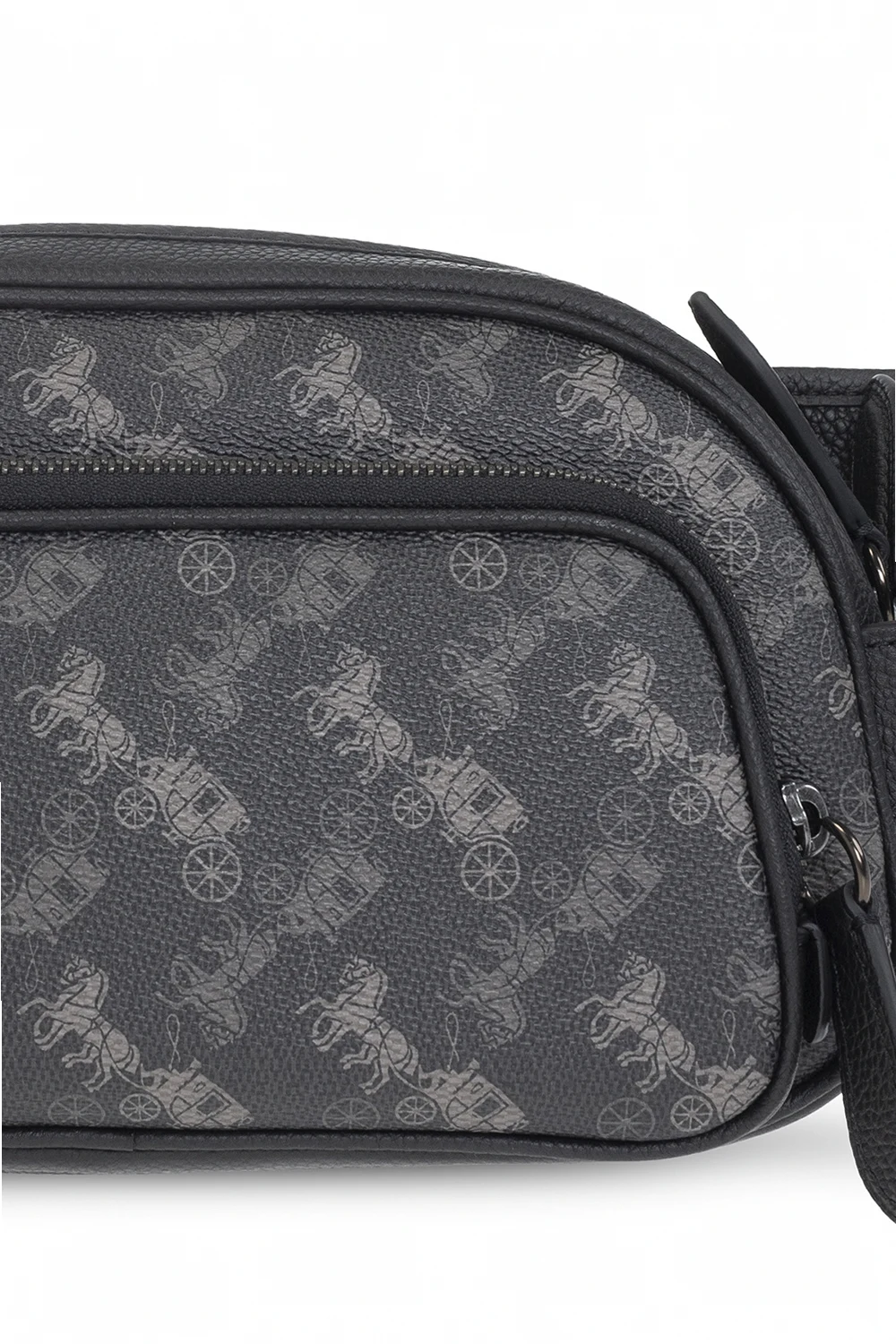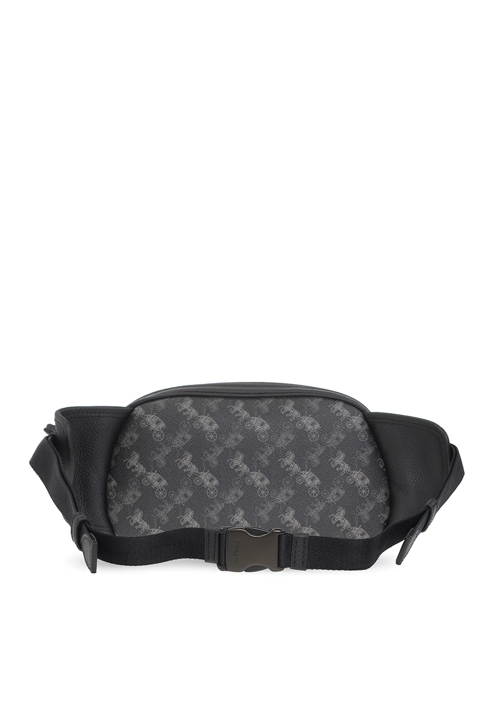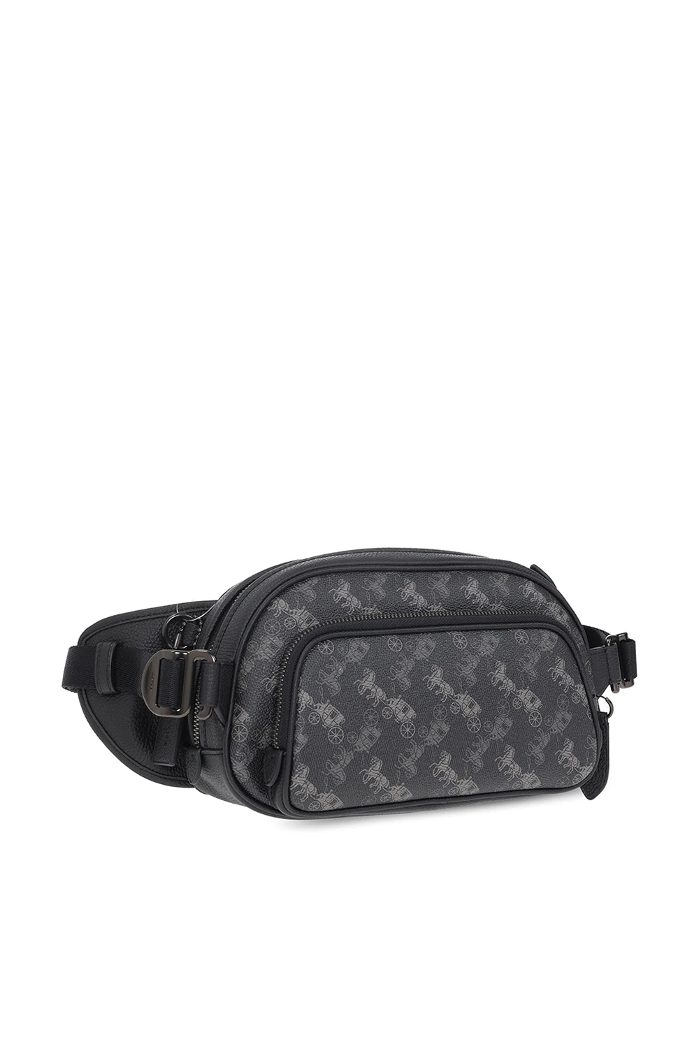 Ciemnobrązowa torba na pas Coach. Wykonana z płótna. Zamykana na zamek. Ozdobiona wzorem z logo. Z przodu kieszeń zamykana na zamek. Pas biodrowy z możliwością regulacji długości. Wewnątrz komora oraz kieszeń zamykana na zamek. Metalowe wykończenie w kolorze czarnego srebra.