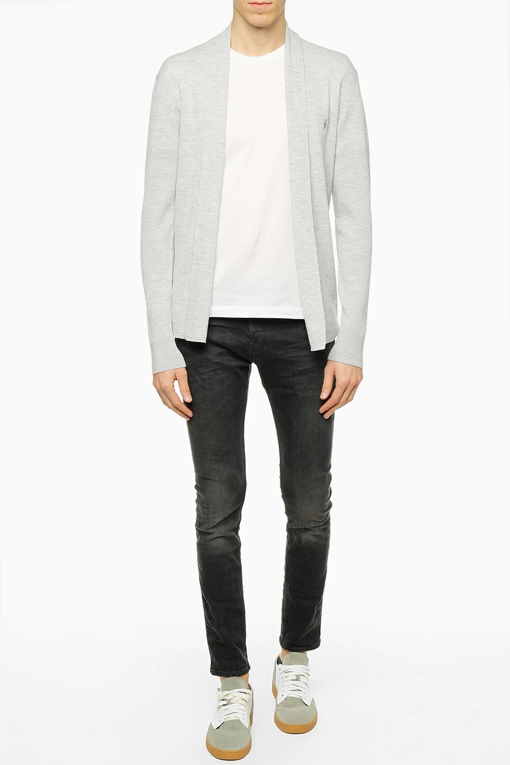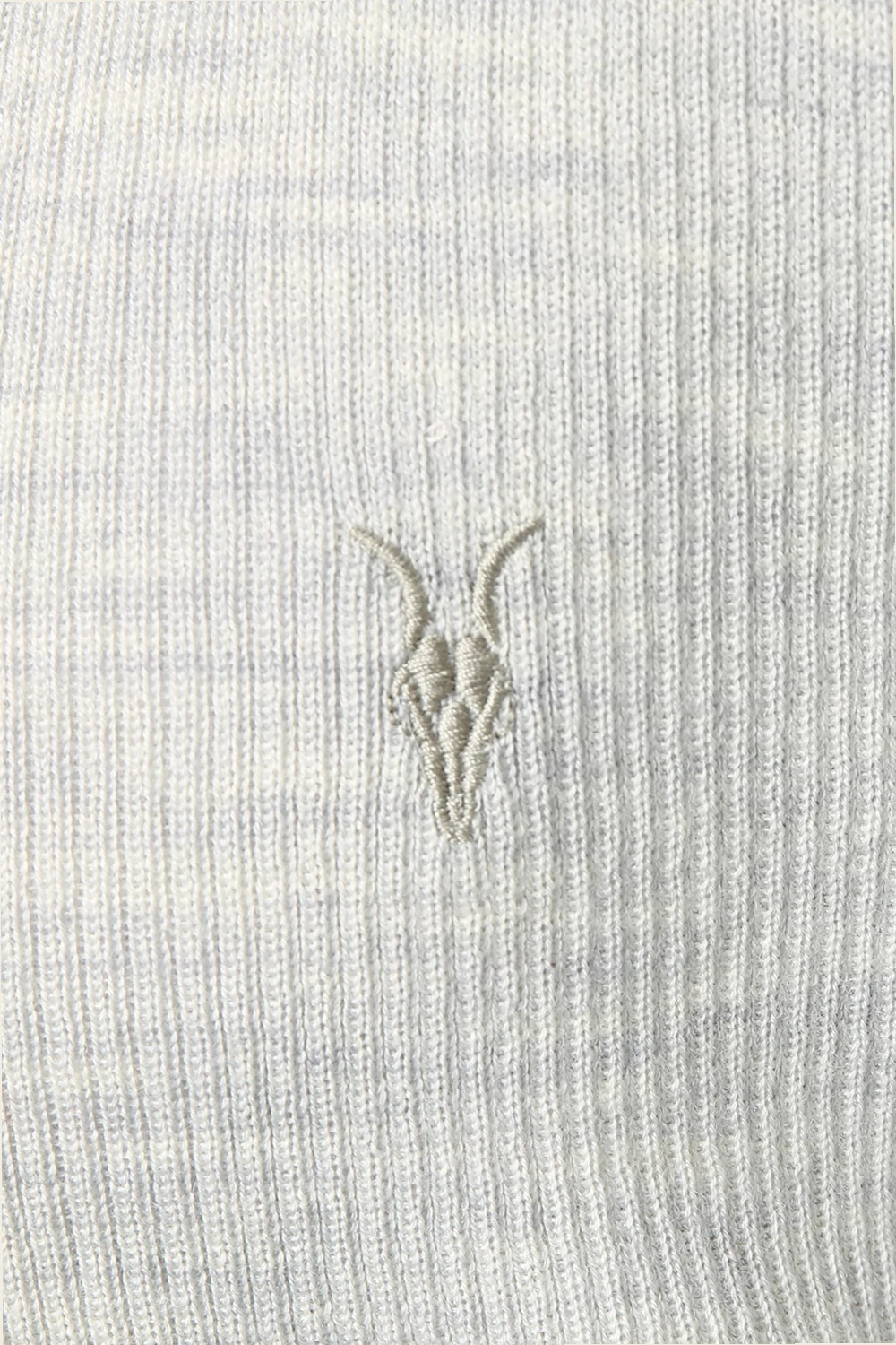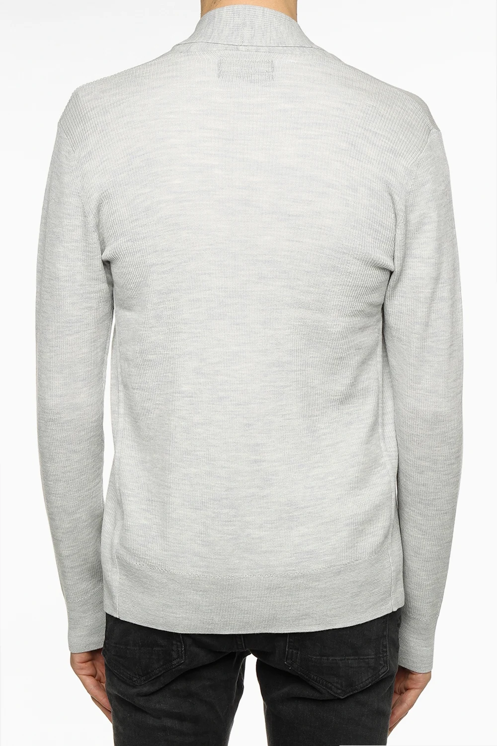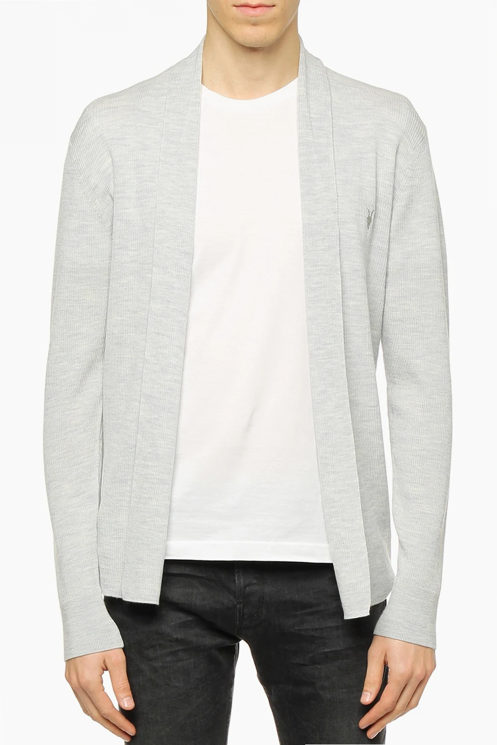 Szary kardigan, model 'Mode' AllSaints. Wykonany z wełny merynosów. Z przodu ozdobiony wyszytym logo w kolorze szarym. Rękawy zakończone ściągaczami.