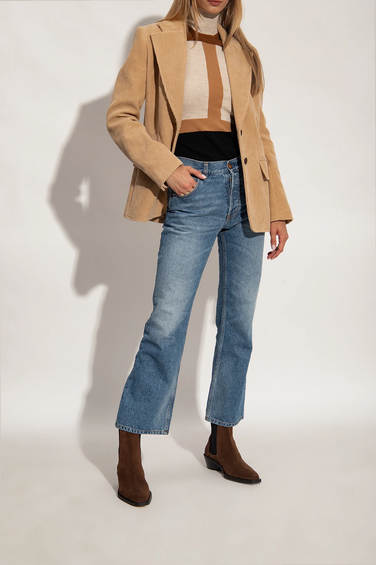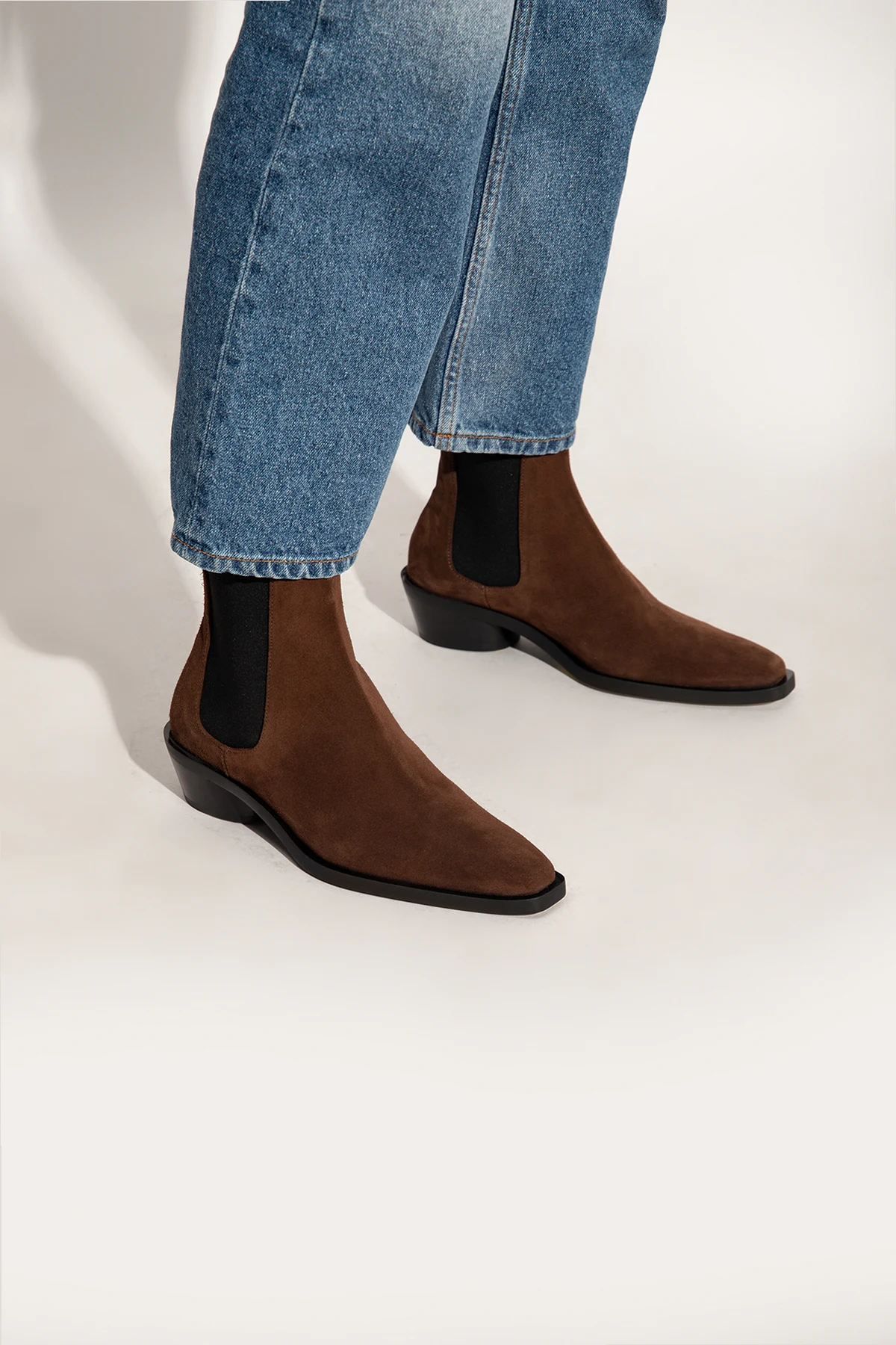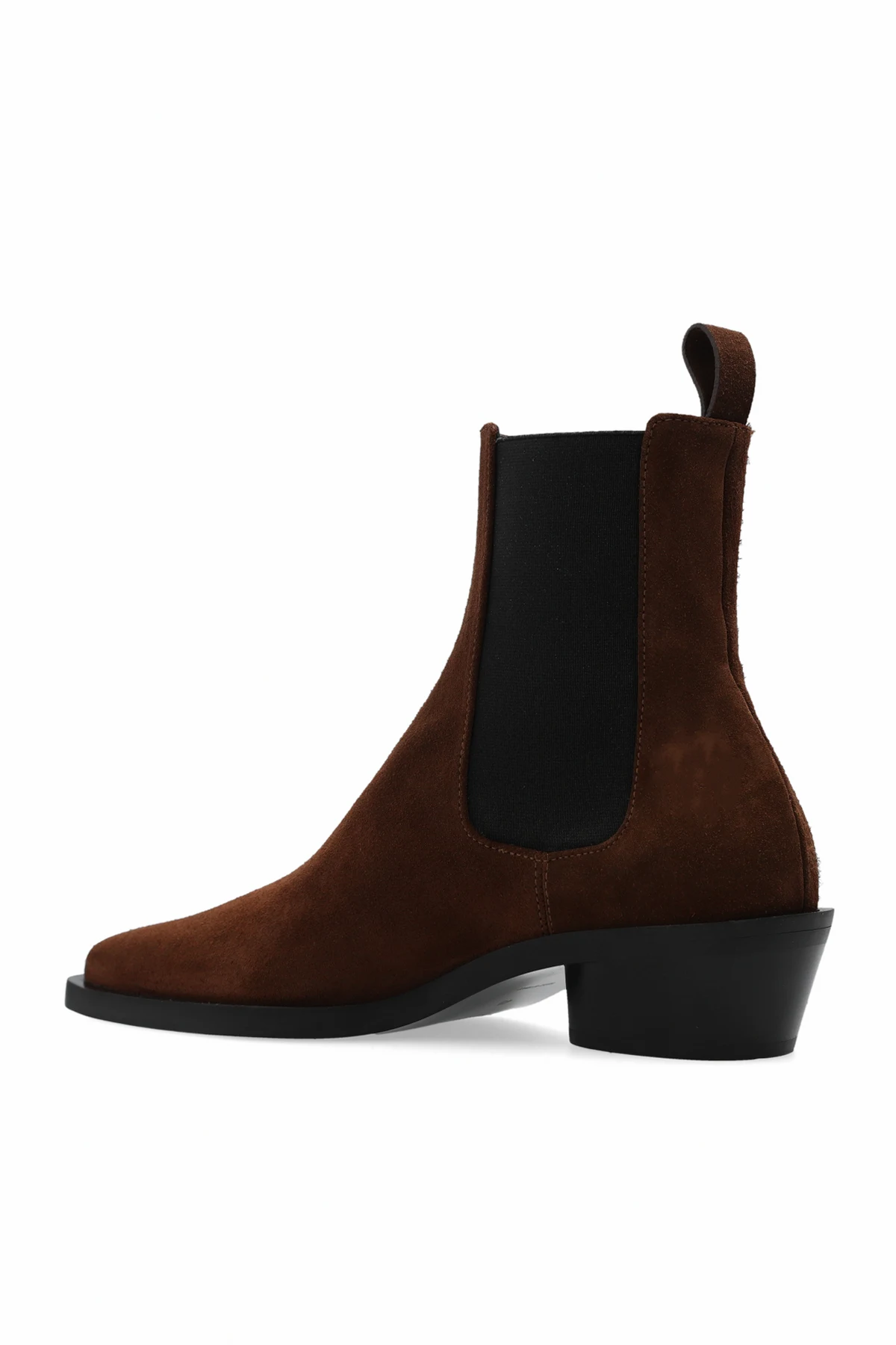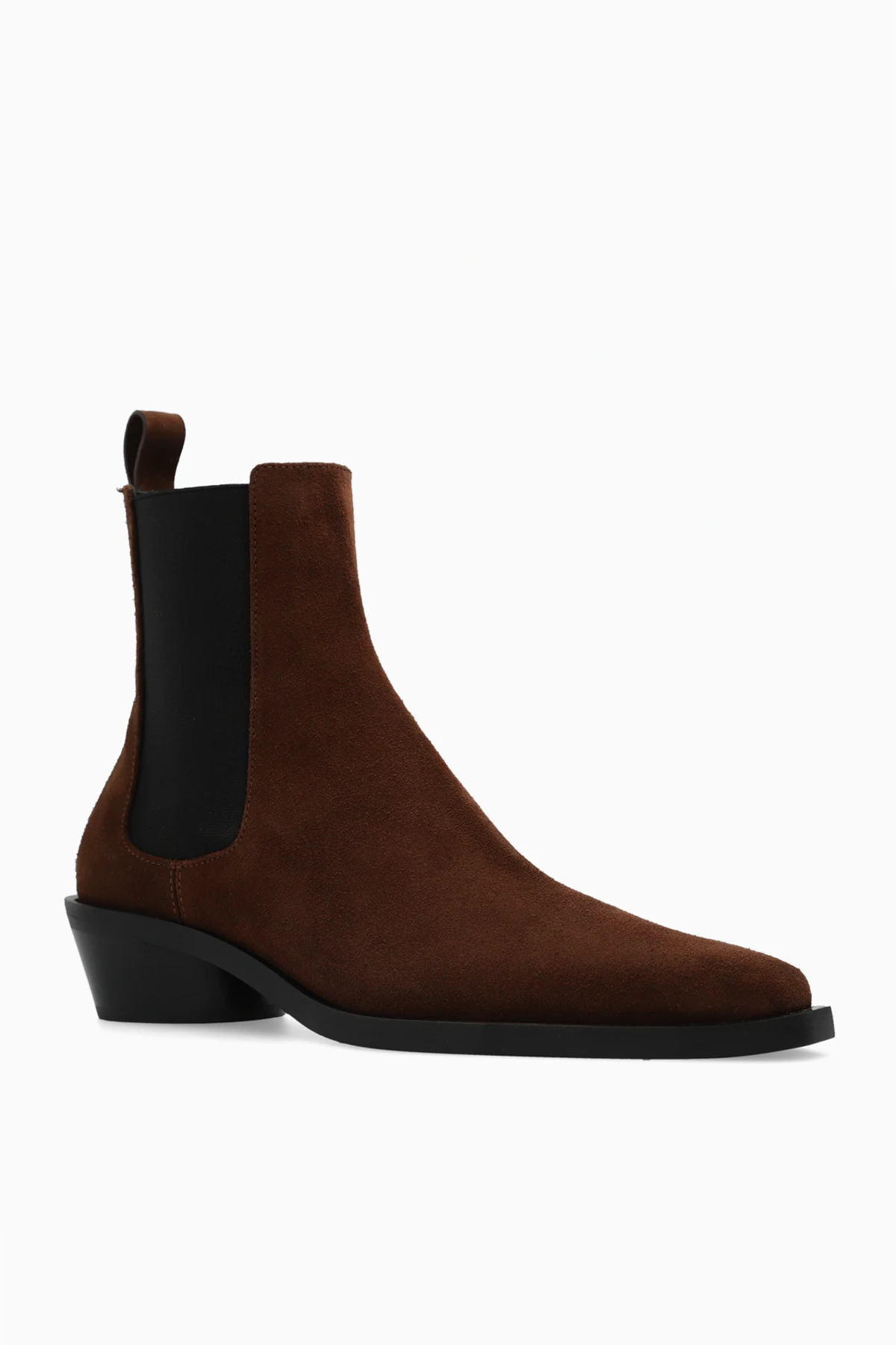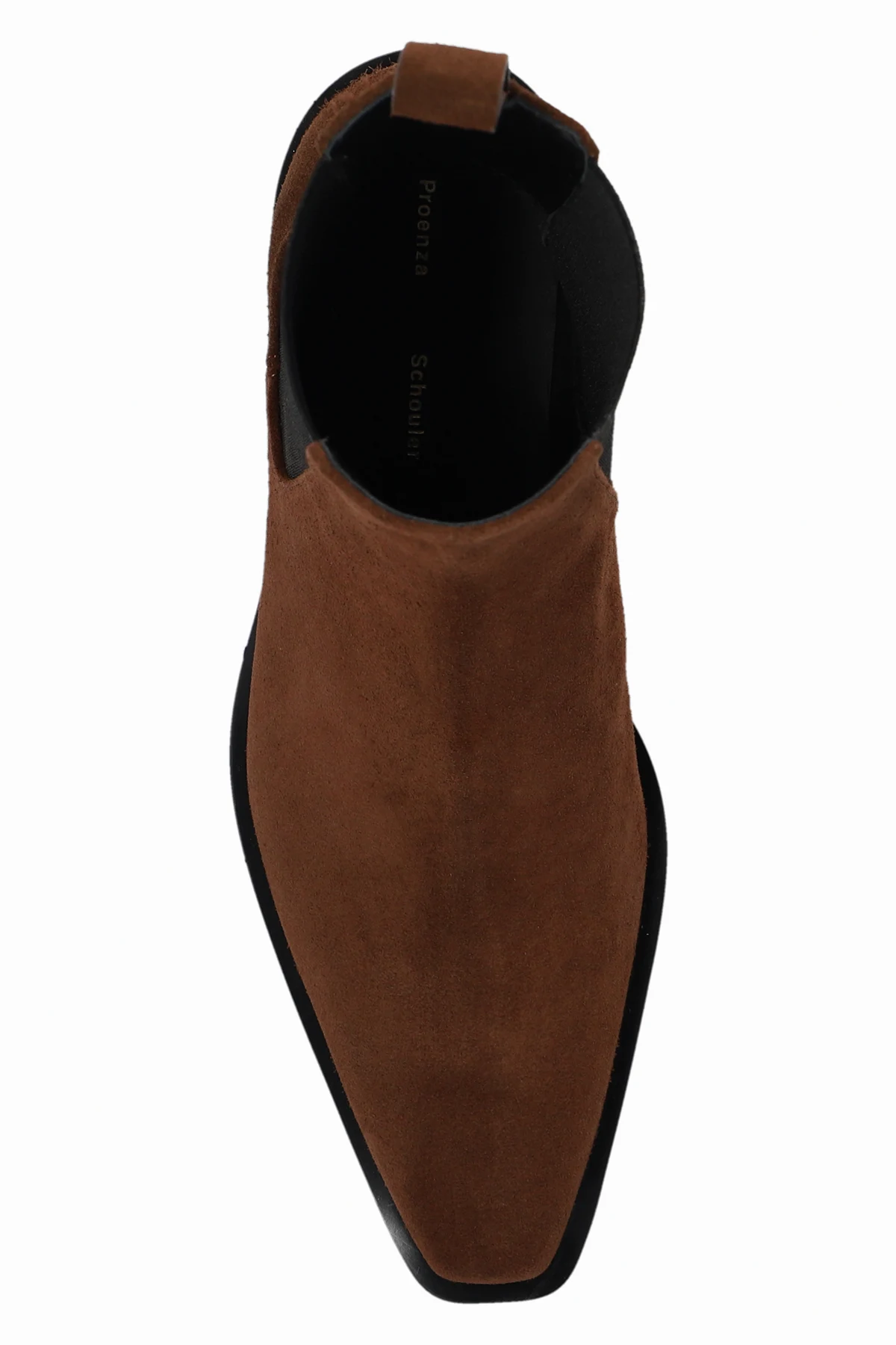 Brązowe sztyblety Proenza Schouler. Wykonane z zamszu. Po bokach wszyta czarna, elastyczna guma. Wydłużony, ścięty nosek. Gumowa podeszwa.