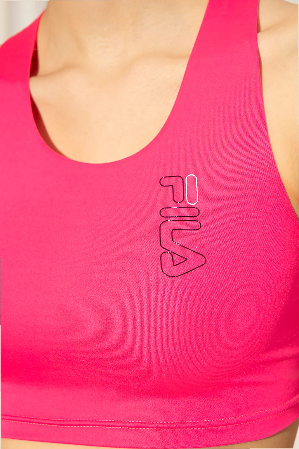 Neonoworóżowy, krótki top na ramiączkach Fila. Wypukła aplikacja z logo. Z tyłu czarne paski.
