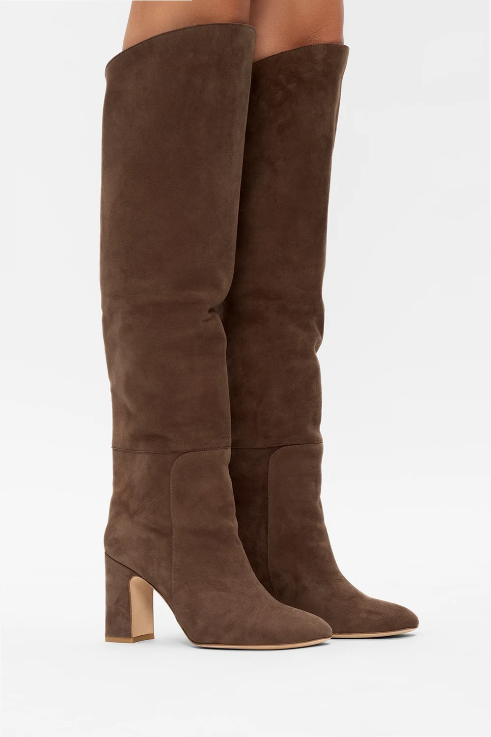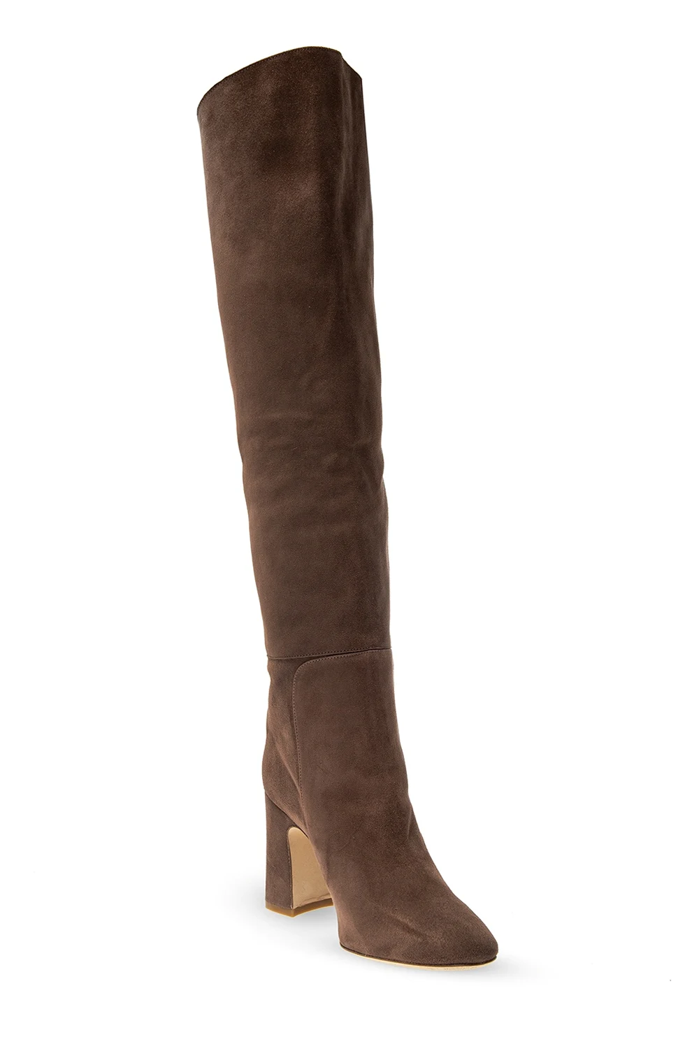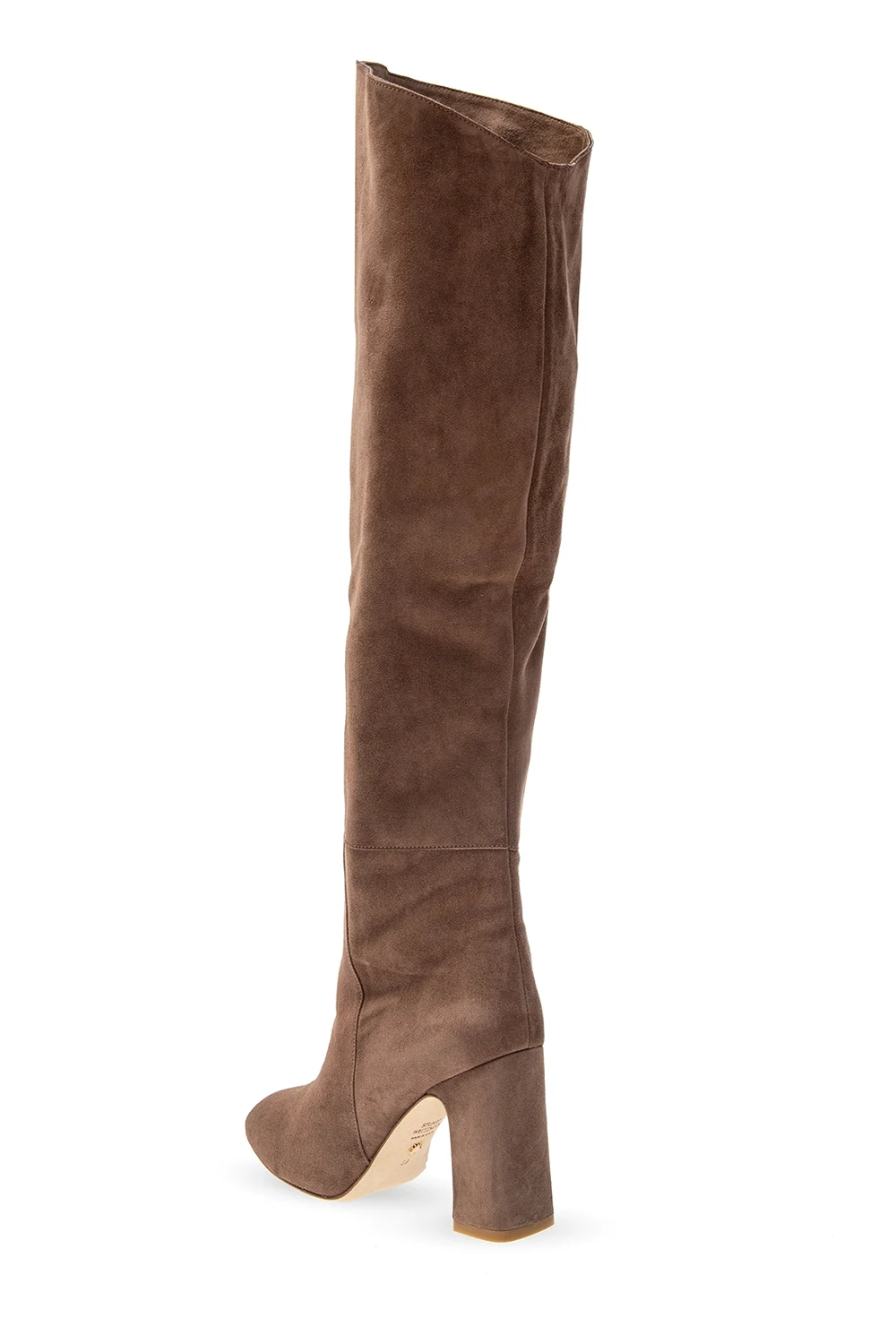Jasnobrązowe, zamszowe, wsuwane kozaki na obcasie, model ‘Lucinda’ Stuart Weitzman. Ozdobione przeszyciami. Kremowa, skórzana podeszwa.
