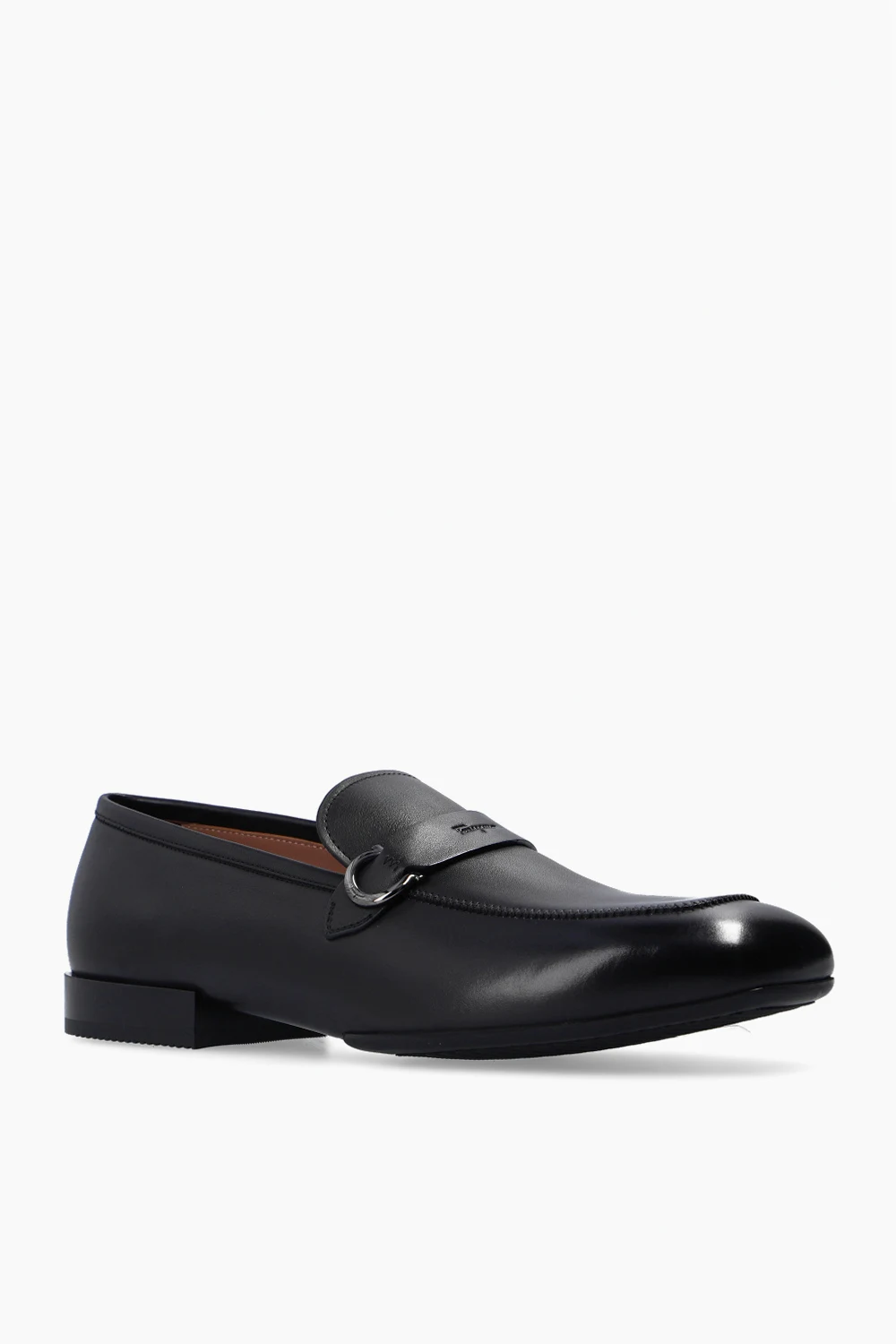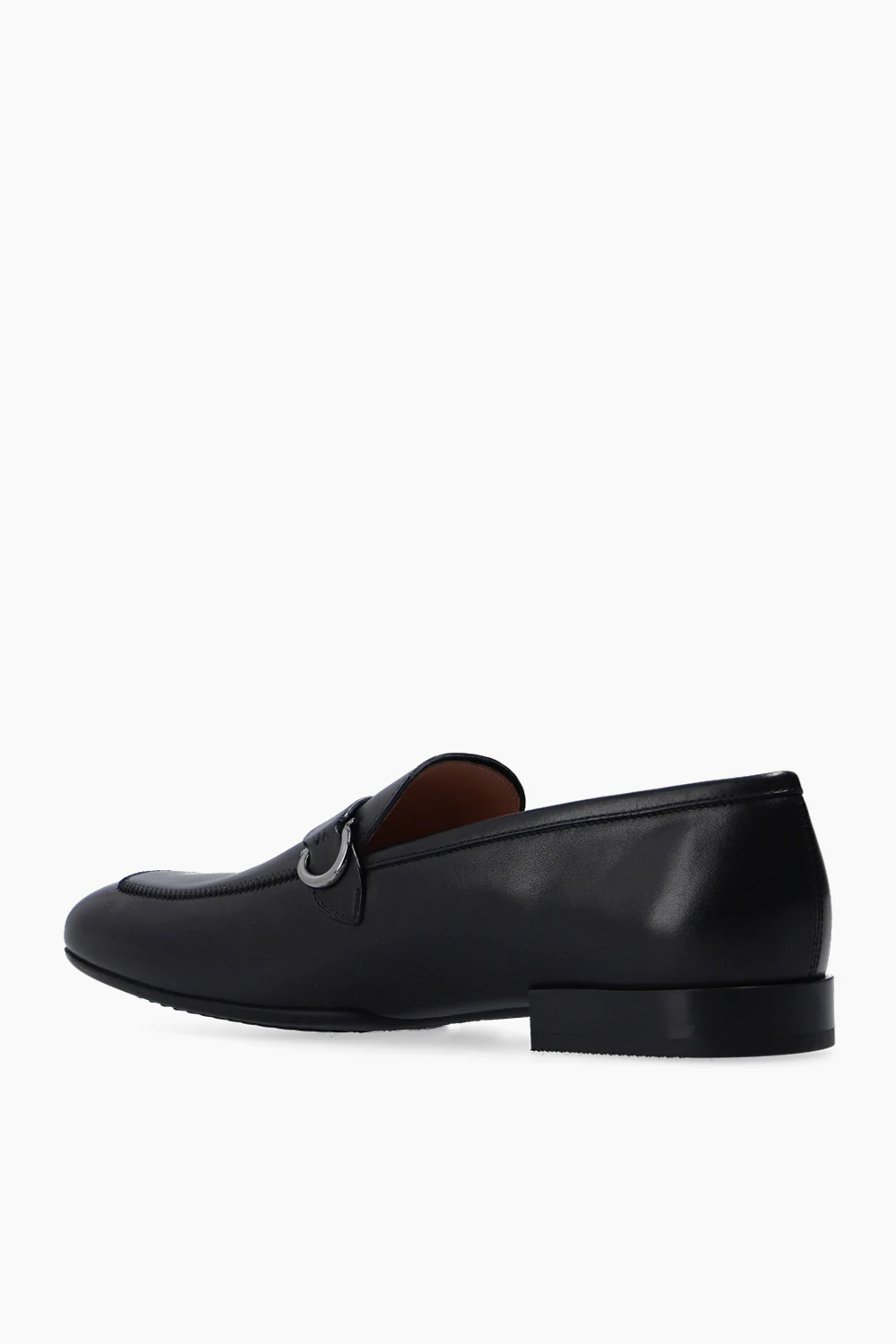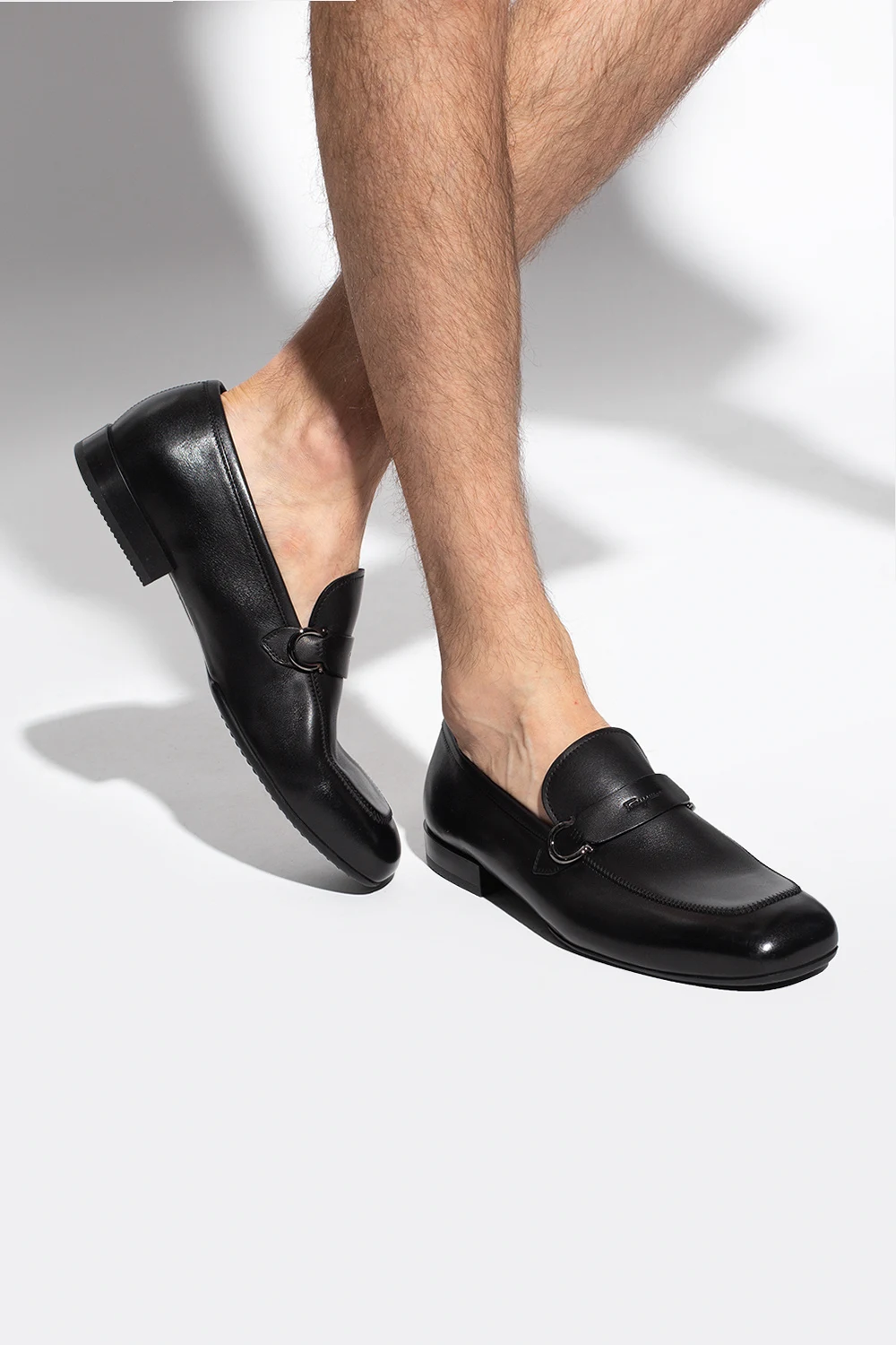 Czarne mokasyny, model ‘Nowell’ Salvatore Ferragamo. Wykonane ze skóry cielęcej. Ozdobione wzorem z wytłoczonym logo oraz aplikacją w kolorze srebrnym. Czarna, gumowa podeszwa.