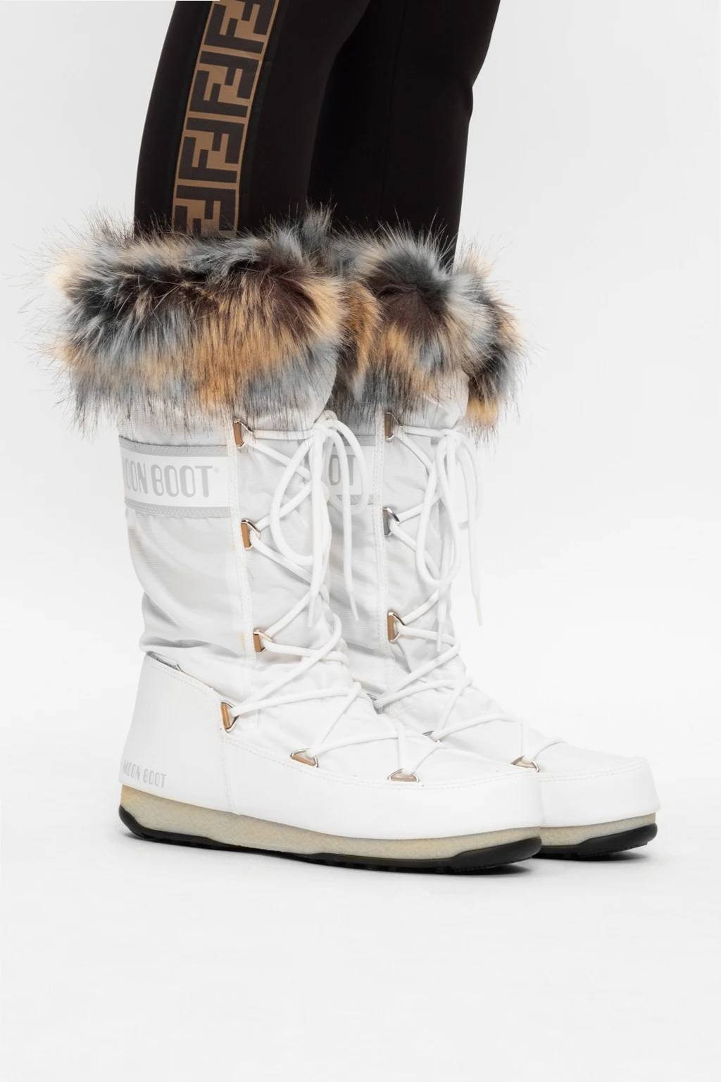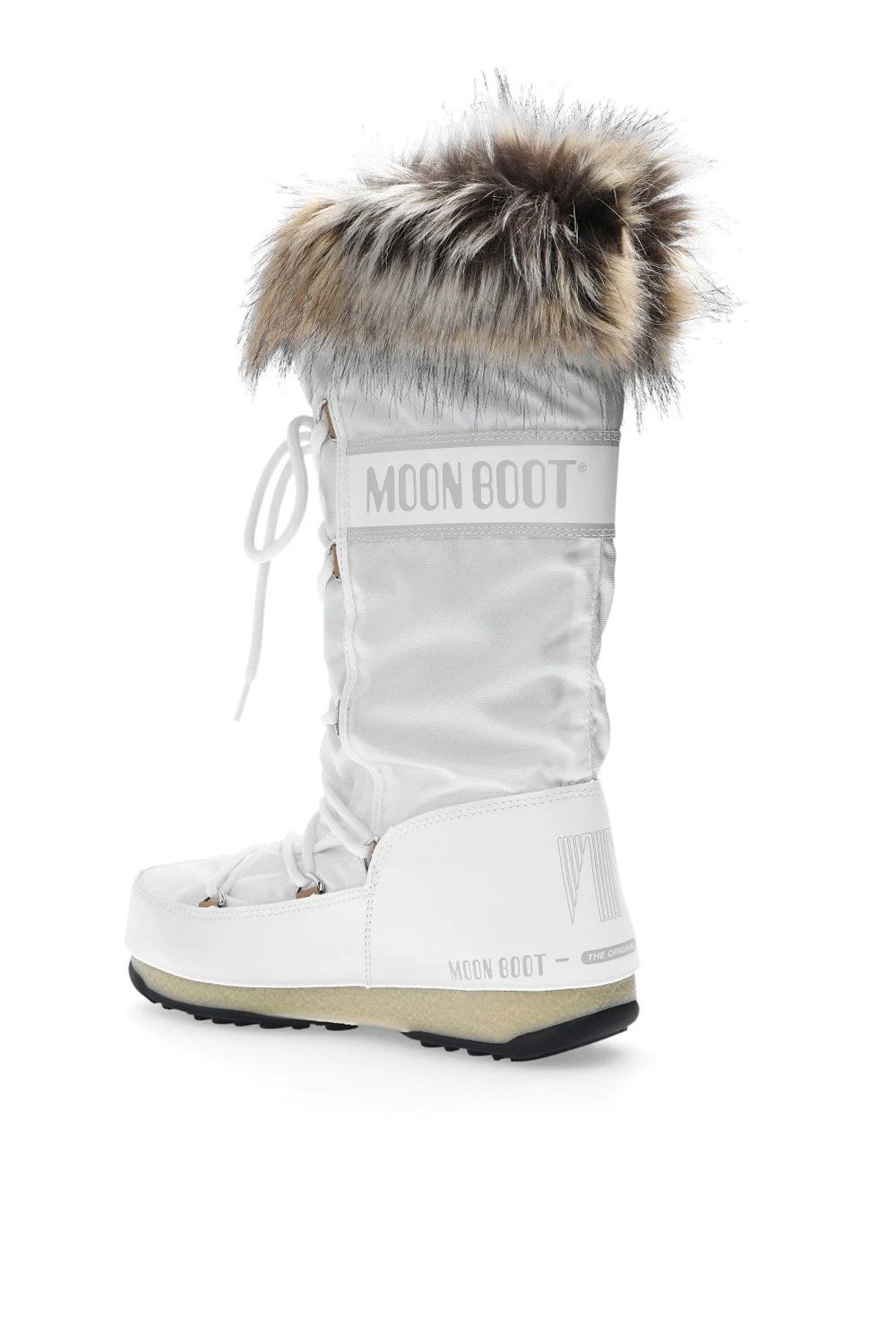 Białe, sznurowane śniegowce, model ‘Monaco WP 2’ Moon Boot. Ozdobione nadrukowanym logo w kolorze szarym. Obszyte futrem syntetycznym. Czarna, gumowa podeszwa.