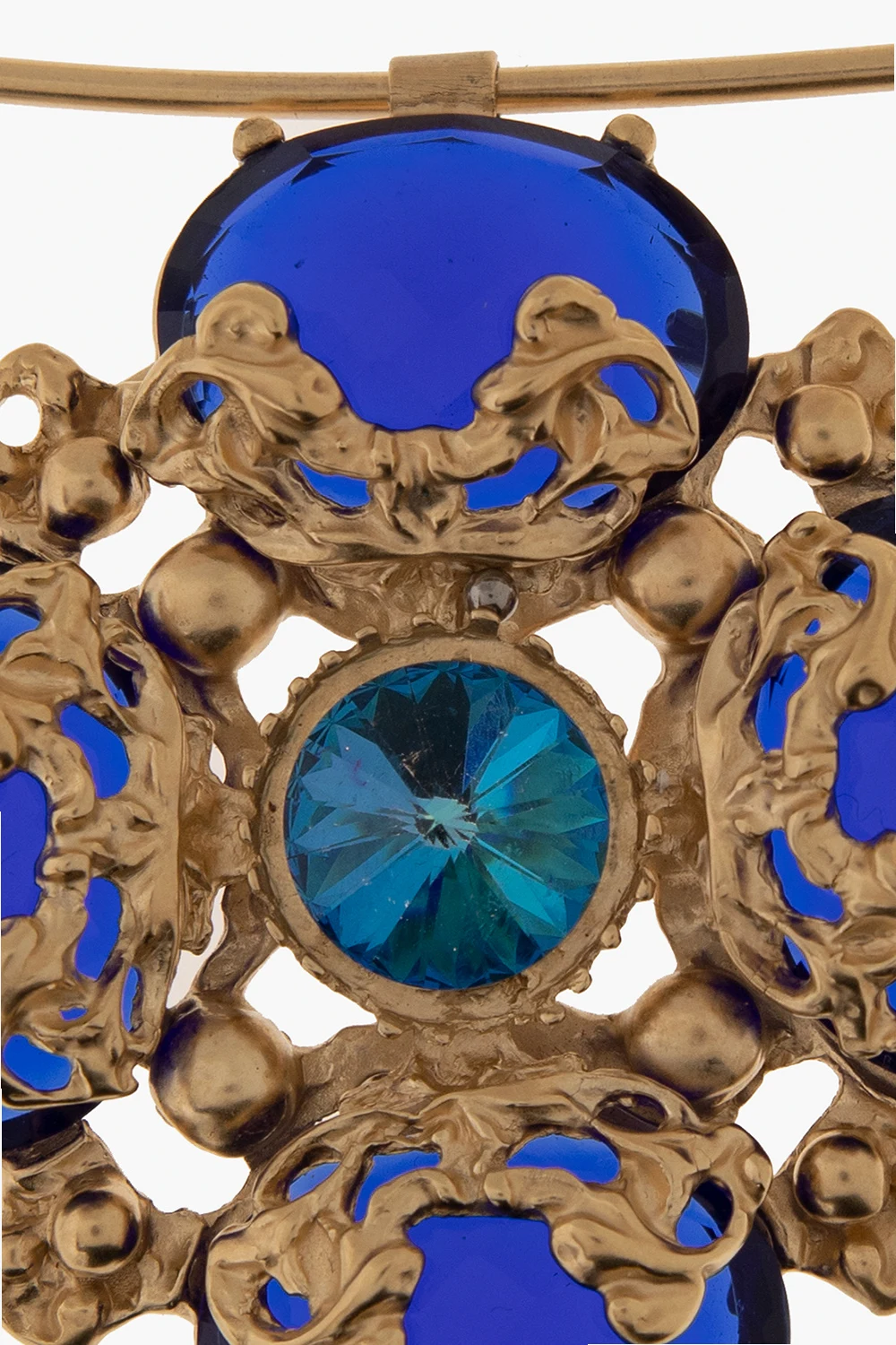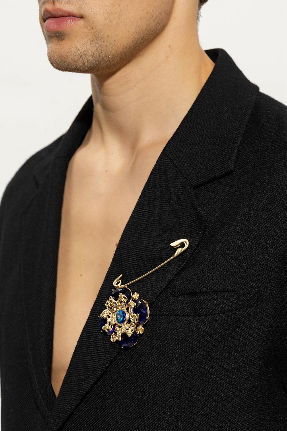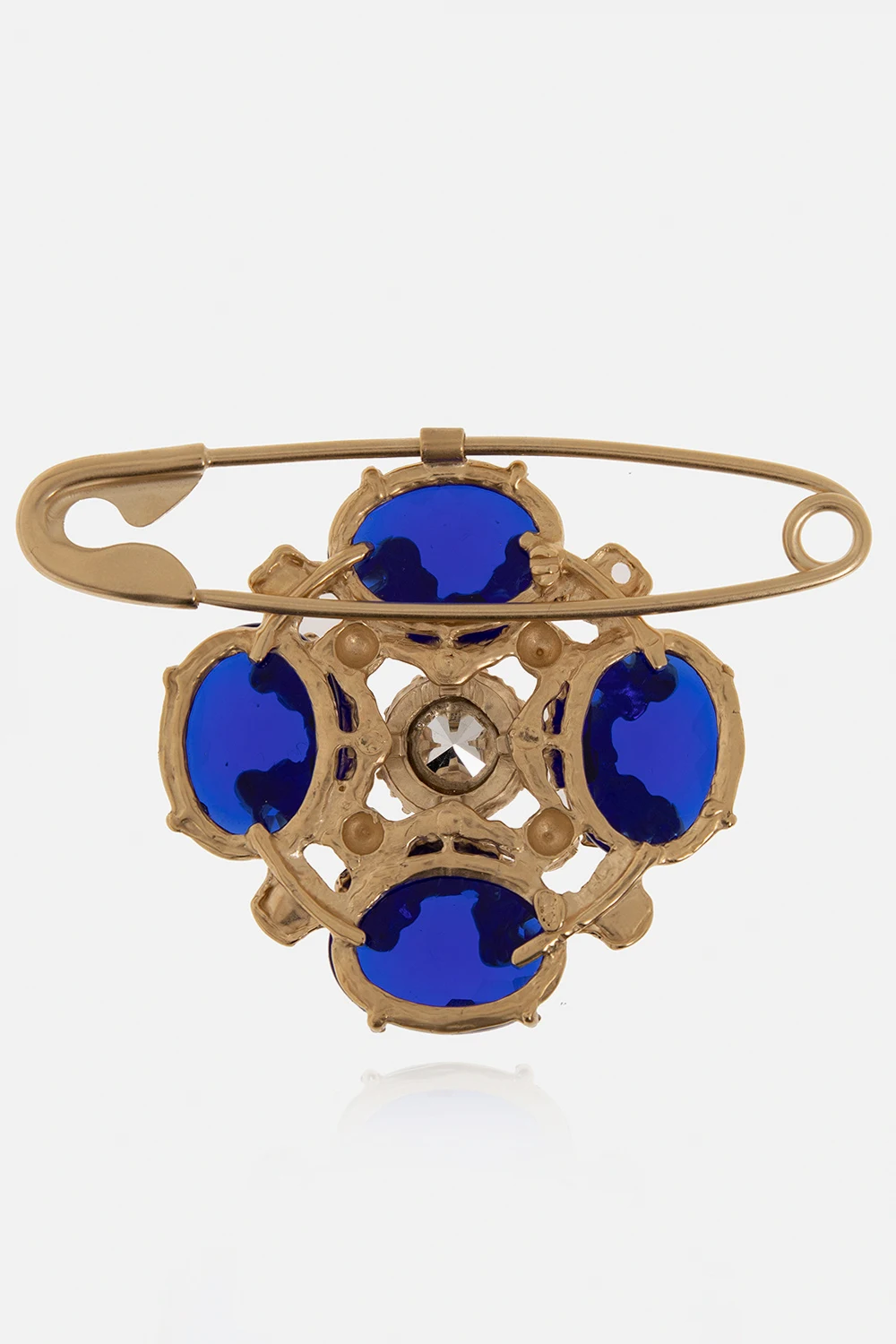 Mosiężna broszka w kolorze złotym w kształcie agrafki Maison Margiela. Dekoracyjna zawieszka w kształcie kwiatu z rzeźbionym wzorem wykończona połyskującymi kamieniami w kolorze ciemnoniebieskim.