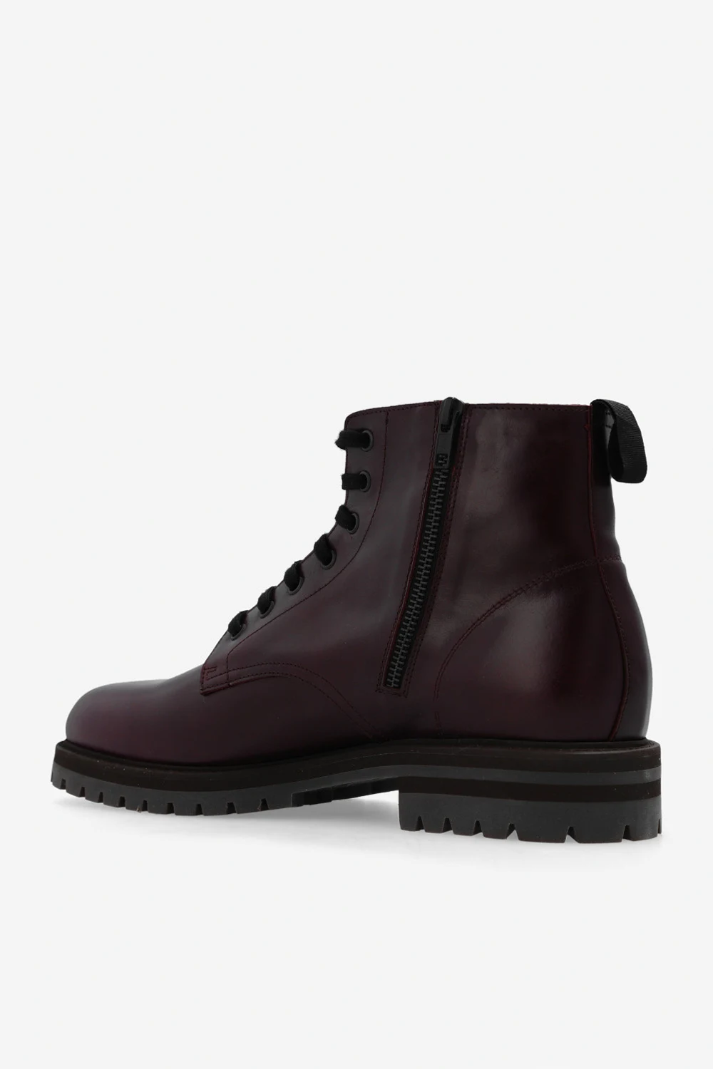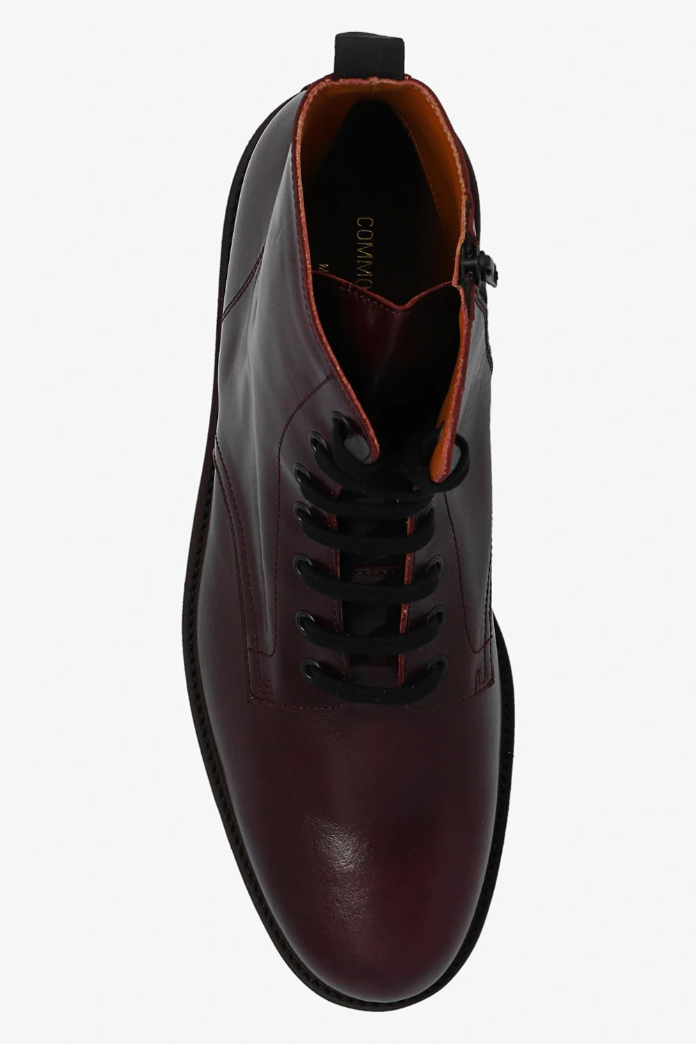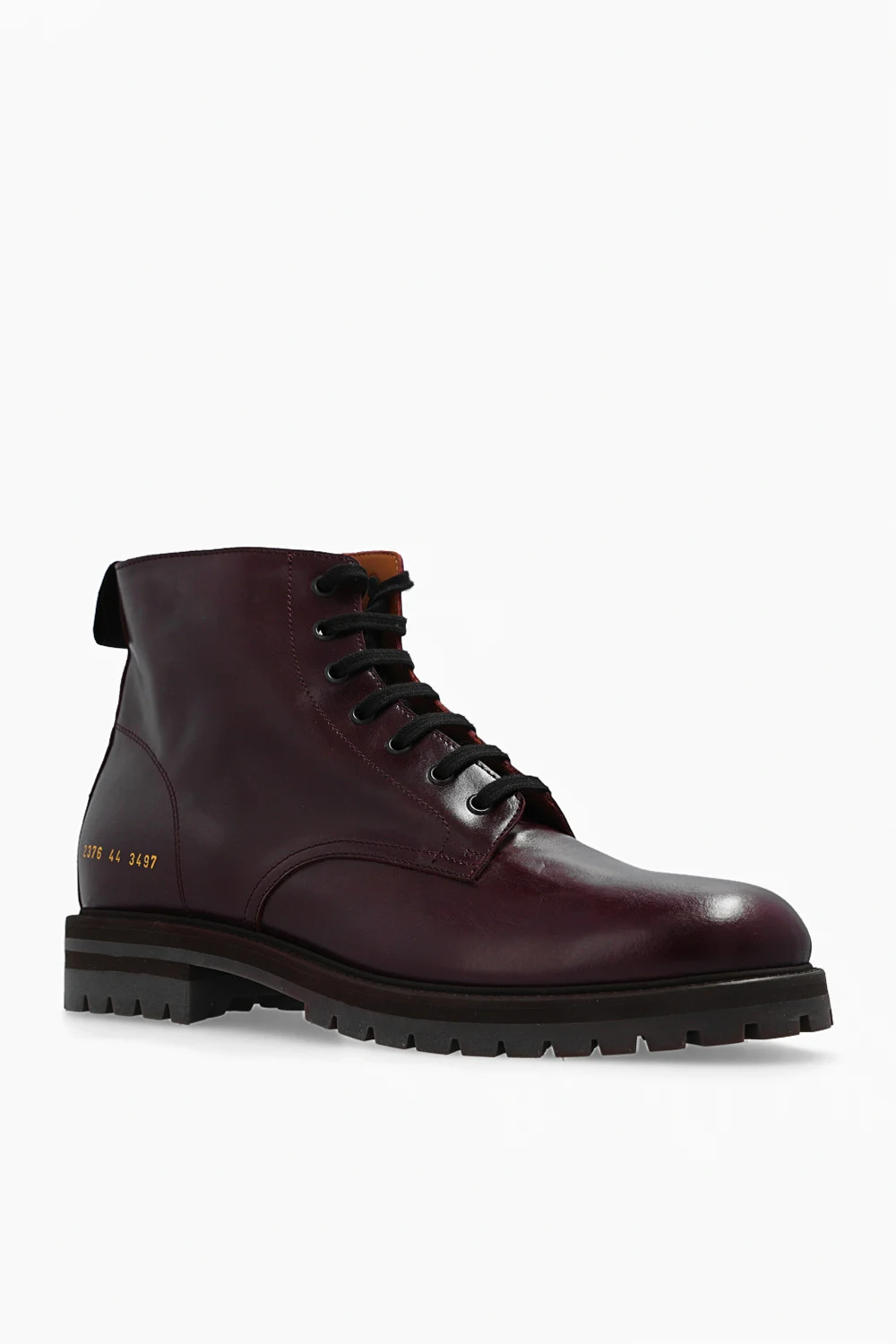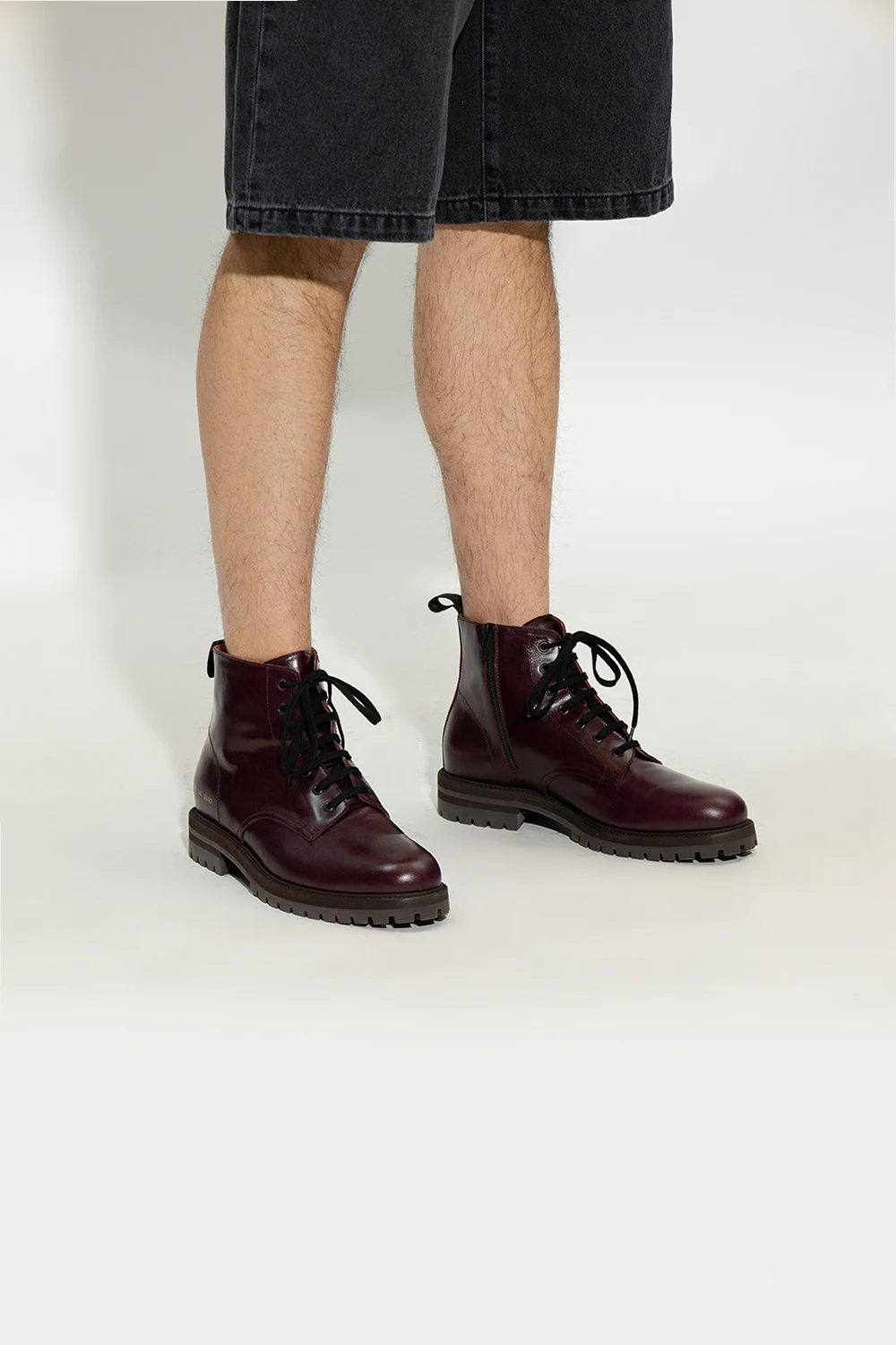 Ciemnofioletowe, sznurowe buty typu ‘combat’ Common Projects. Wykonane ze skóry. Z boku zapinane na zamek. Z boku ozdobione charakterystycznym, numerycznym wzorem w kolorze złotym. Ciemnobrązowa, gumowa podeszwa.