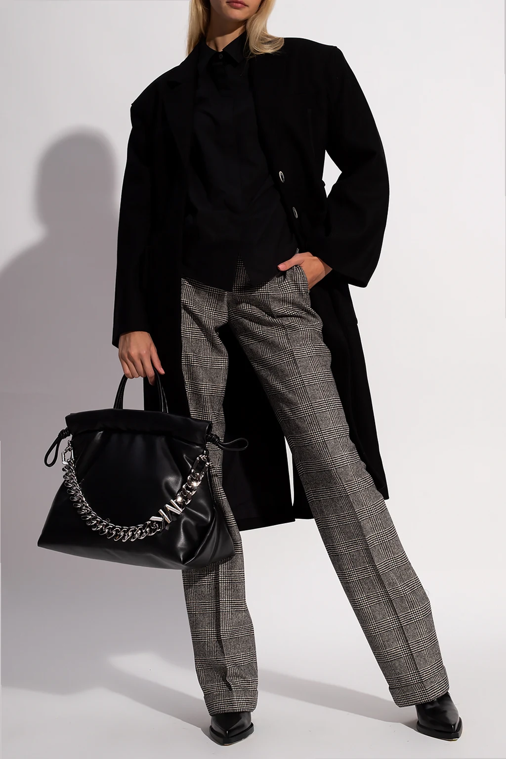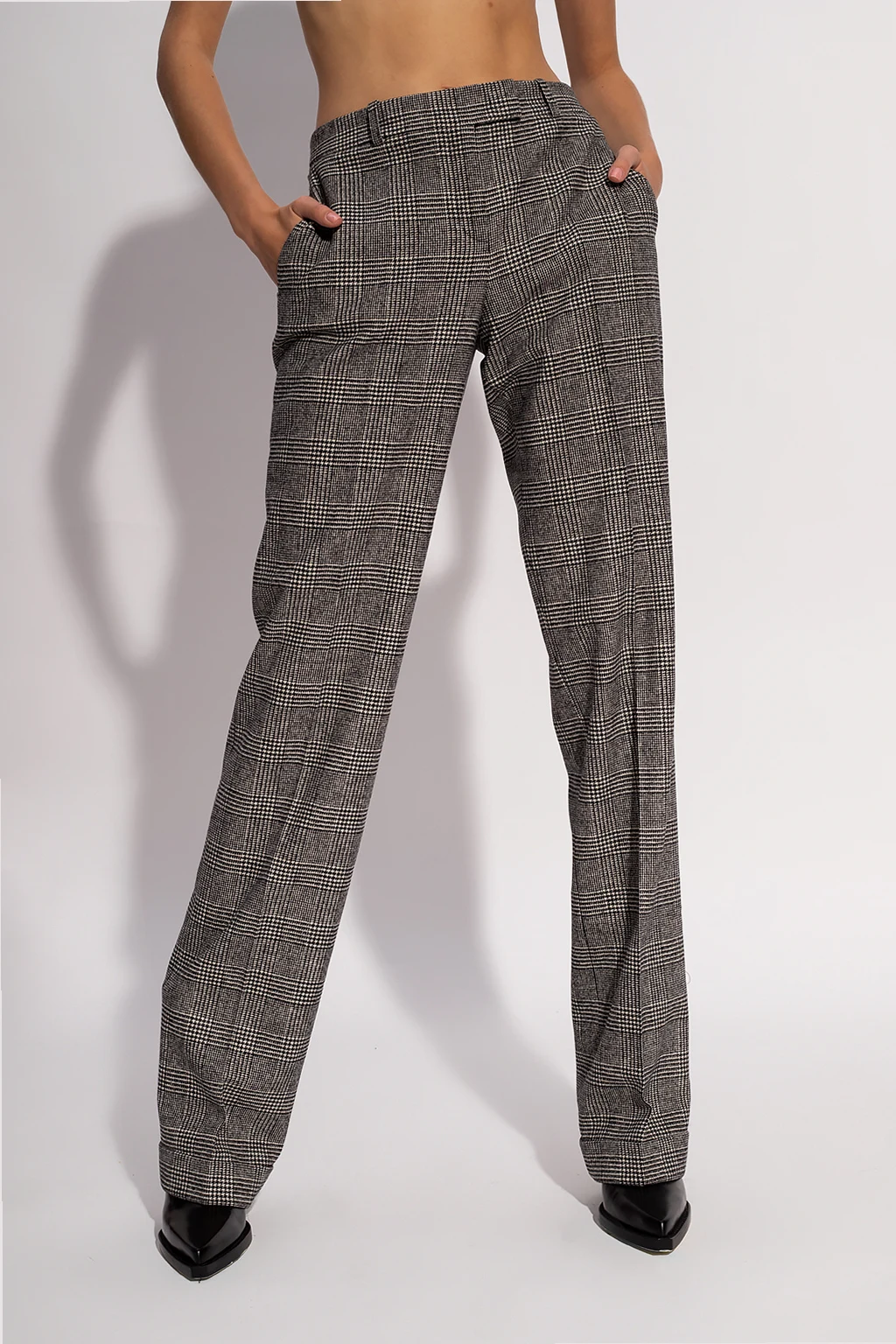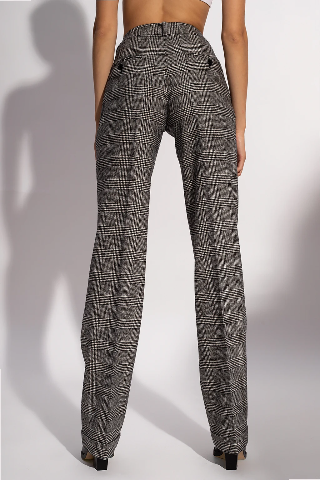 Biało-czarne, wełniane spodnie w kant Michael Kors. Zapinane na zamek, zaczepy oraz guzik. Ozdobione wzorem w kratę. Cztery kieszenie: dwie wsuwane oraz dwie zapinane na guzik. Długie nogawki, lekko zwężane ku dołowi.