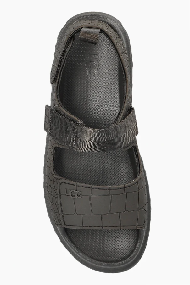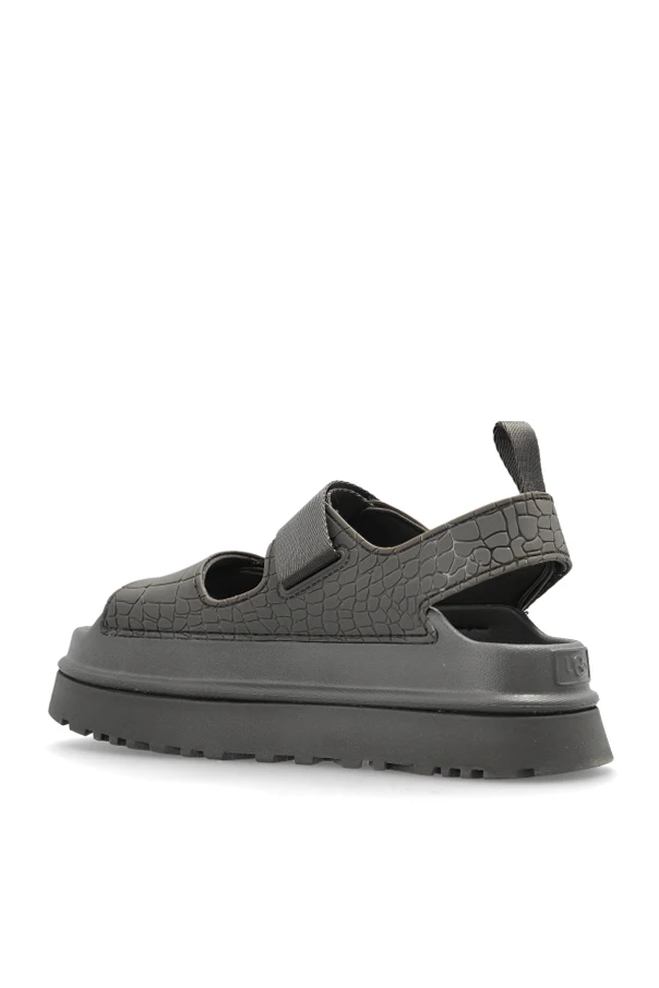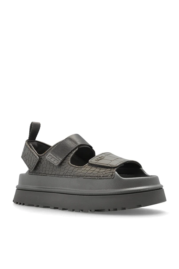 Sandały ‘GOLDENGLOW EMBOSSED’ marki UGG to kwintesencja nowoczesnego luksusu, harmonijnie łącząca wyraziste wzornictwo z praktycznością. Ich masywna, płaska platforma o charakterystycznie karbowanej podeszwie nadaje sylwetce współczesny, wyrazisty wyraz, podkreślony subtelną szarością.