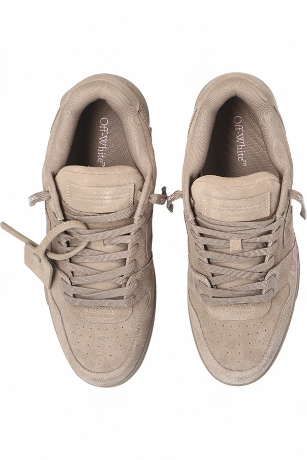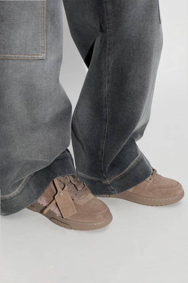 Buty sportowe „Out Of Office For Walking” marki Off-White olśniewają kunsztownym połączeniem klasycznej sylwetki sneakersów z nowatorskim designem. Niska, masywna forma o wyraźnie wyprofilowanej cholewce i subtelnym, zaokrąglonym nosku została wykonana z wyselekcjonowanego, jedwabistego zamszu w odcieniu brązowym (taupe). Cholewka zyskała eleganckie wzmocnienia na pięcie i bokach, a boczny panel zdobi emblematyczny motyw strzały oraz różowa grafika, subtelnie przełamująca klasykę nietuzinkowym akcentem.