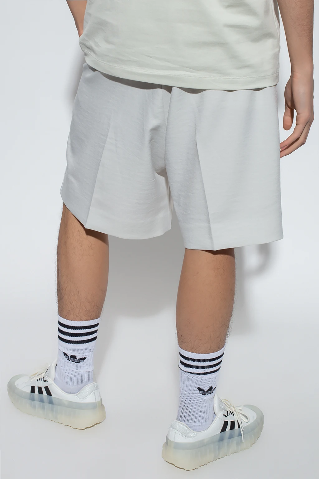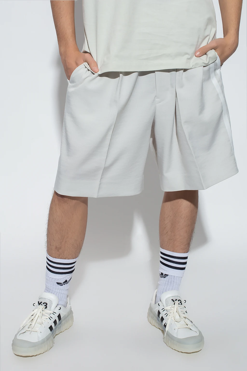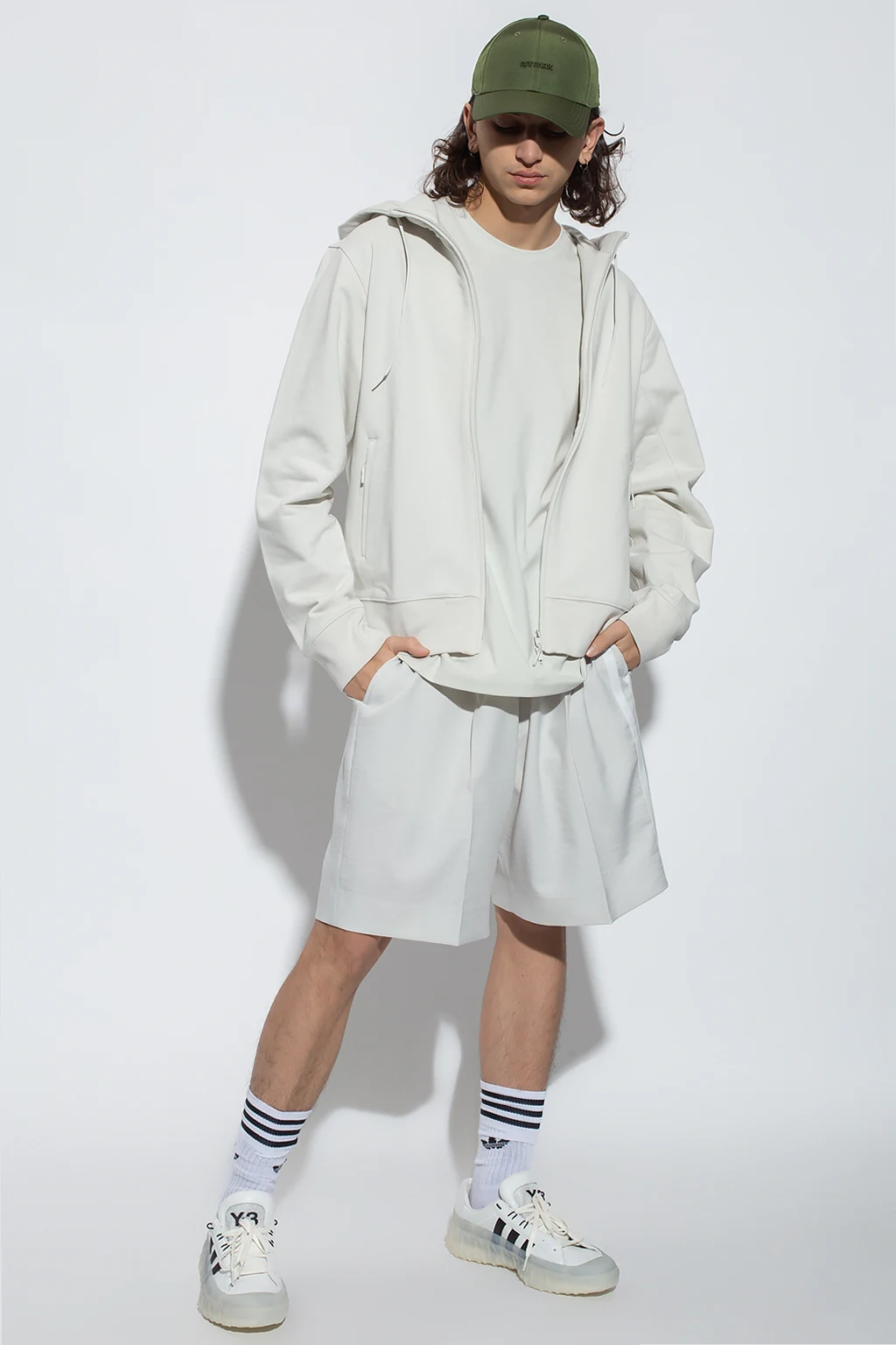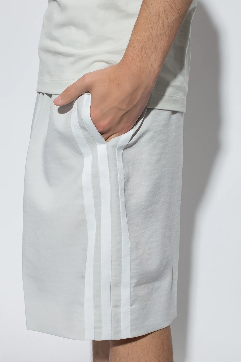 Jasnoszare szorty Y-3 Yohji Yamamoto. W pasie wszyta guma ściągana trokami. Zapinane na zamek oraz guzik. Trzy kieszenie: dwie wsuwane oraz zapinana na zatrzask. Ozdobione nadrukiem z logo oraz charakterystycznymi dla marki pasami w kolorze białym. Krótkie nogawki.