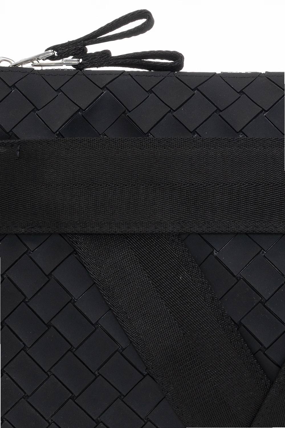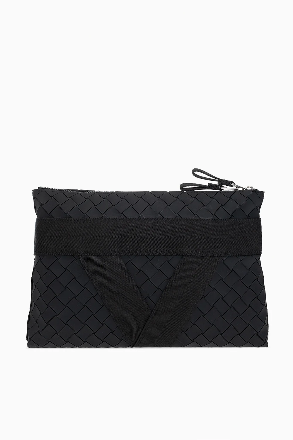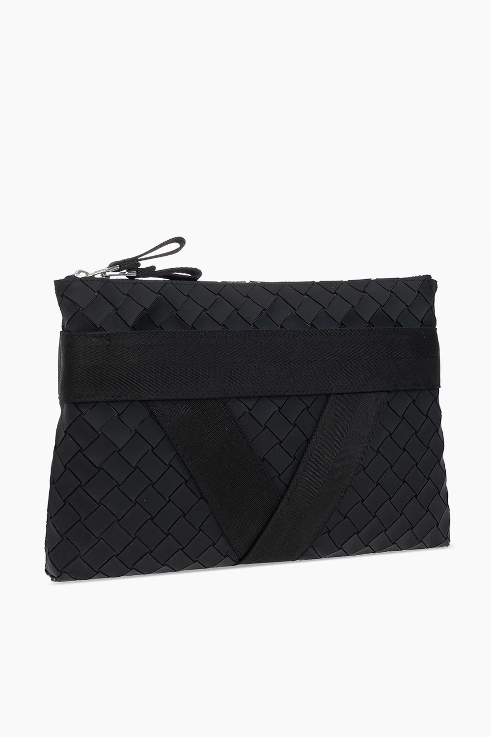Czarna aktówka Bottega Veneta. Zapinana na dwubiegunowy zamek. Ozdobiona charakterystyczną dla marki plecionką. Z przodu kieszeń zapinana na zamek. Wewnątrz komora. Metalowe wykończenie w kolorze srebrnym.