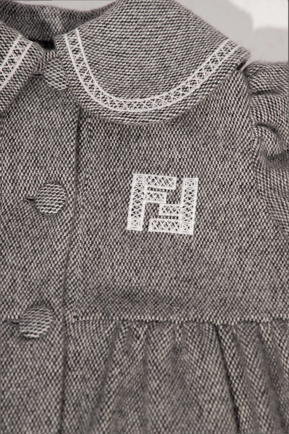 Szaro-biały płaszcz Fendi Kids. Zapinany na guziki. Ozdobiony marszczeniami. Dwie wsuwane kieszenie.