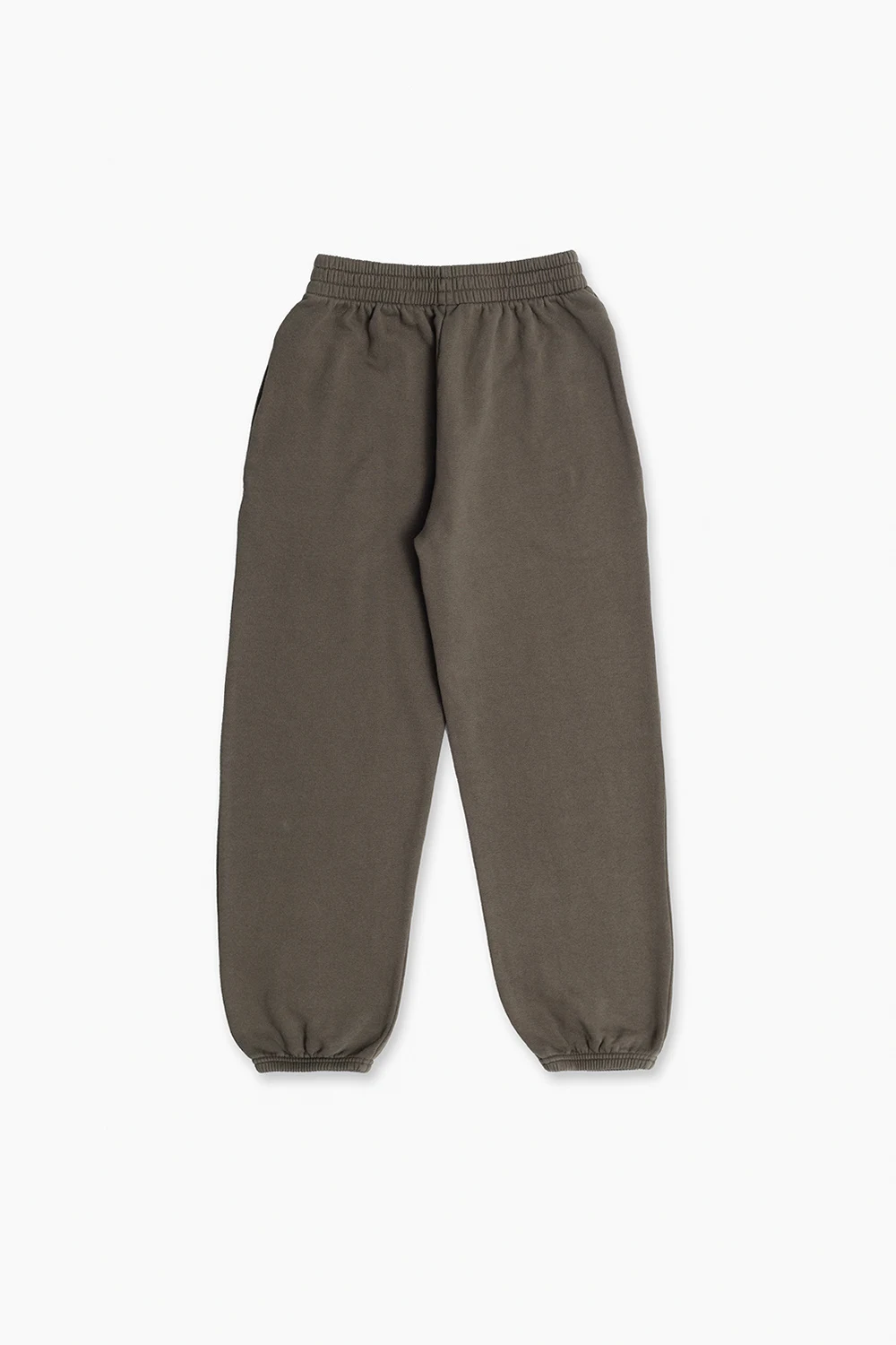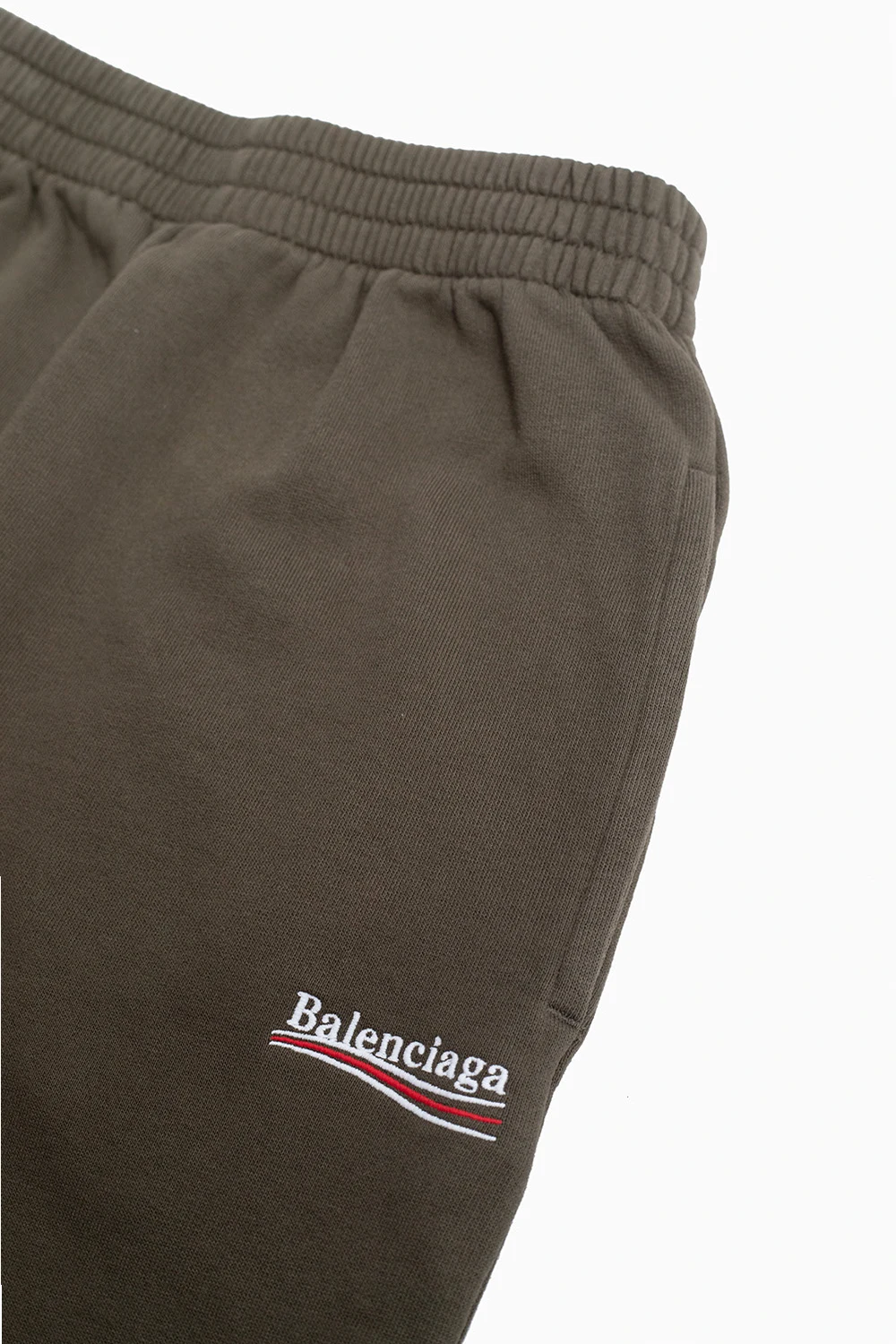 Bawełniane spodnie dresowe w kolorze khaki Balenciaga. W pasie wszyta guma. Ozdobione wyszytym biało-czerwonym logo. Z przodu dwie kieszenie. Nogawki zakończone ściągaczem.