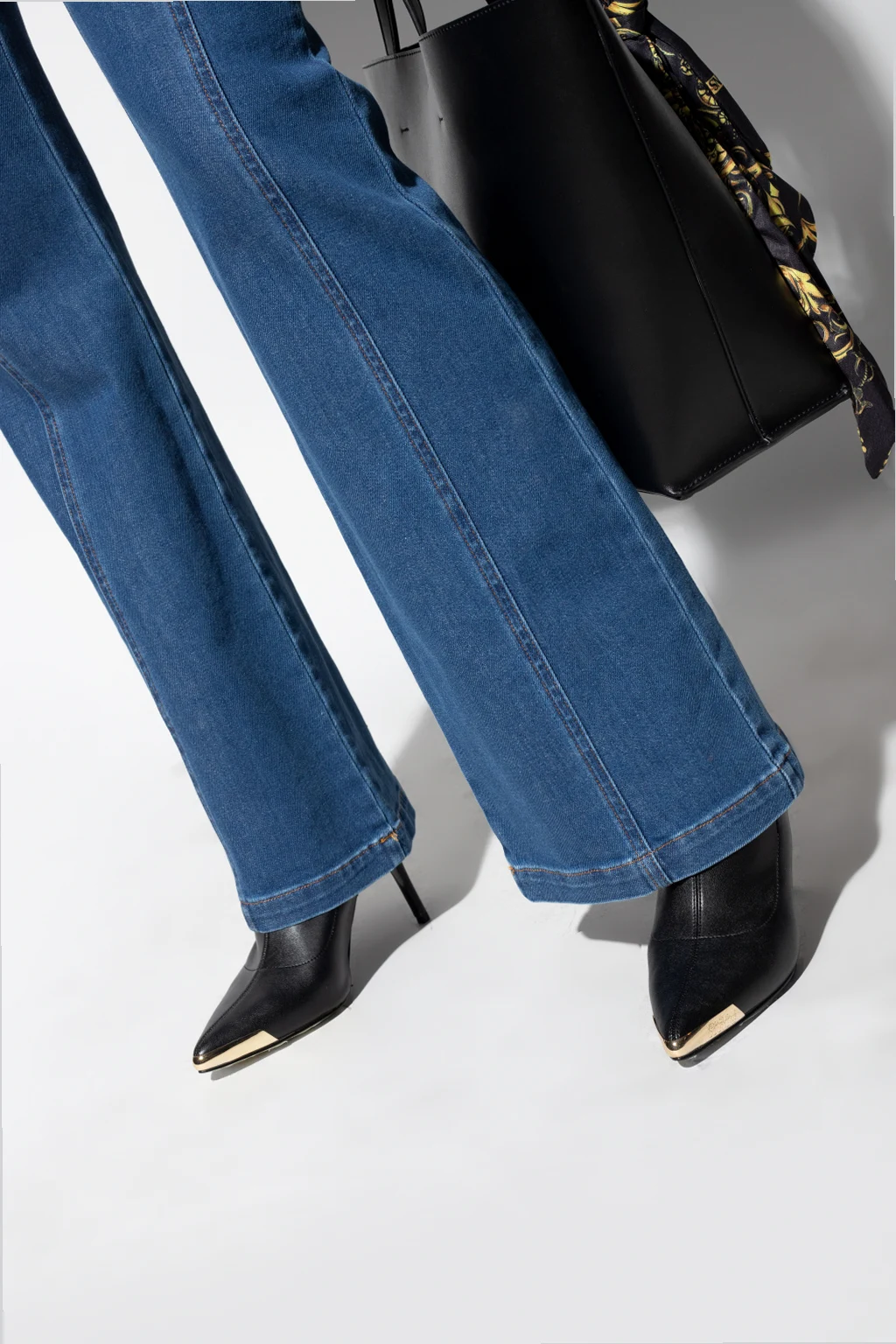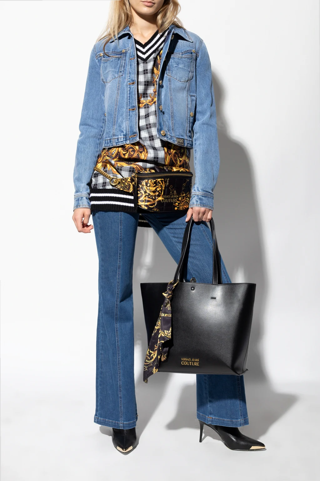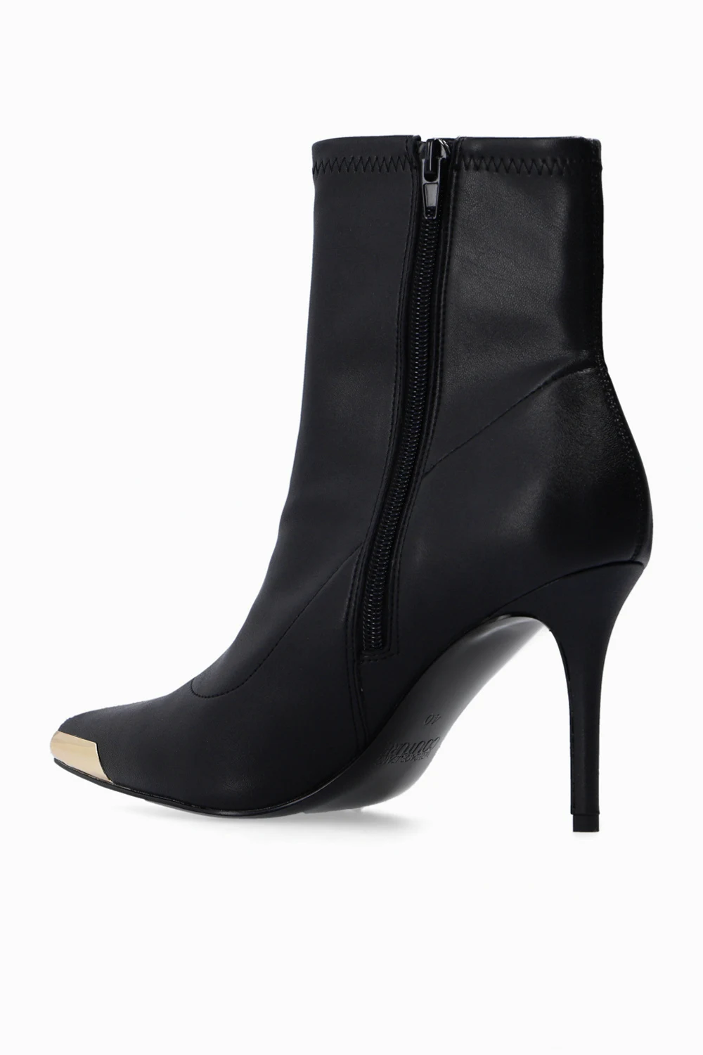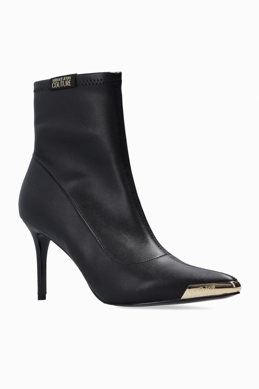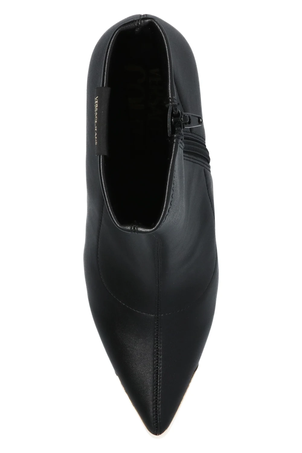 Czarne botki na obcasie, model ‘Scarlett’ Versace Jeans Couture. Zapinane z boku na zamek. Nosek w szpic z dekoracyjnym wykończeniem w kolorze złotym z wytłoczonym logo. Czarna, gumowa podeszwa.