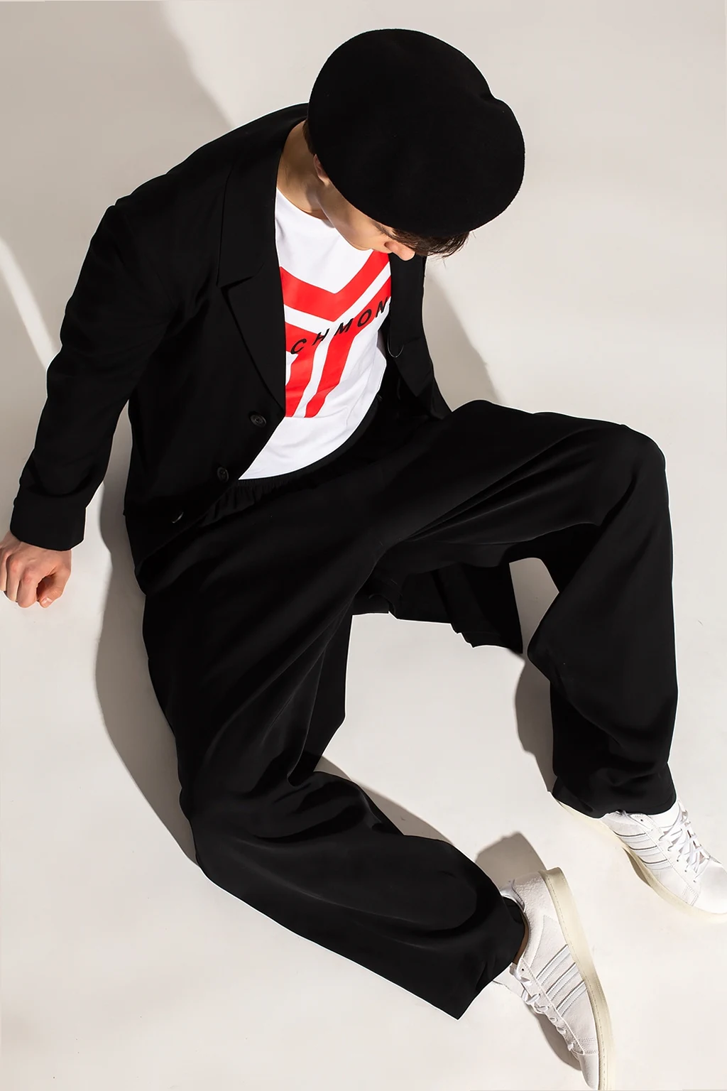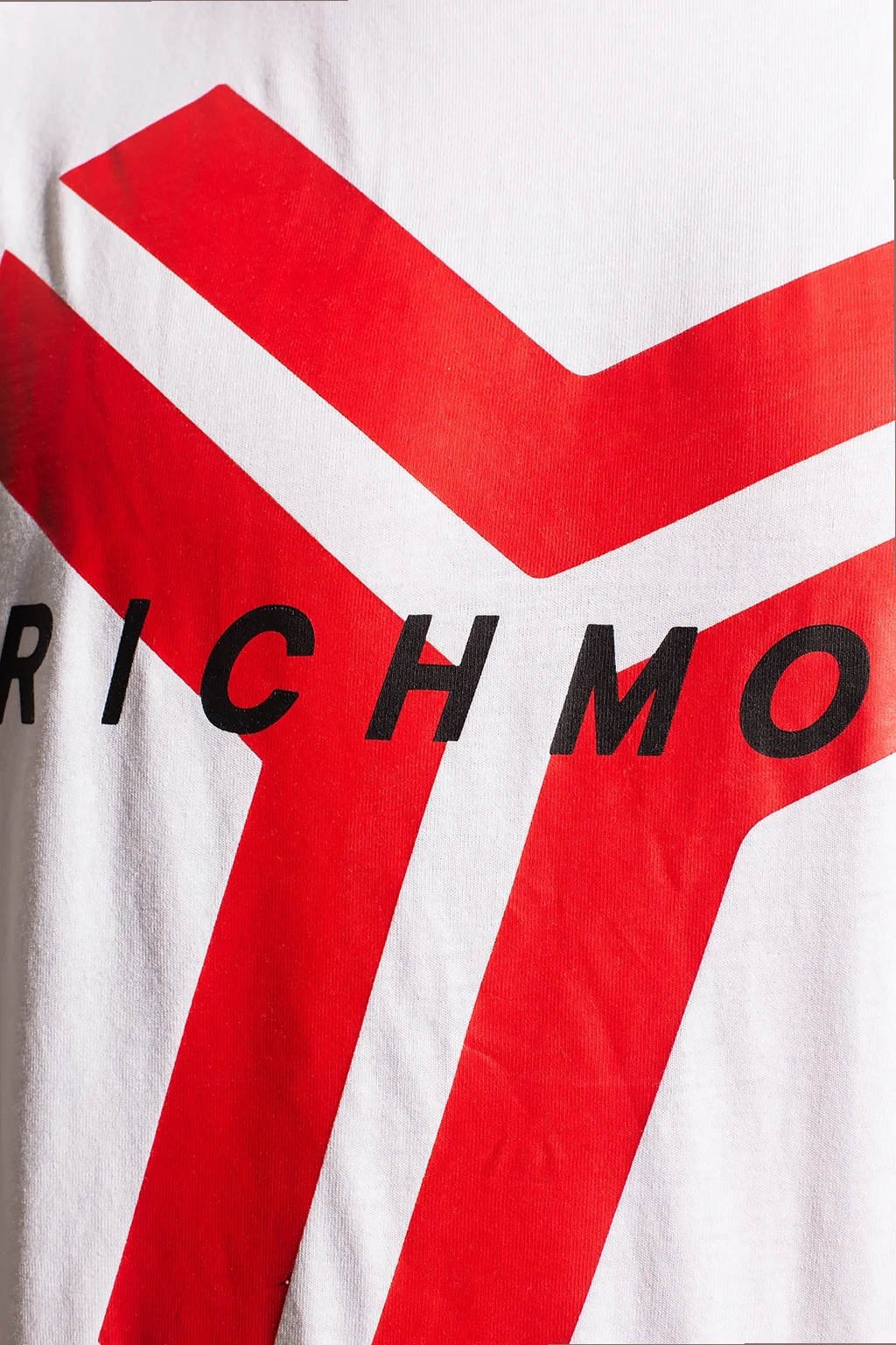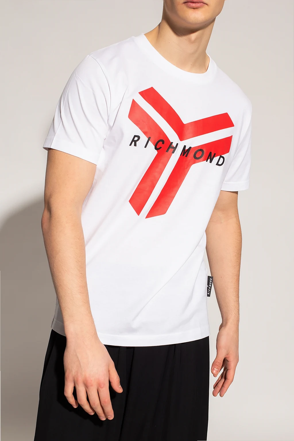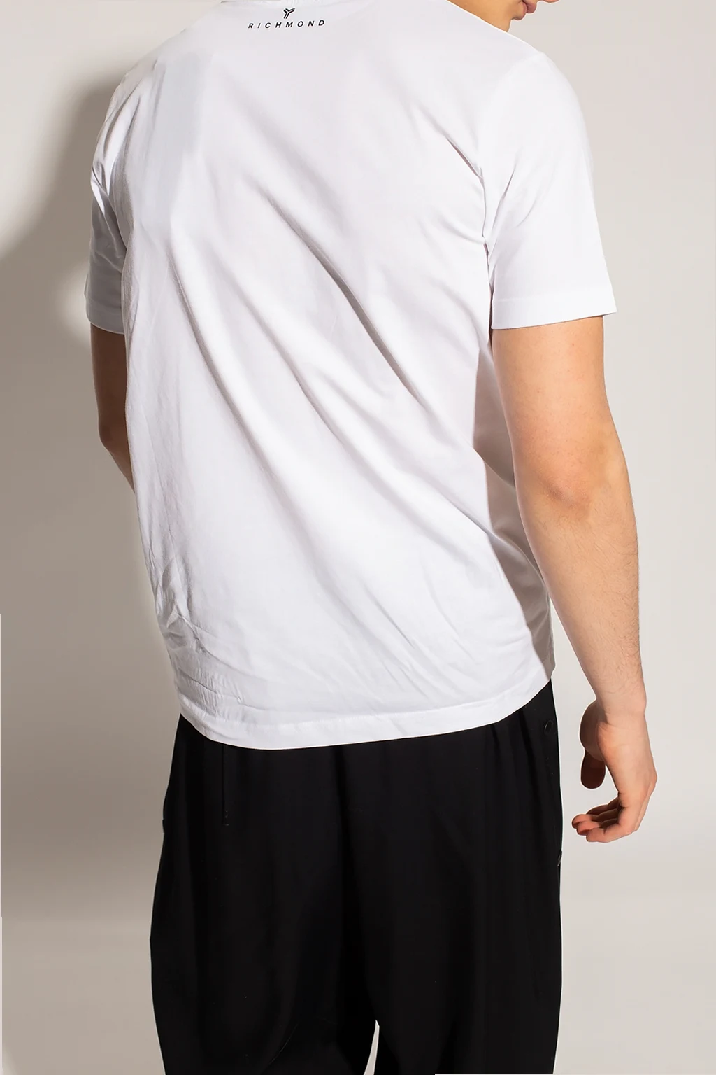 Biały t-shirt John Richmond. Wykonany z bawełny. Ozdobiony nadrukowanym wzorem z logo w kolorze czarno-czerwonym. Okrągły dekolt wykończony ściągaczem. Krótki rękaw.