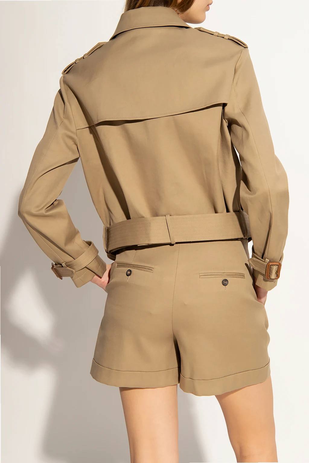 Beżowo-zielona dwurzędowa kurtka Michael Kors. Wykonana z bawełny. Zapinana na guziki. Z przodu dwie wsuwane kieszenie. Na ramionach i rękawach pagony. Dół wiązany paskiem. Warstwa wewnętrzna wykonana z jedwabiu.