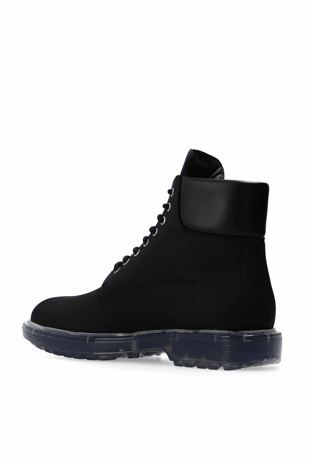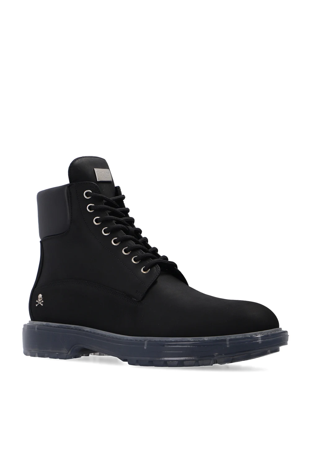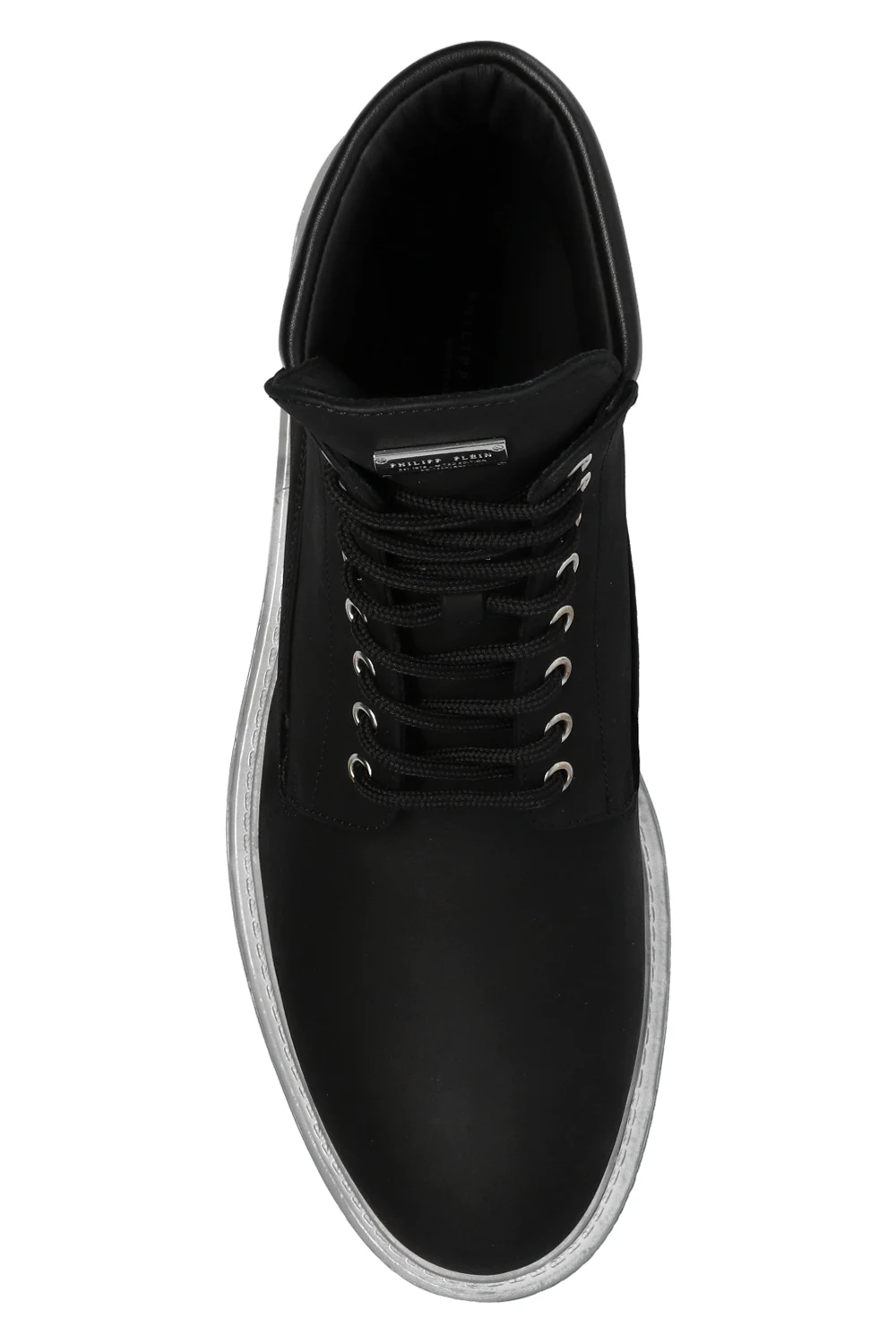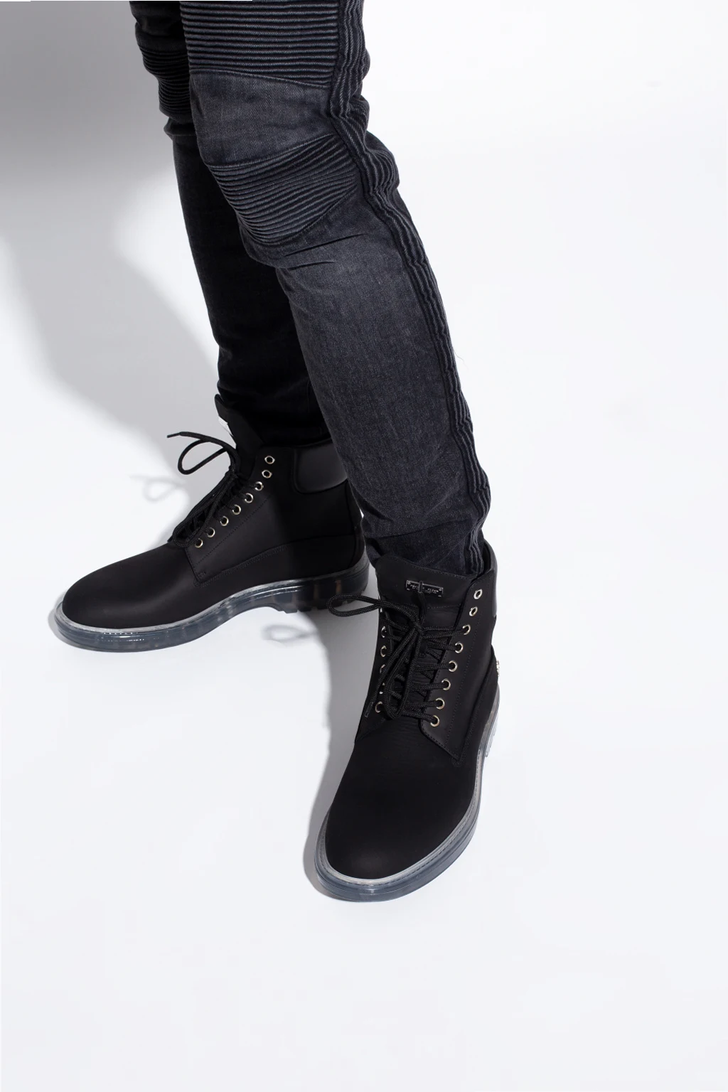 Czarne, sznurowane trapery Philipp Plein. Wykonane z nubuku. Na języku metalowa aplikacja z logo w kolorze srebrnym. Transparentna, gumowa podeszwa.