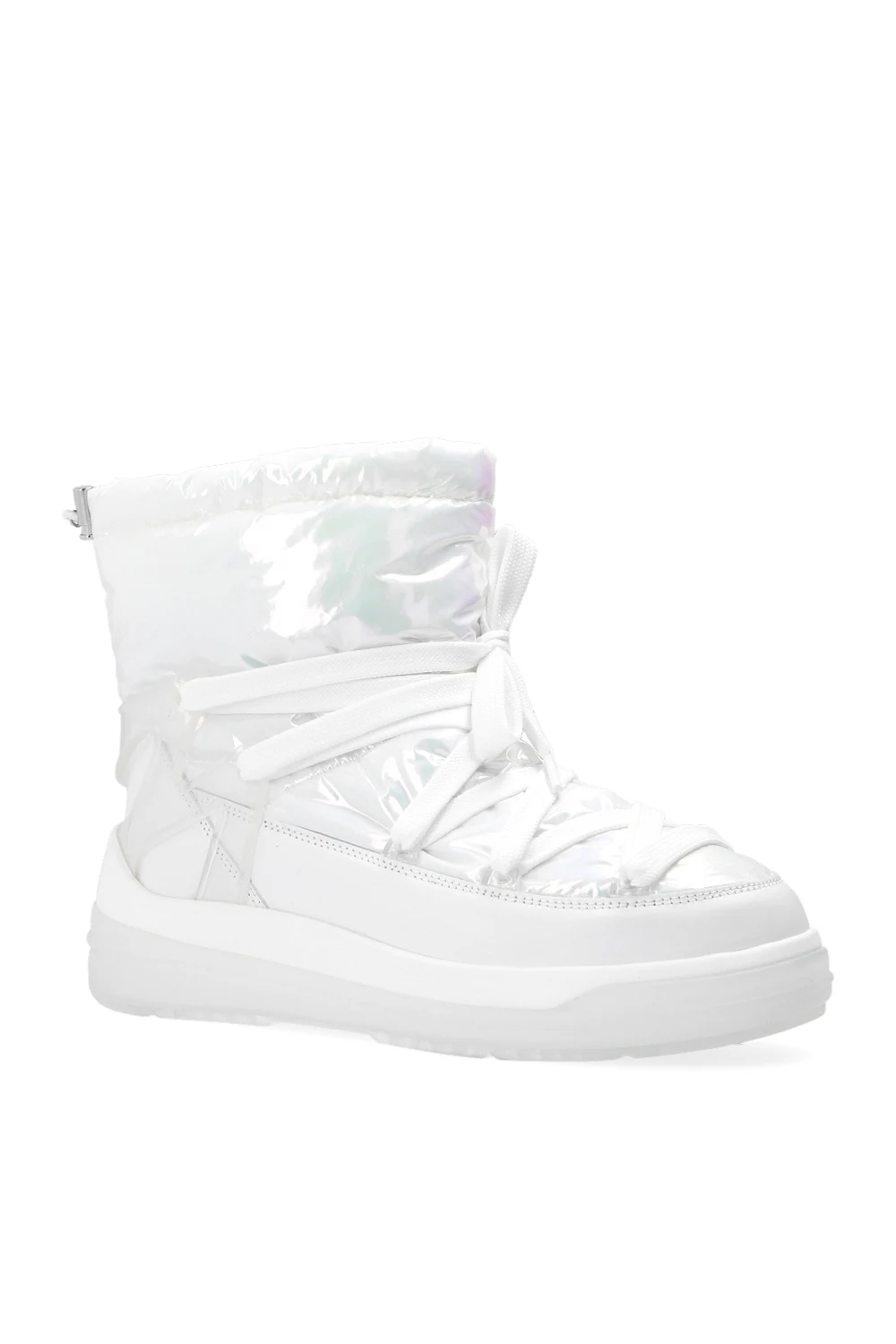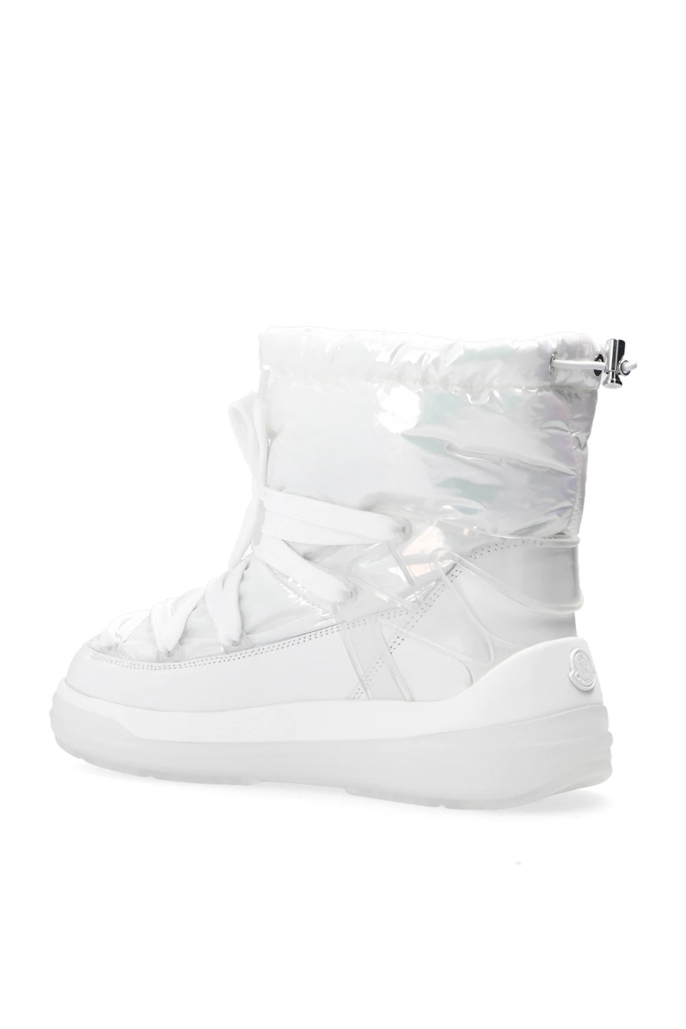 Białe, sznurowane śniegowce, model ‘Insolux’ Moncler. Ozdobione połyskującym materiałem. Ściągane trokami. Biała, gumowa podeszwa.