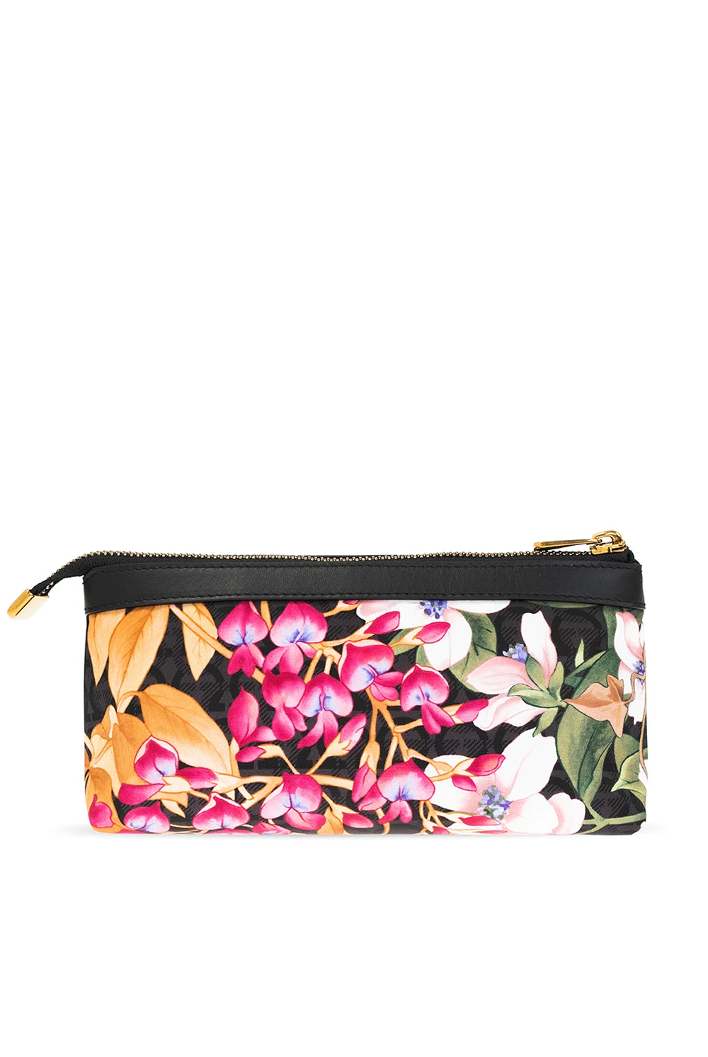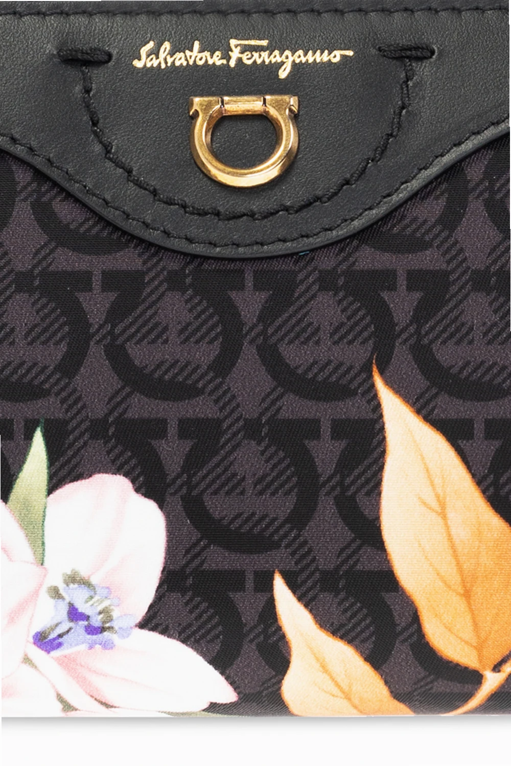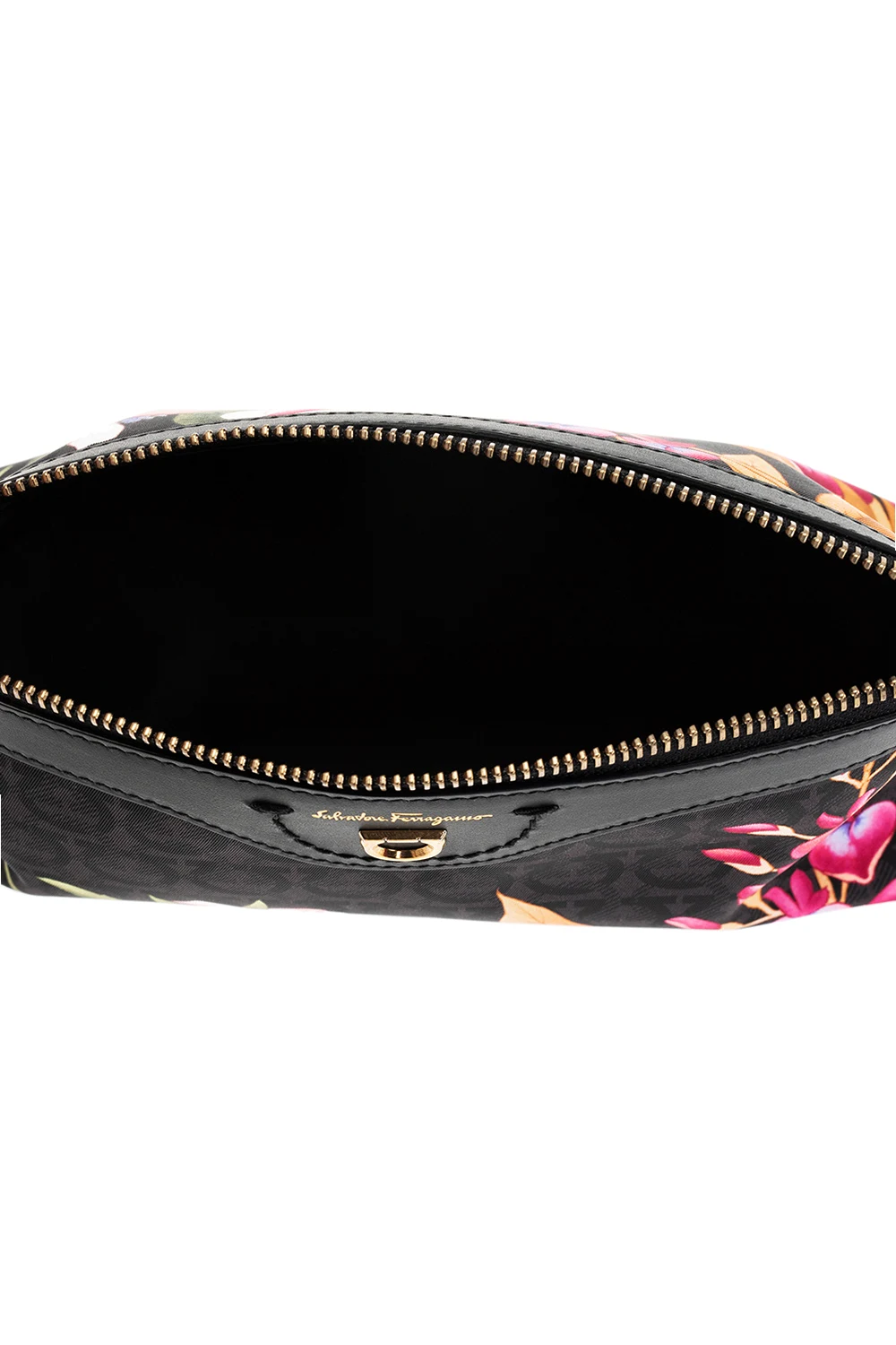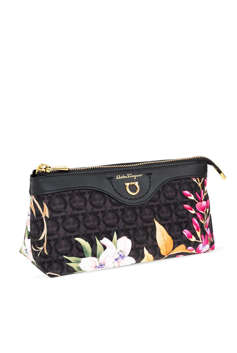 Czarno-szara kosmetyczka Salvatore Ferragamo. Zamykana na zamek. Wykończona skórą. Ozdobiona kolorowym nadrukiem z logo i motywem kwiatowym. Z przodu metalowe logo i wytłoczone logo w kolorze złotym. Wewnątrz komora. Metalowe elementy w kolorze złotym.