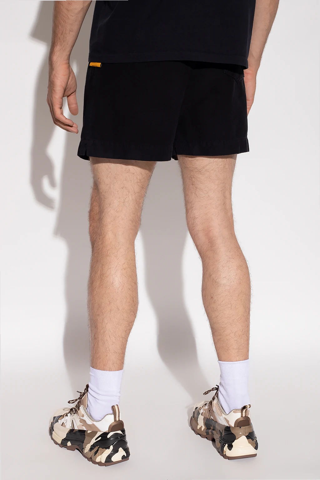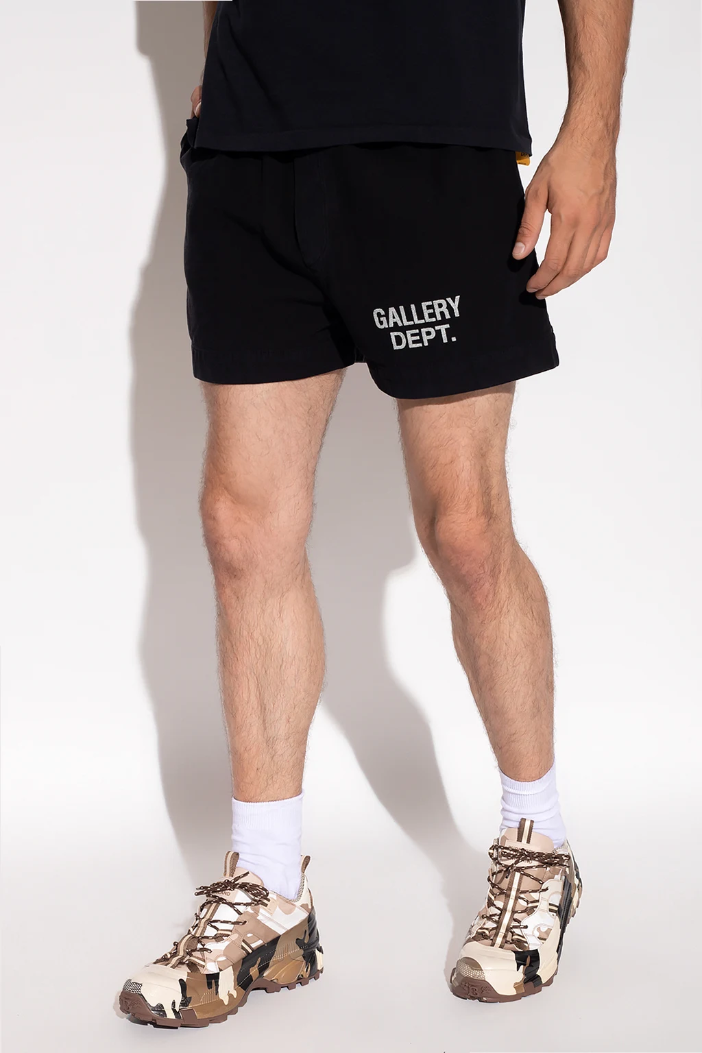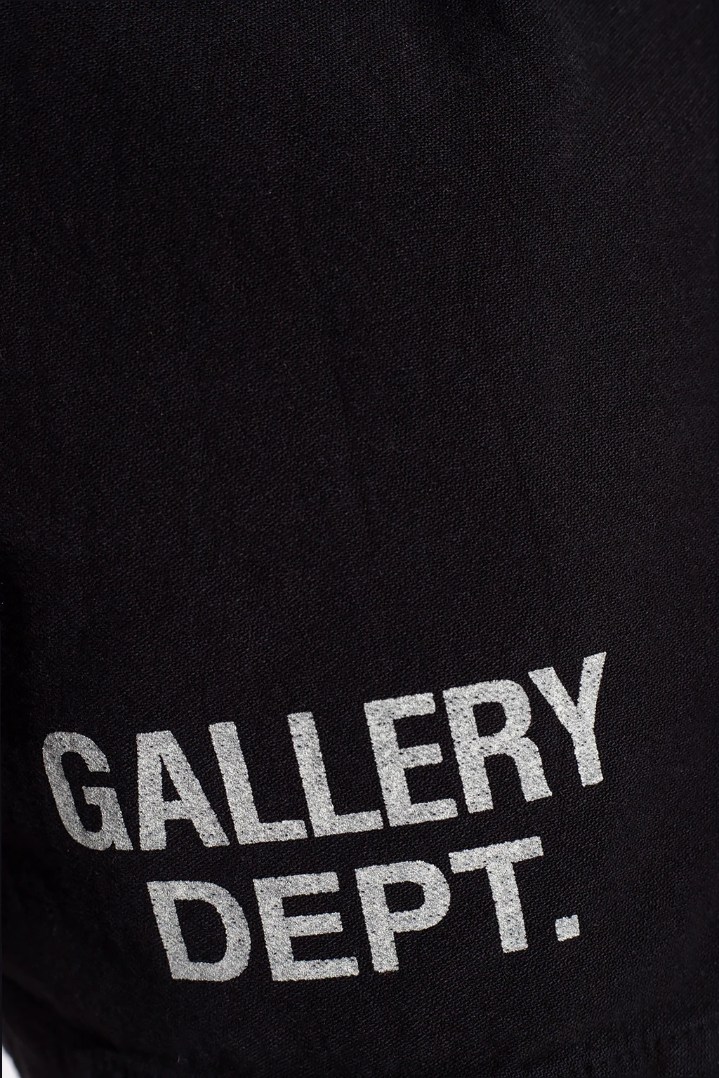 Czarne szorty GALLERY DEPT. Wykonane z bawełny. W pasie wszyta guma ściągana trokami. Ozdobione białym nadrukiem z logo. Trzy wsuwane kieszenie.