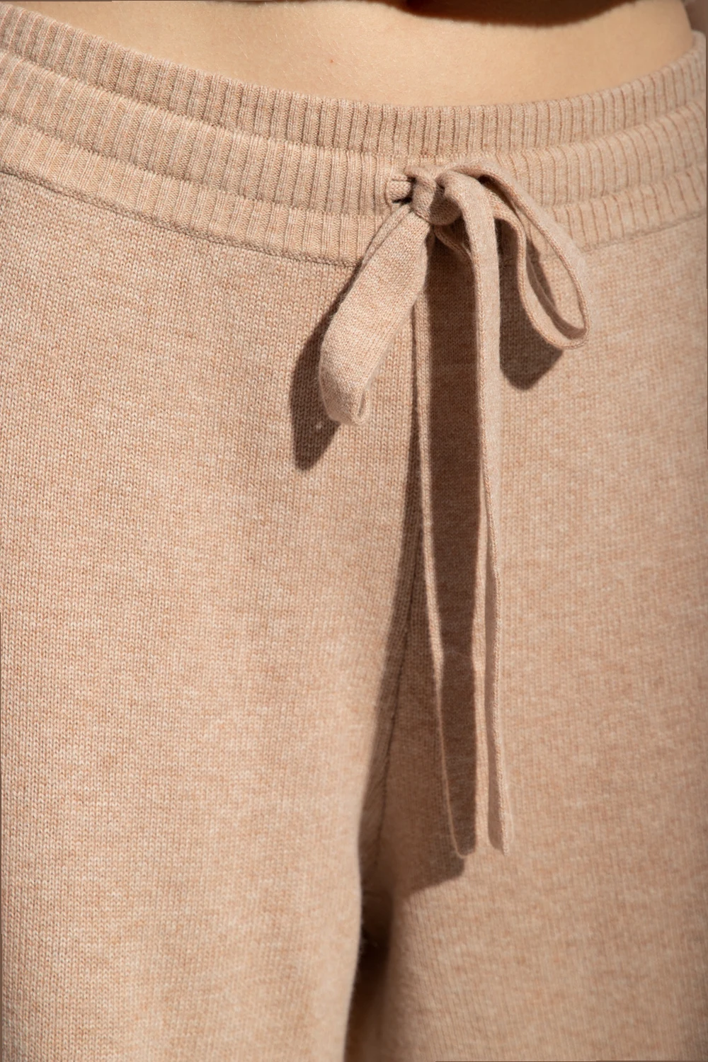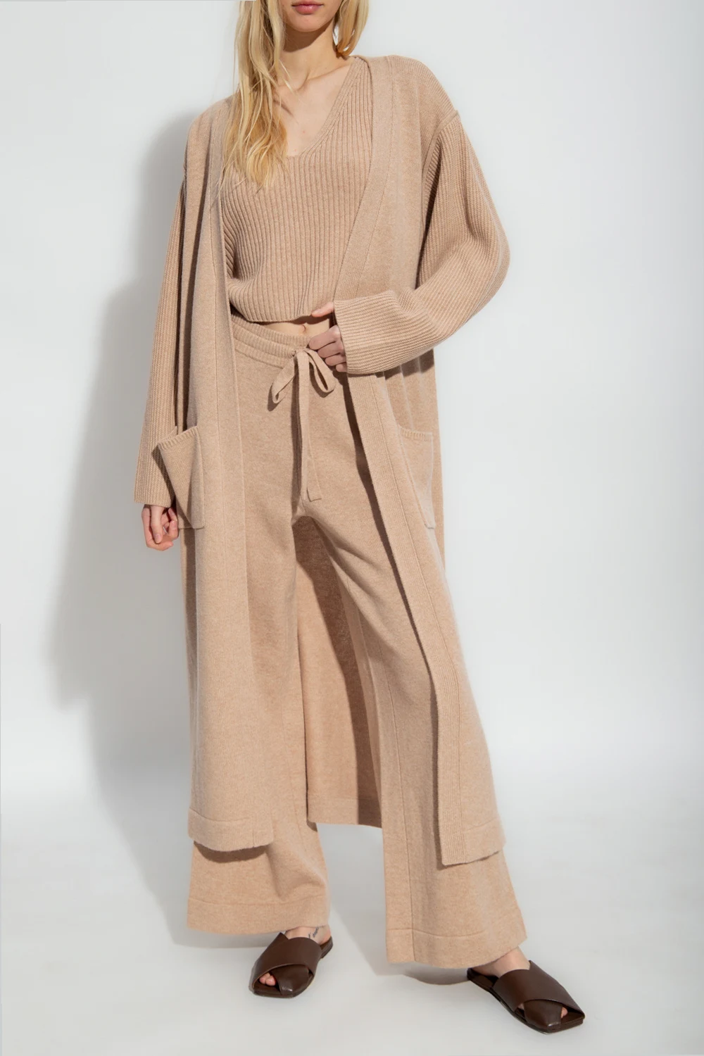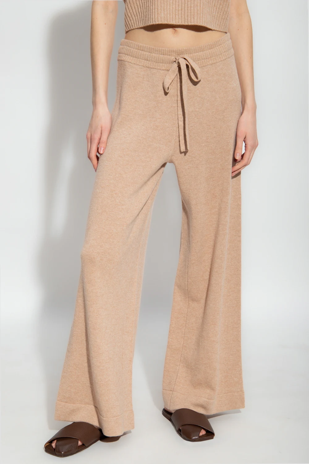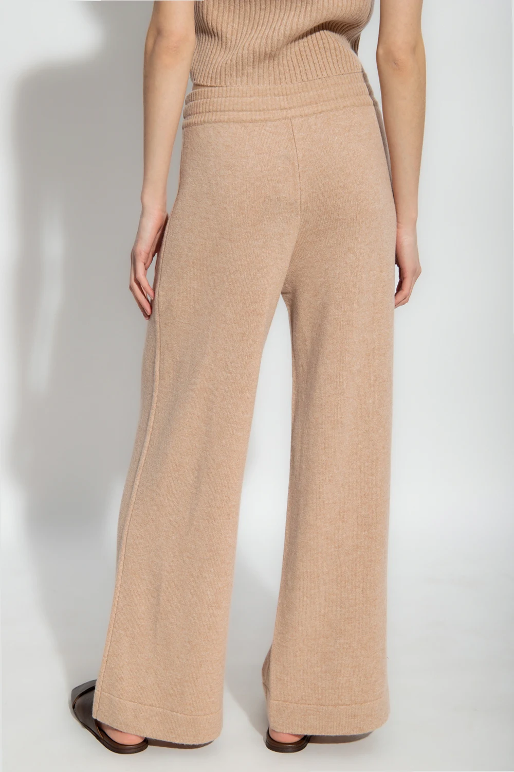 Beżowe spodnie, model ‘Frederique’ Eres. Wykonane z wełny i kaszmiru. W pasie wszyta guma ściągana trokami. Długie, szerokie nogawki.