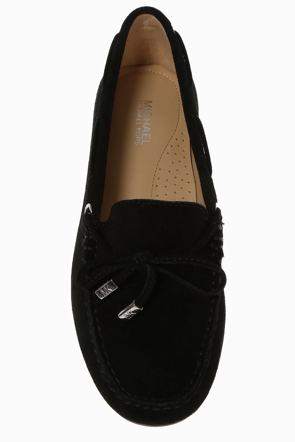Czarne mokasyny, model 'Daisy' Michael Michael Kors. Wykonane z zamszu. Z przodu kokarda z metalowym wykończeniem. Czarna, gumowa podeszwa. Metalowe wykończenie w kolorze srebrnym.