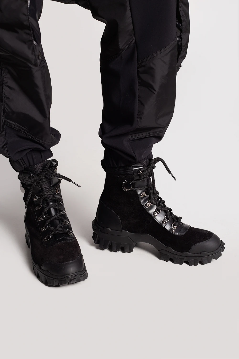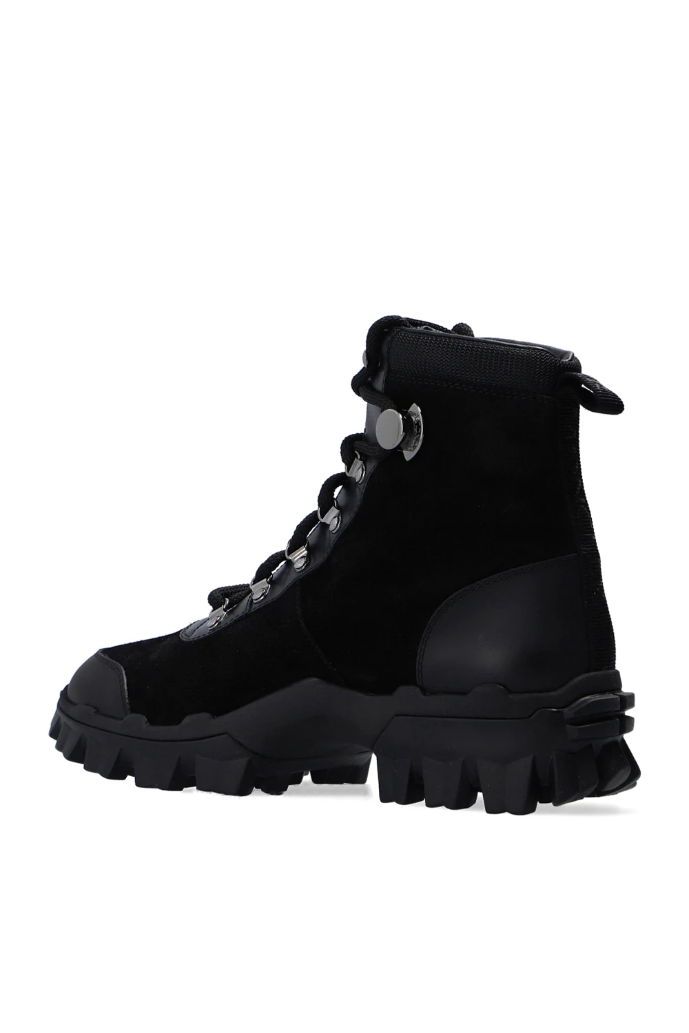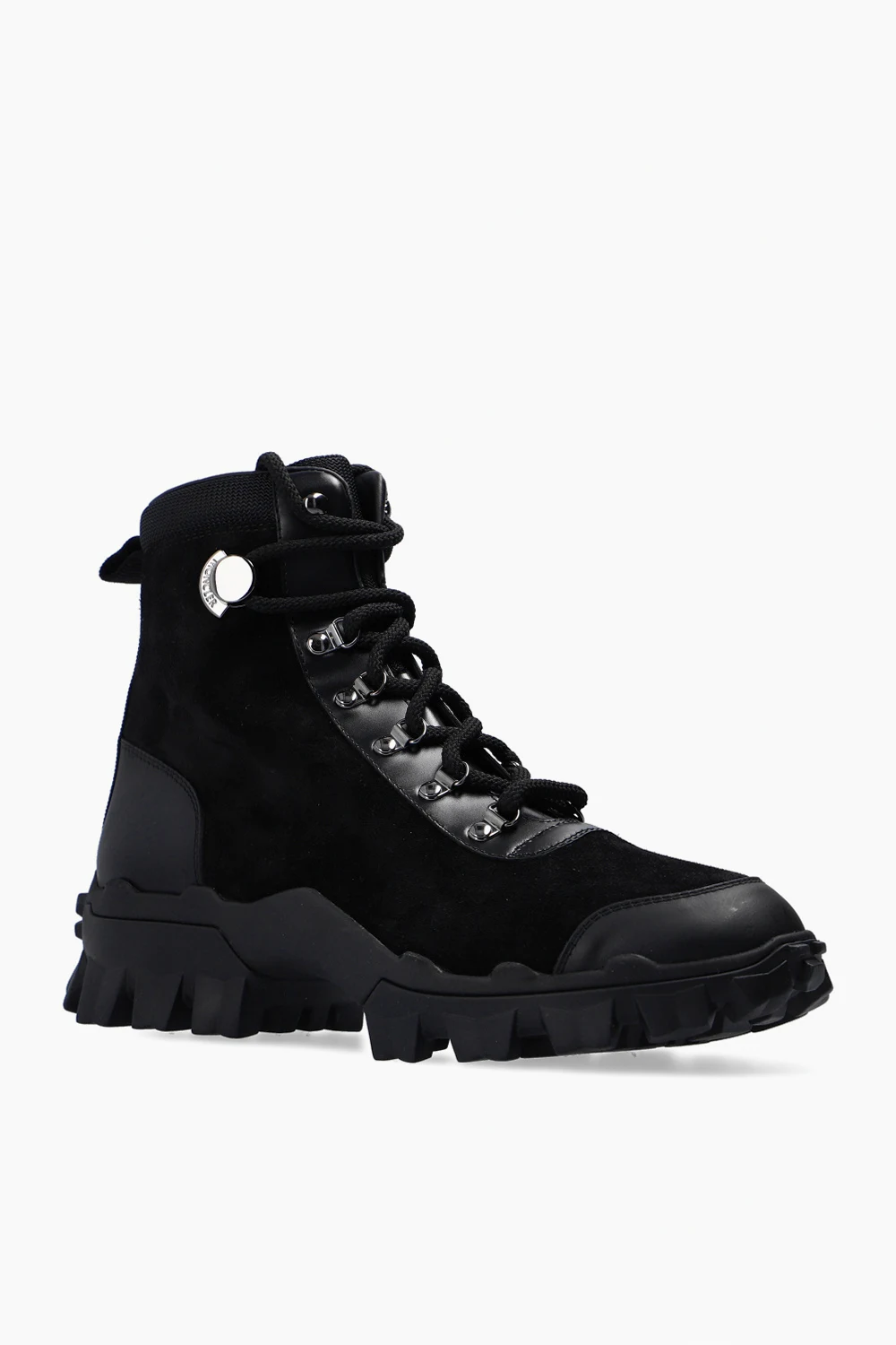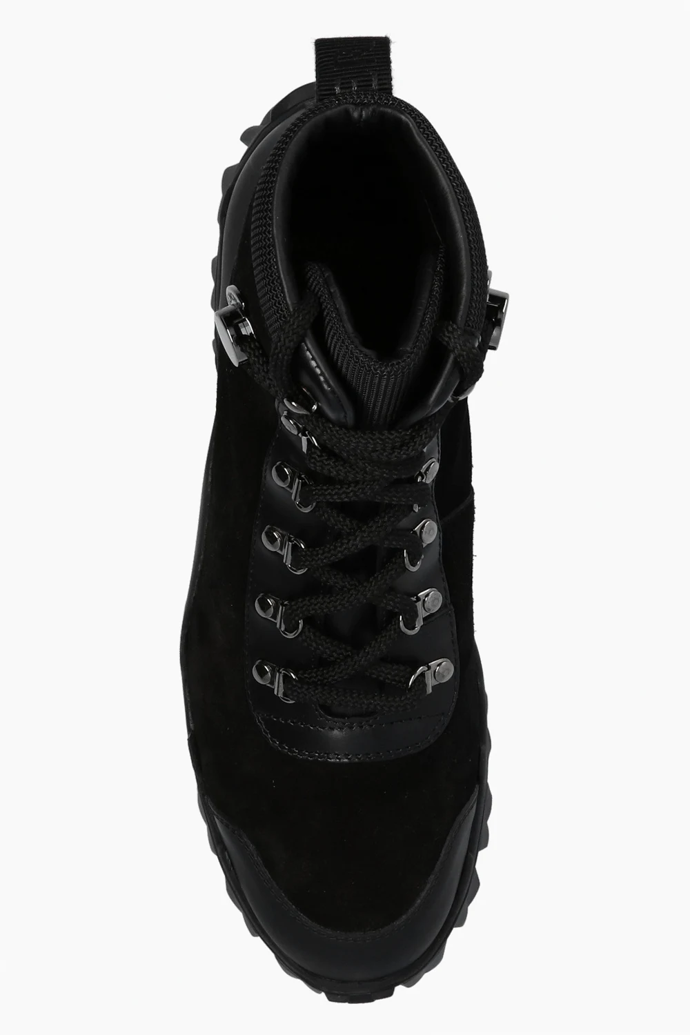 Czarne, sznurowane botki, model ‘Helis’ Moncler. Wykonane ze zamszu. Z tyłu rypsowy pasek z nadrukowanym logo. Czarna, gumowa podeszwa. Metalowe elementy w kolorze srebrnym.