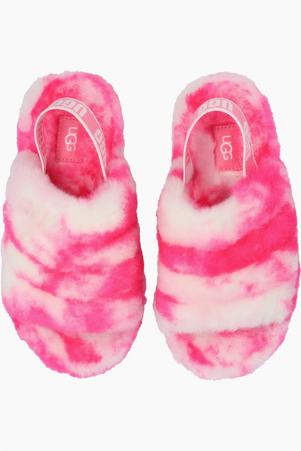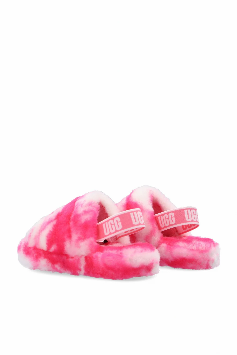 Różowo-białe sandały, model ‘K Fluff’ UGG Kids. Wykonane z owczego futra. Z tyłu elastyczny pasek z logo. Różowa, gumowa podeszwa.