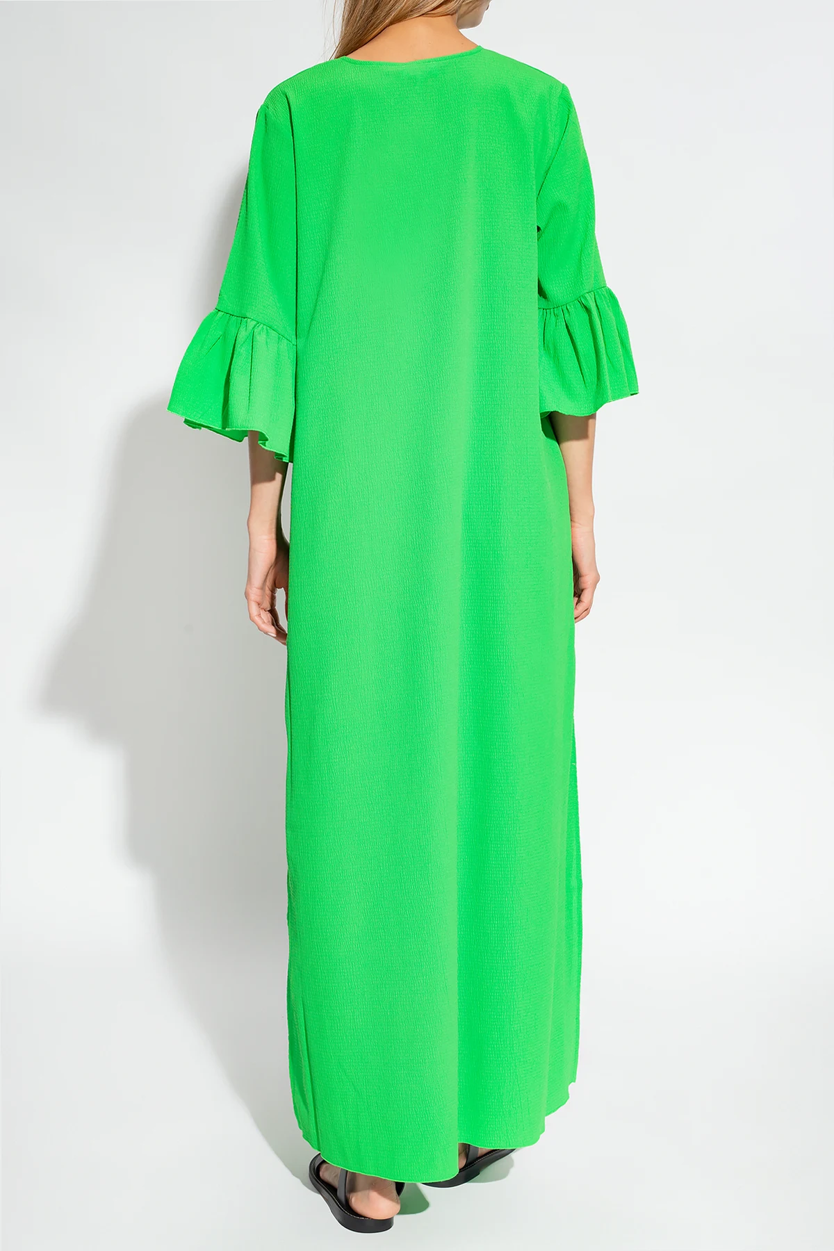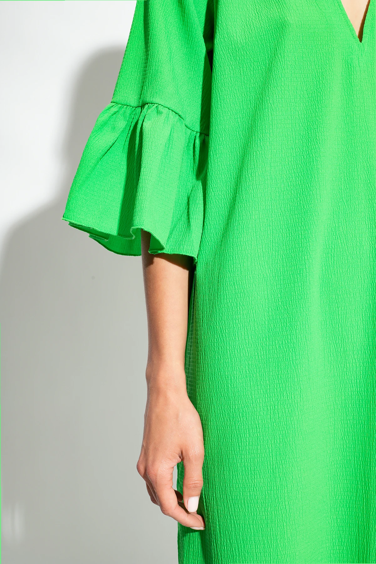Zielona sukienka o luźnym kroju, model ‘Carrie’ Notes Du Nord. Dekolt w serek. Krótkie rękawy zakończone falbaną. Po bokach rozcięcie.