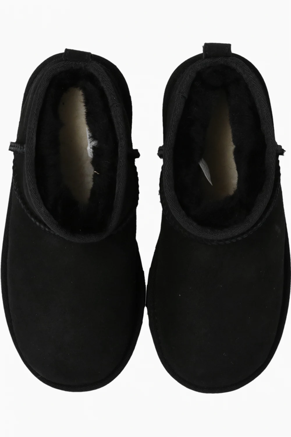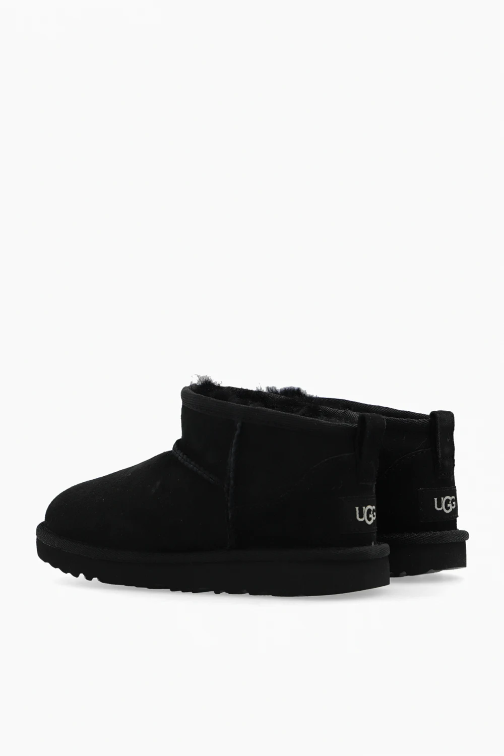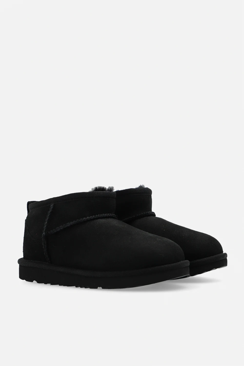 Czarne, wsuwane buty, model ‘Classic Ultra Mini’ UGG Kids. Wykonane z zamszu. Z tyłu naszywka z logo. Amortyzująca piankowa wkładka z wełnianą wyściółką UGGpure™. Czarna podeszwa zewnętrzna Treadlite by UGG™.