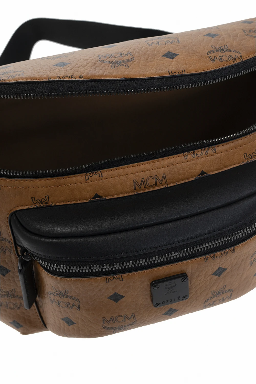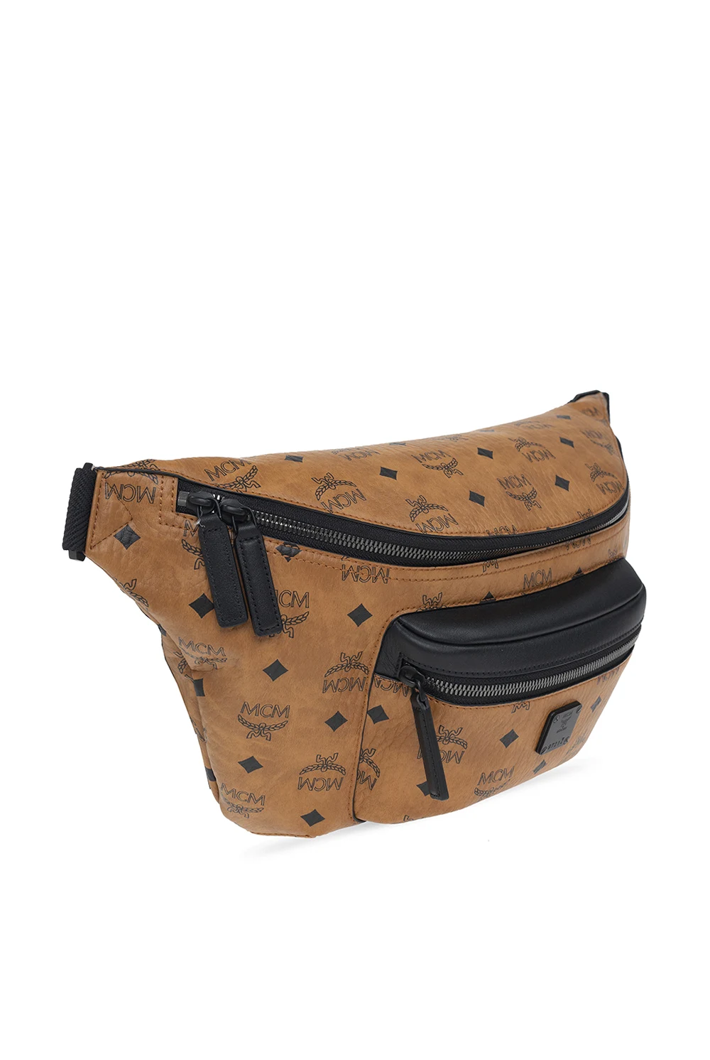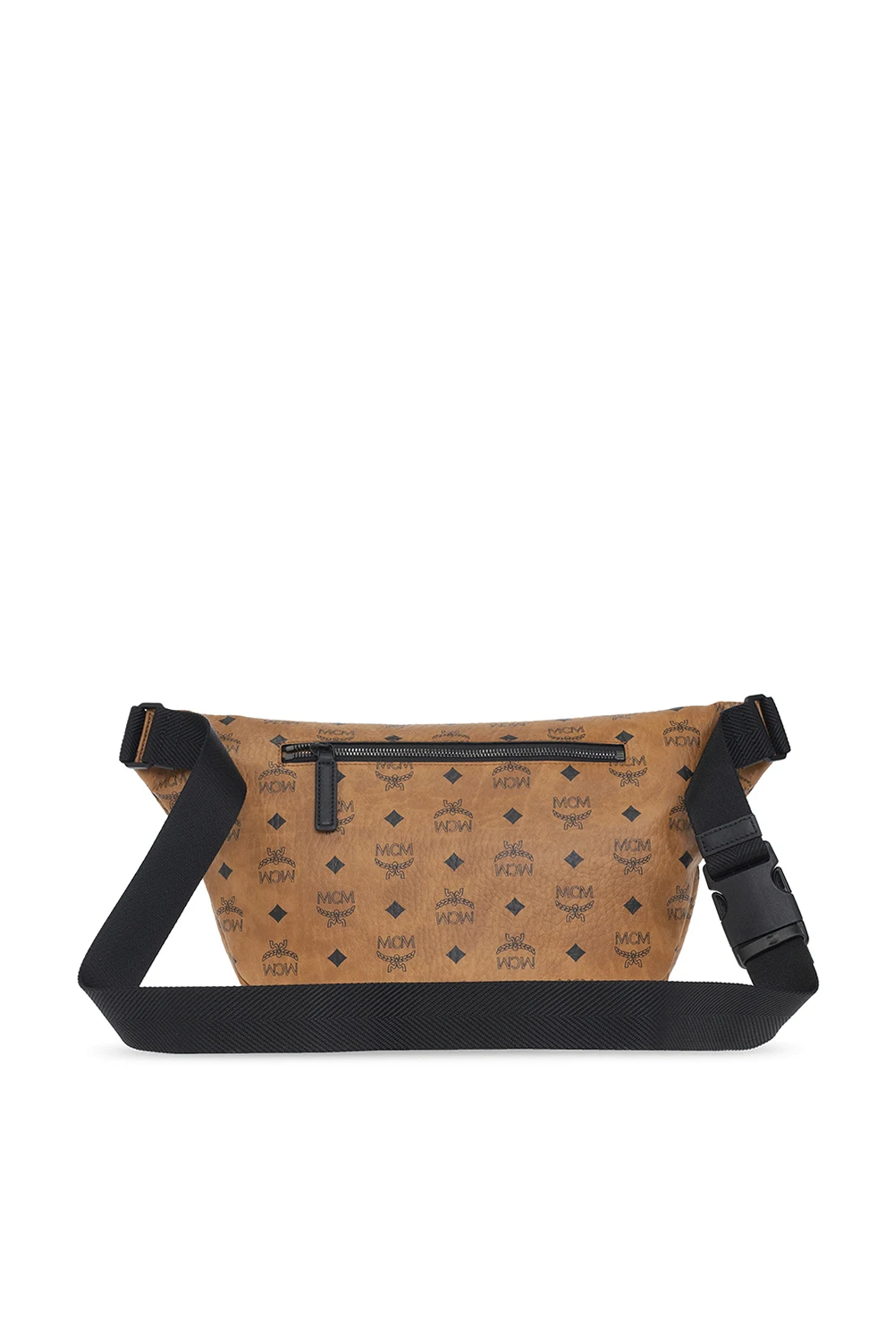 Brązowo-czarna torba na pas MCM. Wykonana z imitacji skóry ozdobionej wzorem 'Visetos' w kolorze czarnym. Zamykana na dwubiegunowy zamek. Z przodu kieszeń na zamek z aplikacją z logo. Z tyłu kieszeń. Pas zamykany na klamrę z możliwością regulacji długości. Wewnątrz komora.