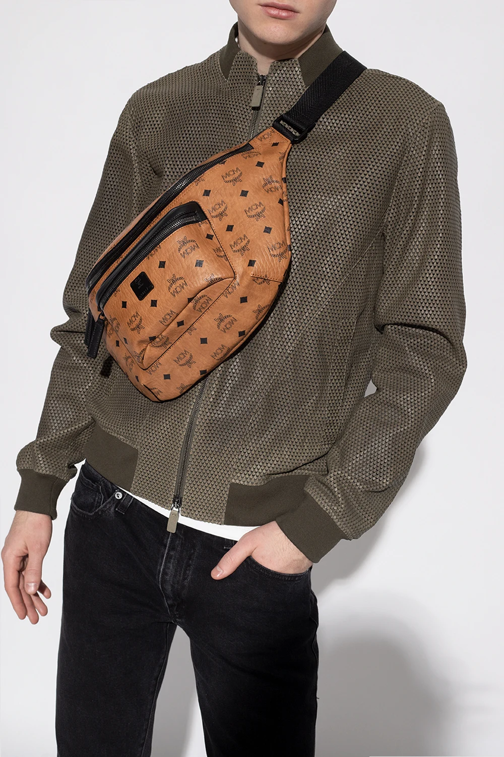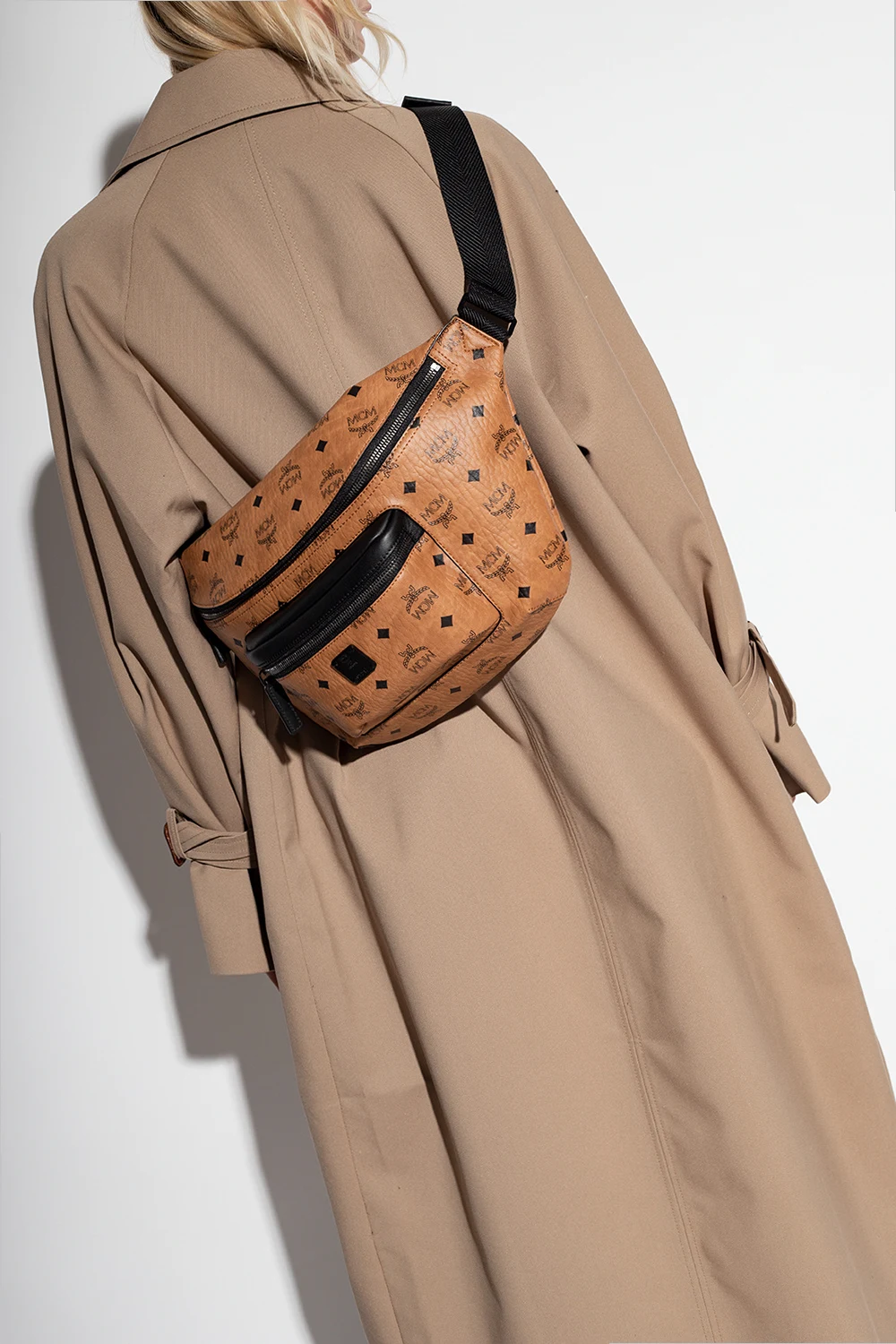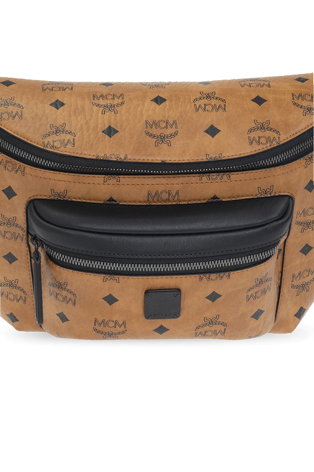 Brązowo-czarna torba na pas MCM. Wykonana z imitacji skóry ozdobionej wzorem 'Visetos' w kolorze czarnym. Zamykana na dwubiegunowy zamek. Z przodu kieszeń na zamek z aplikacją z logo. Z tyłu kieszeń. Pas zamykany na klamrę z możliwością regulacji długości. Wewnątrz komora.